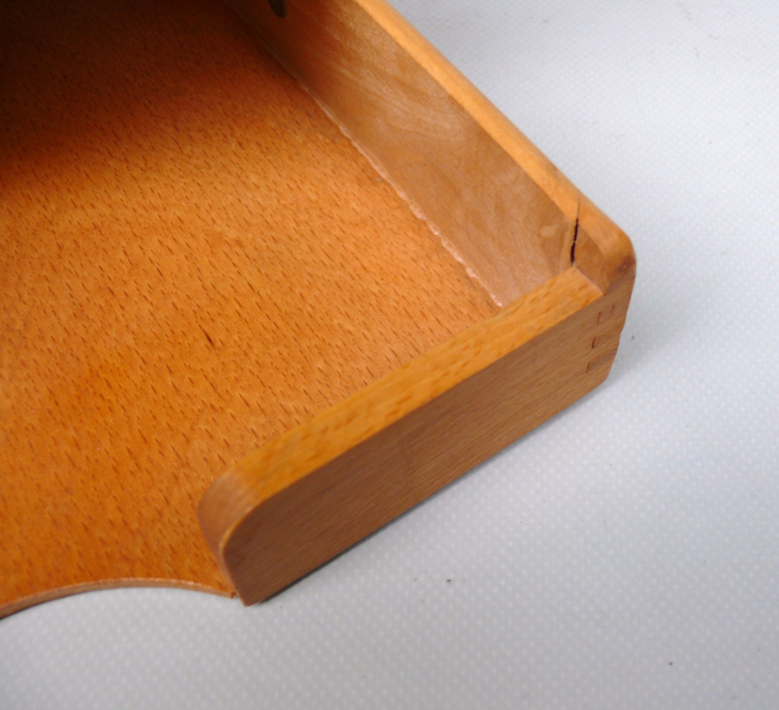 Das Holz der Fächer ist seitlich nachgedunkelt, da der Ablagekasten lange in einer Position stand.