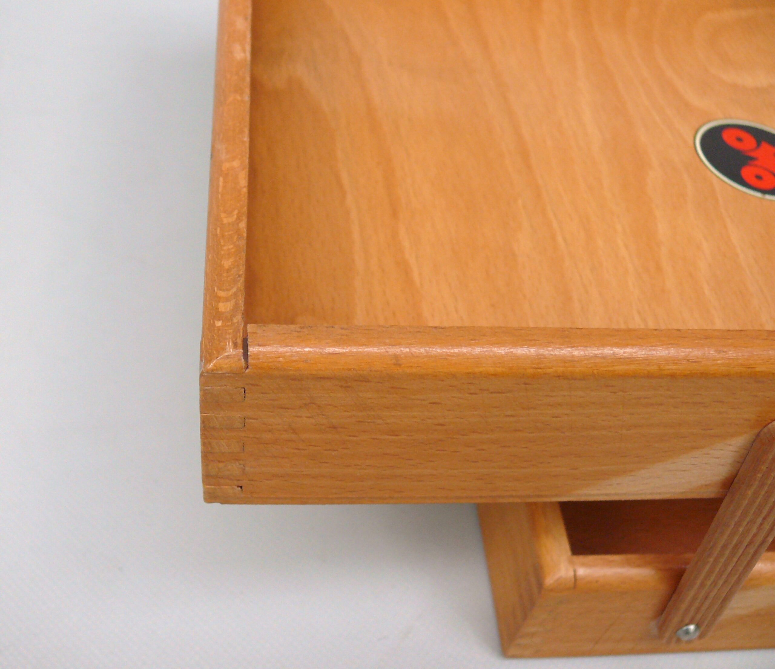 Das Holz der Fächer ist seitlich nachgedunkelt, da der Ablagekasten lange in einer Position stand. Das Holz zeigt leichte Spuren des Gebrauchs (feine Kratzer, leichte Kerben, Farbunterschiede).