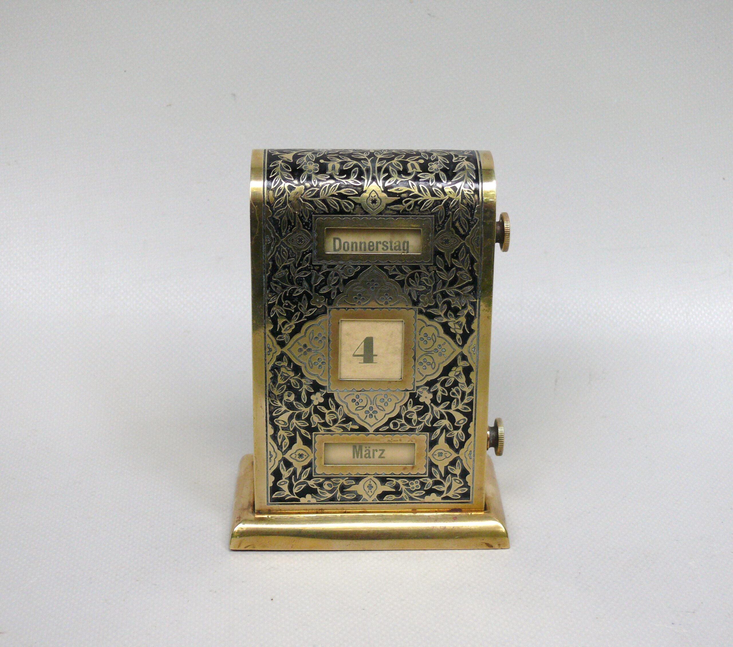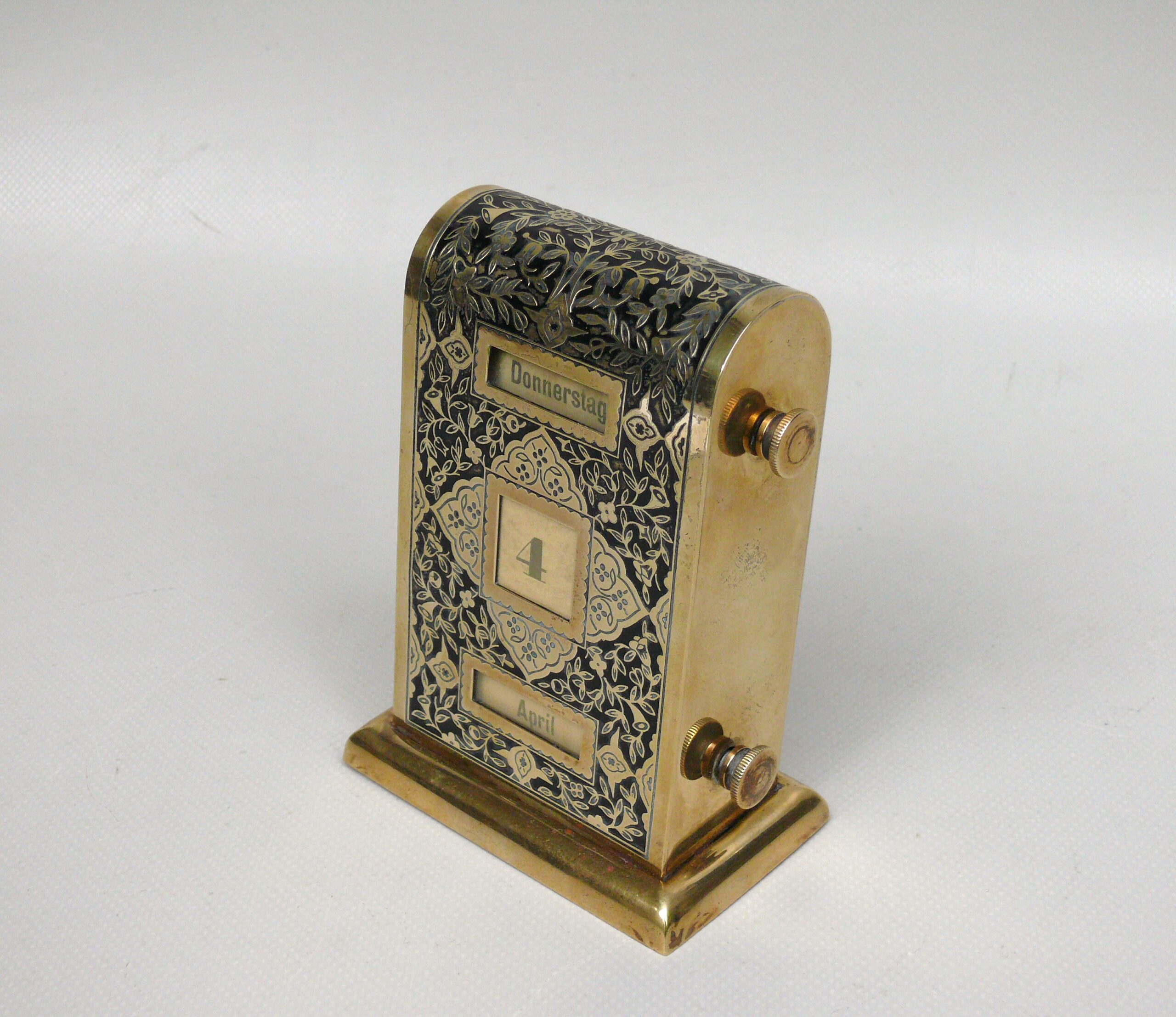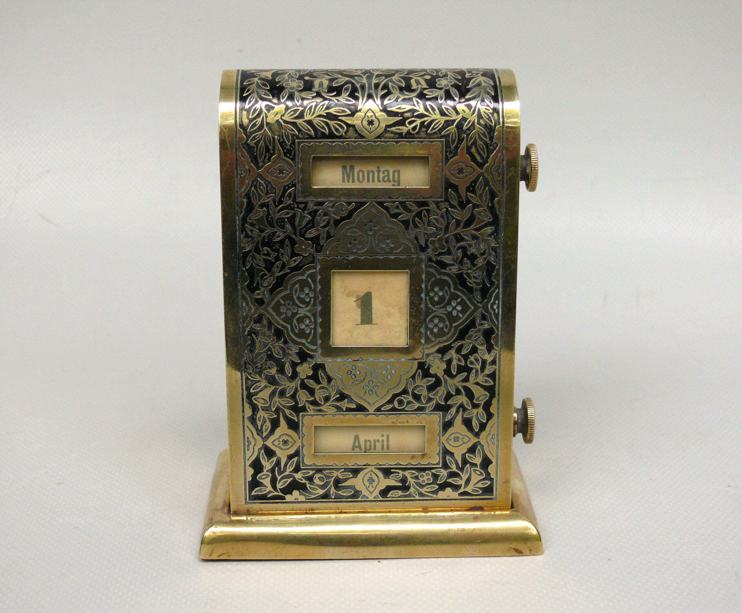 Ein sehr seltener Kalender aus Messing, guillochiert mit Nielloeinlage.