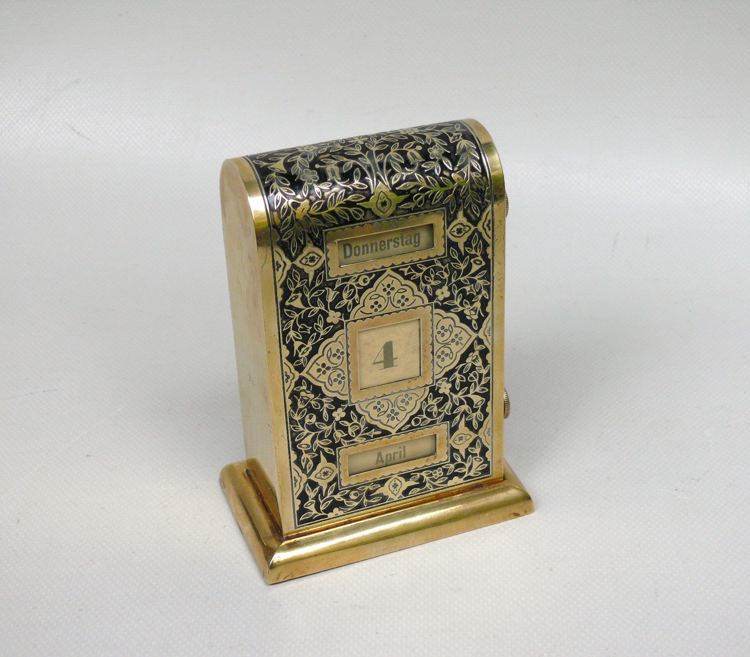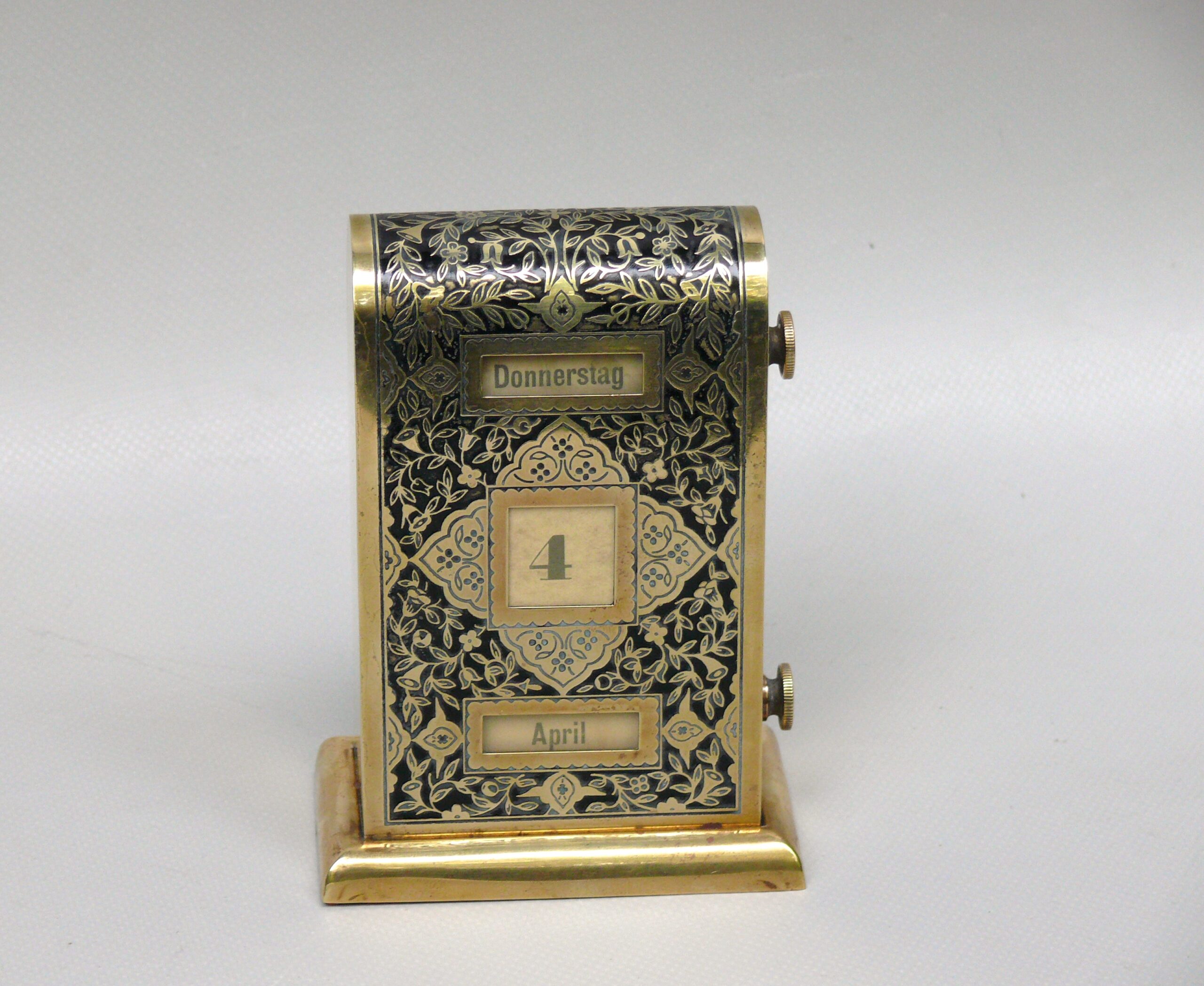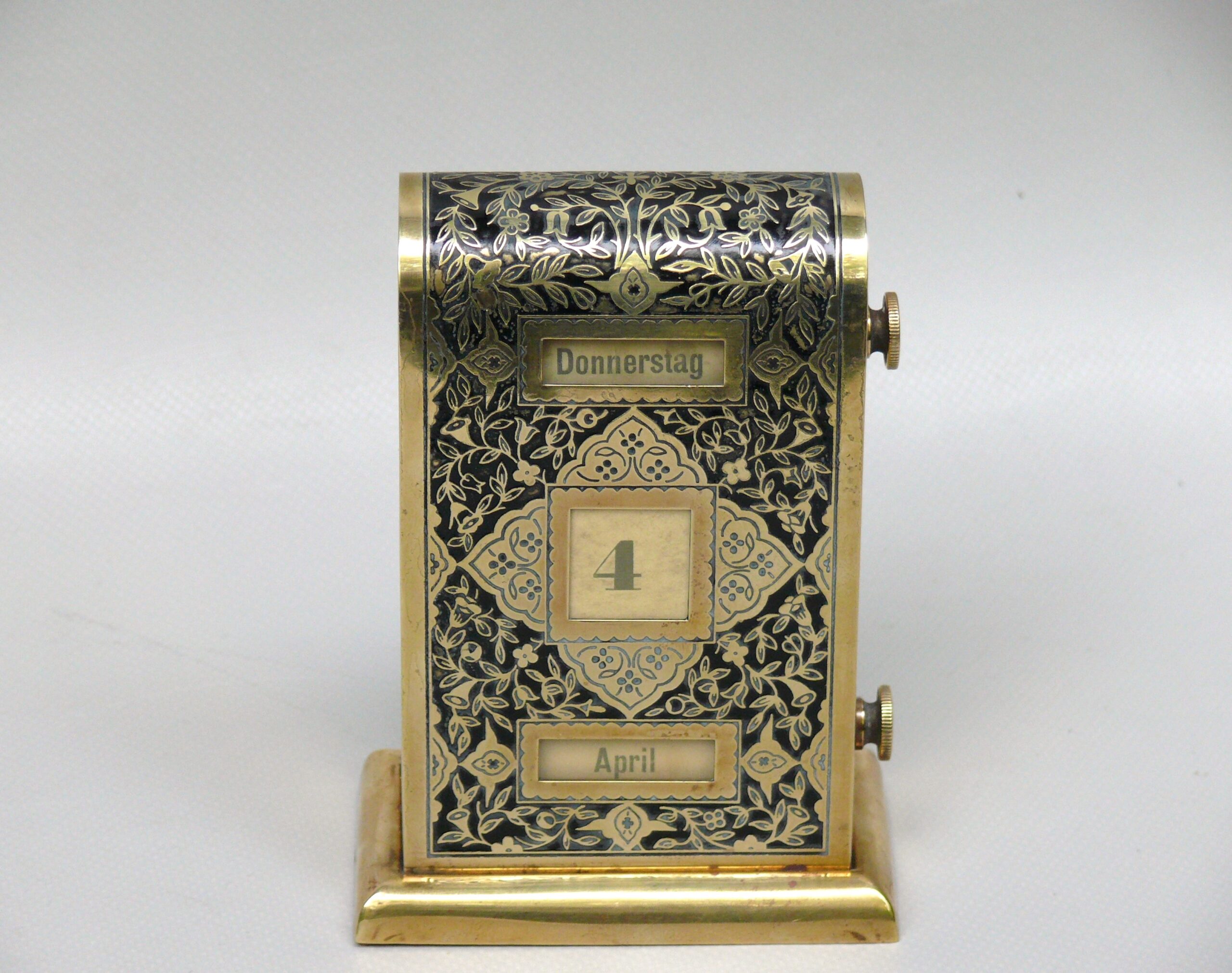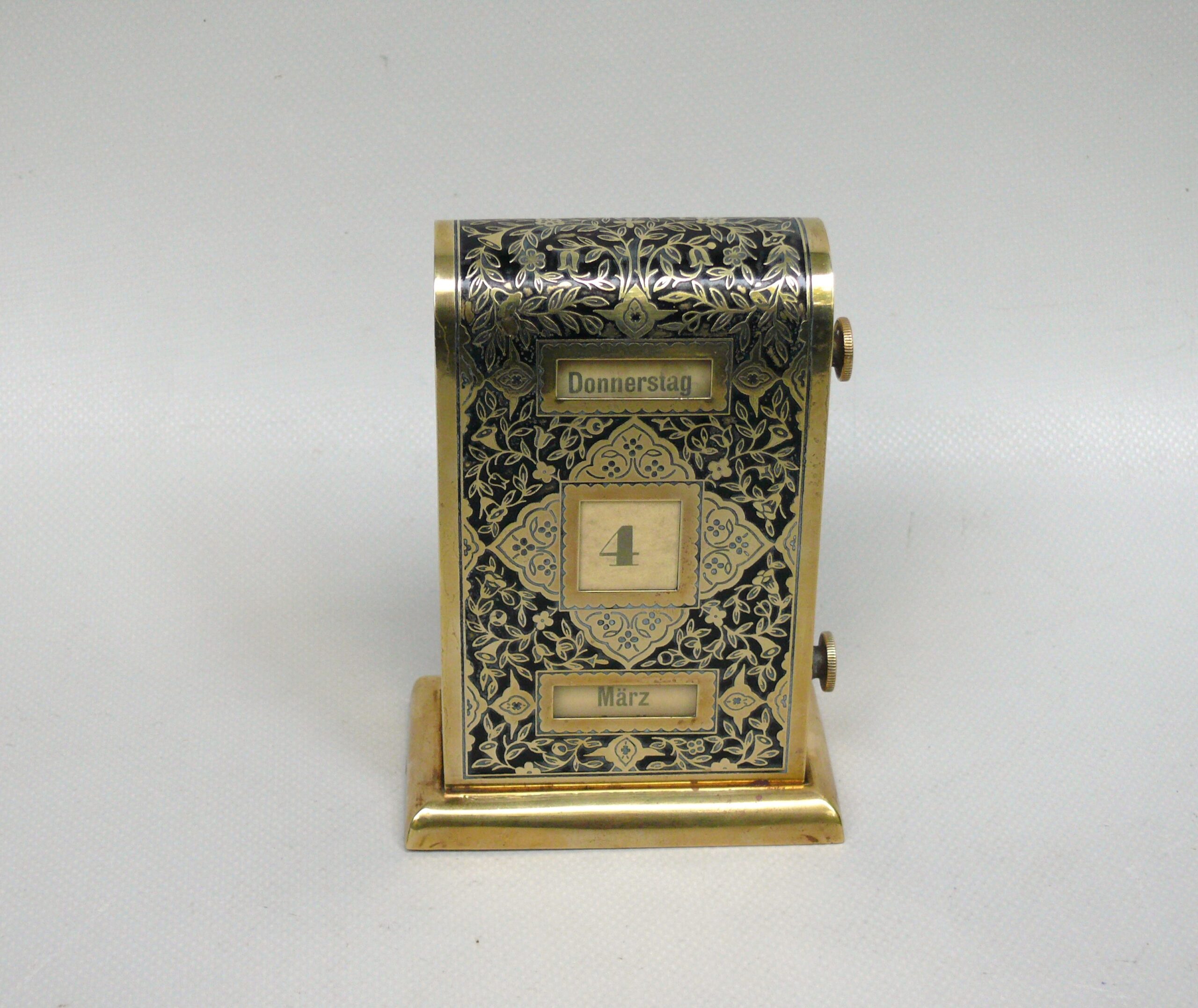 Ein sehr seltener Kalender aus Messing, guillochiert mit Nielloeinlage.