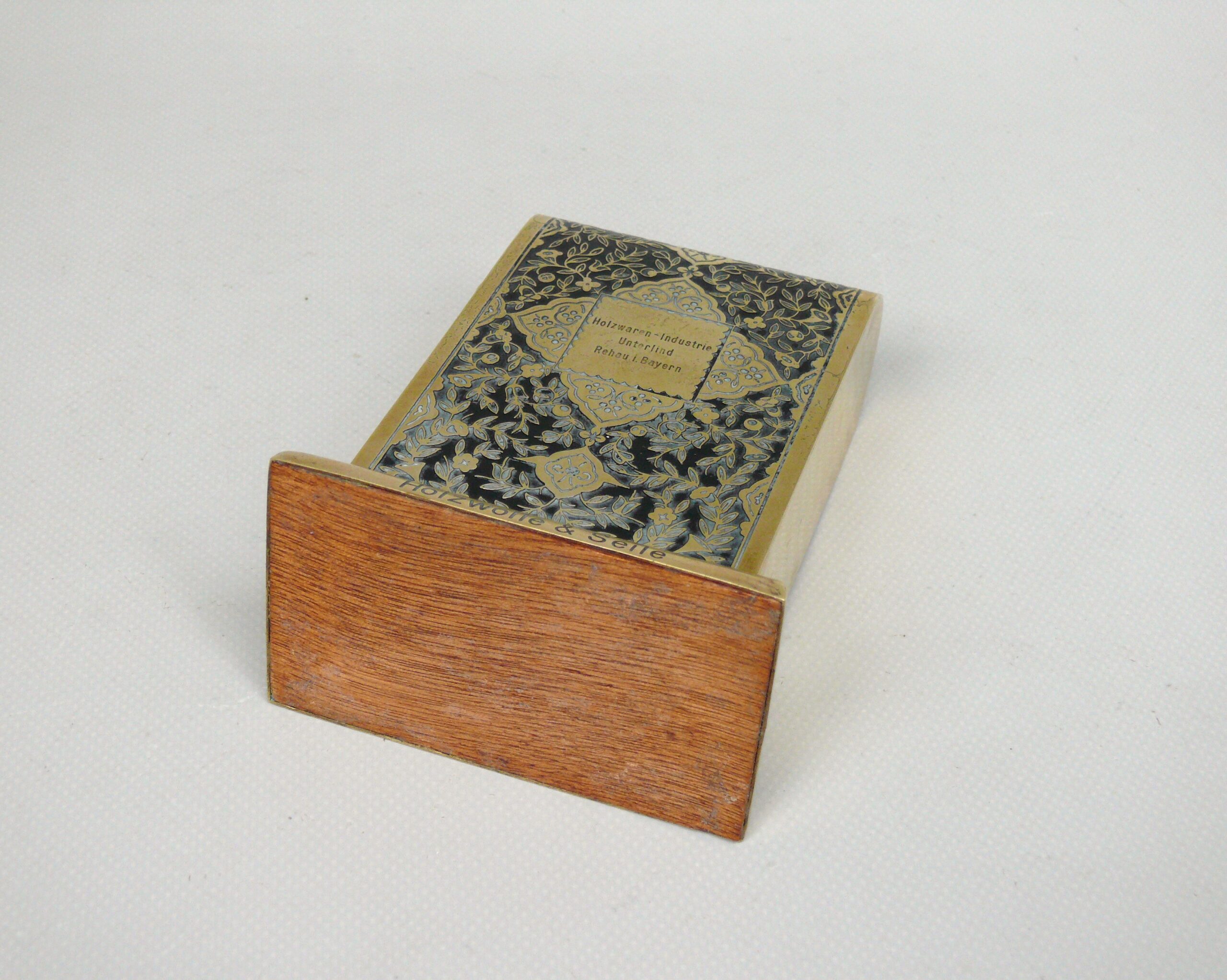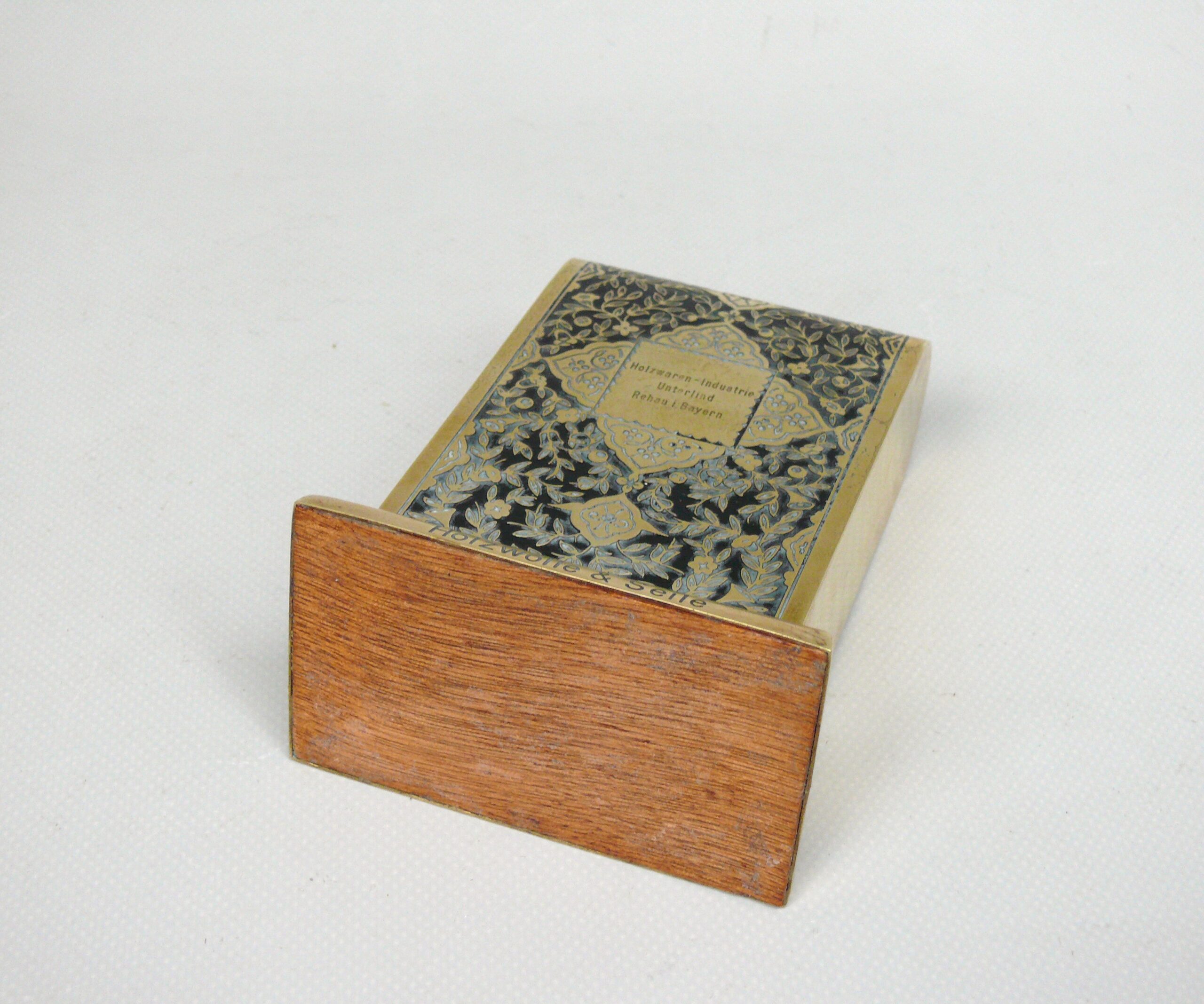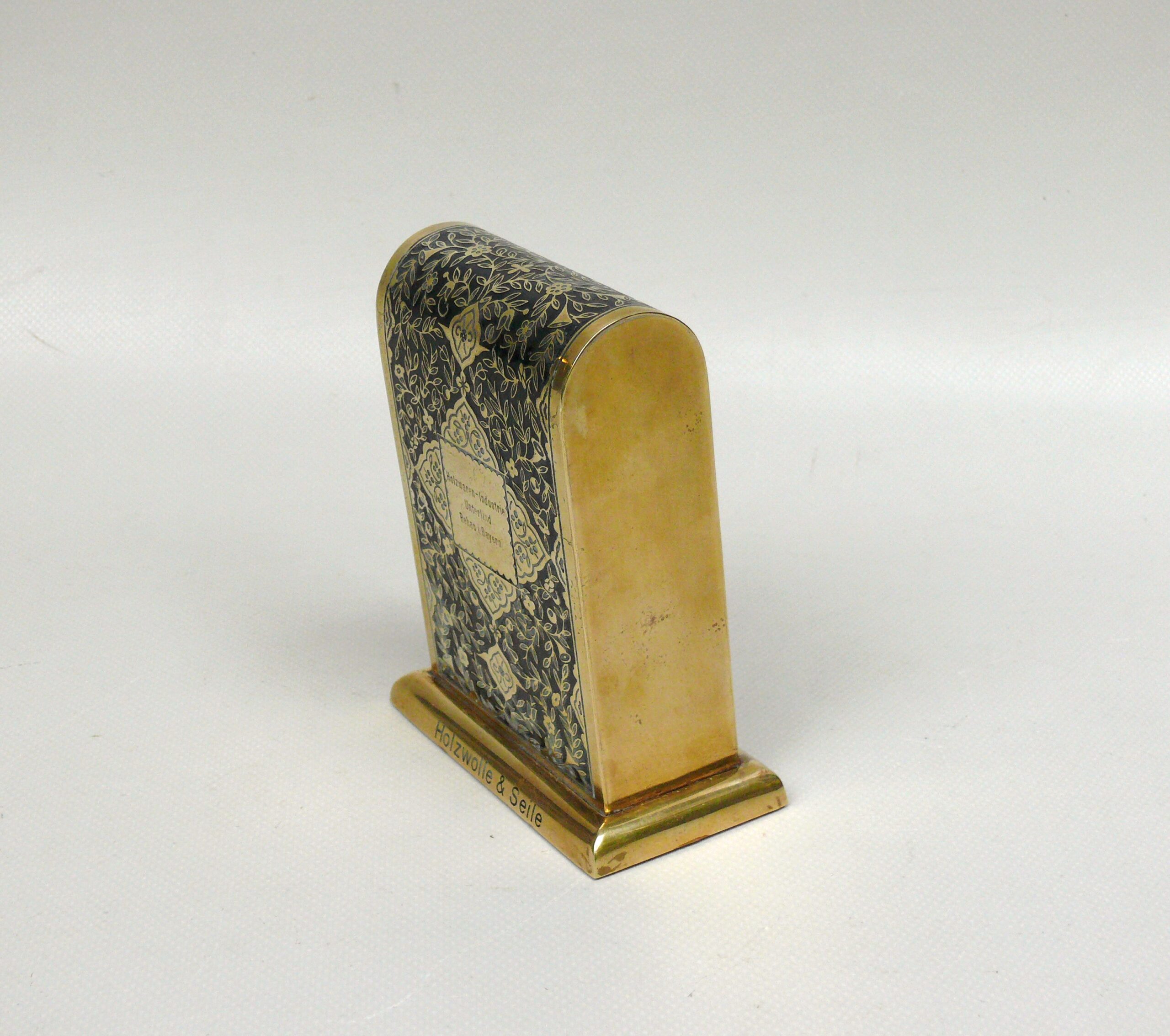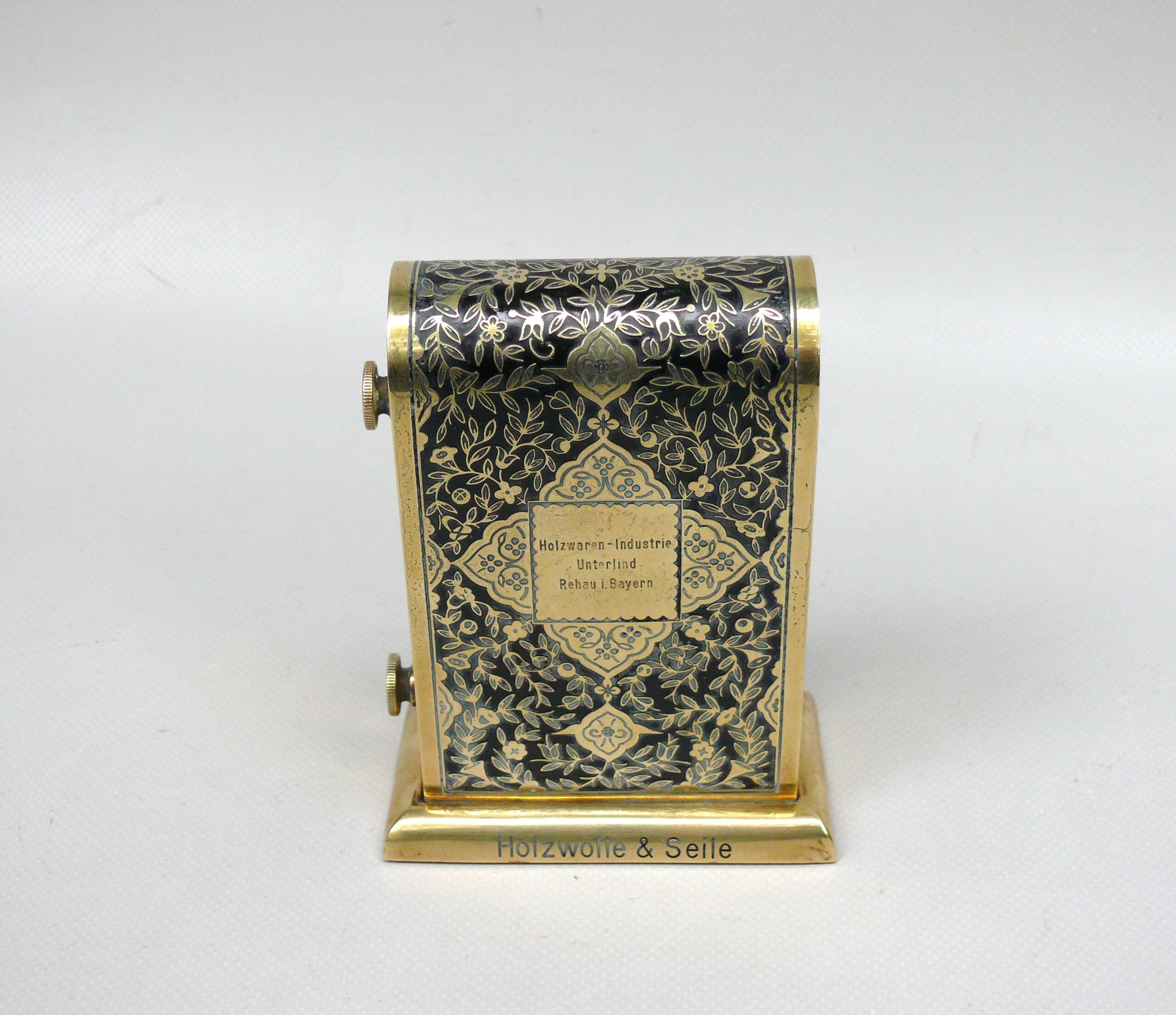BS17 – ewiger Kalender, Art Deco, Messing, Nielloarbeit – beschriftet rückseitig: Holzwaren-Industrie Unterlind Rehau i. Bayern Holzwolle & Seile