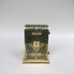 Der Kalender selbst ist schwarz lackiert in Verbindung mit goldfarben eloxiertem Metall. Er ist in der strengen Form des Art Deco ausgeführt.