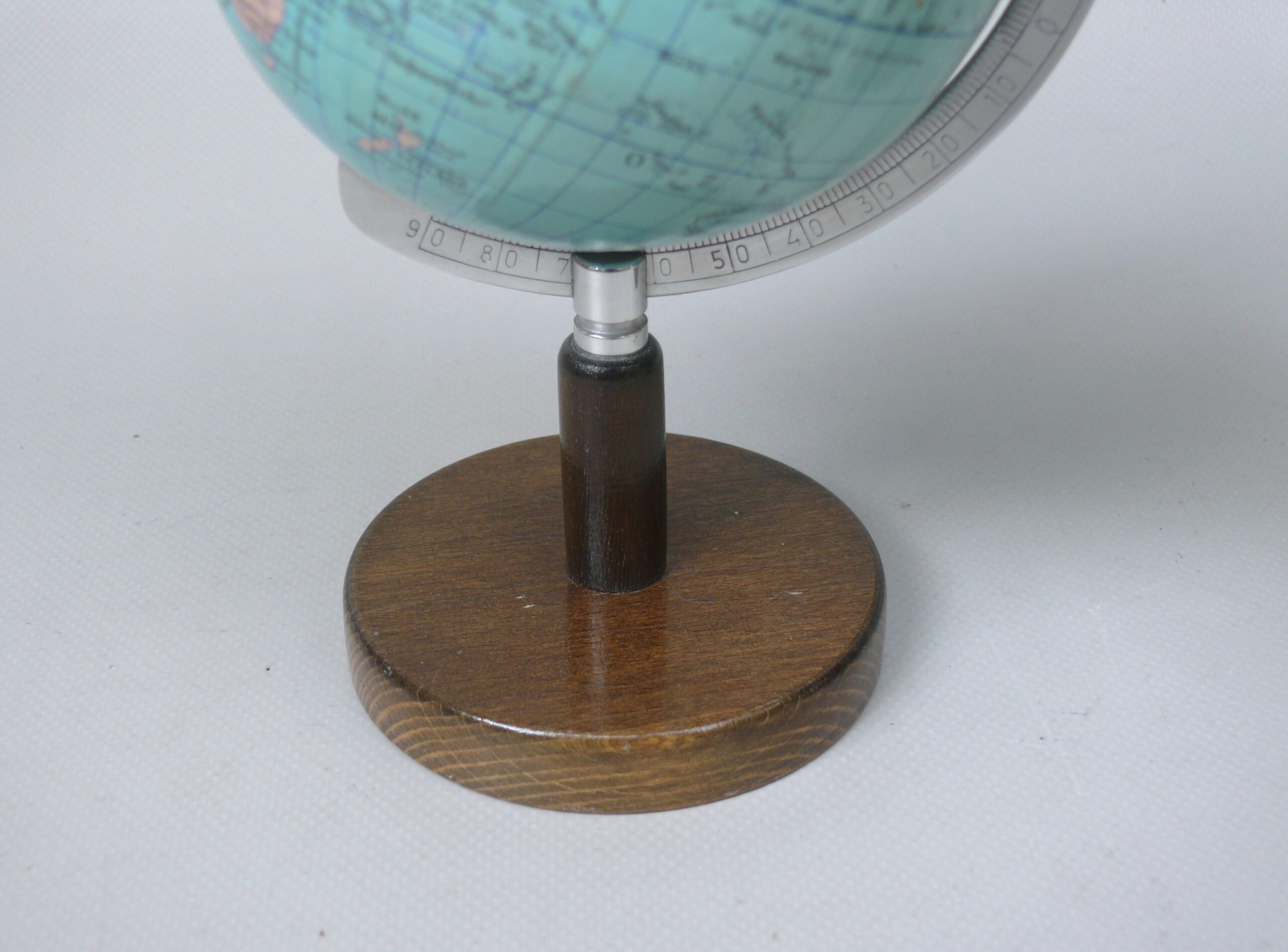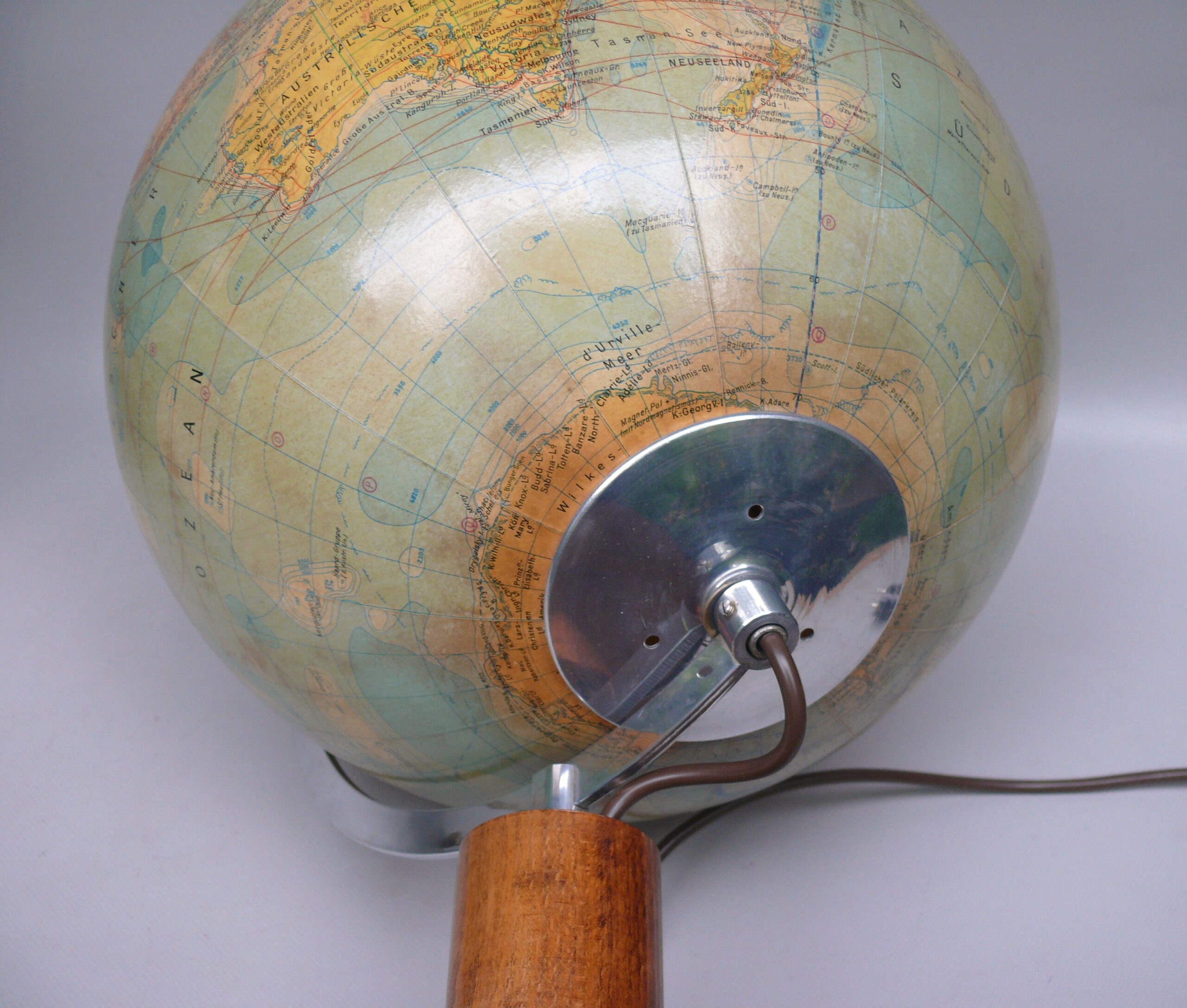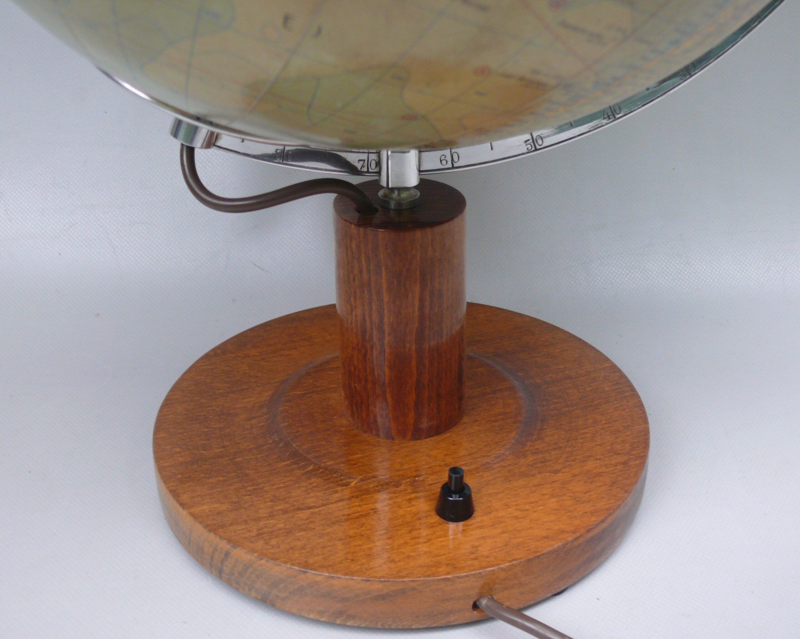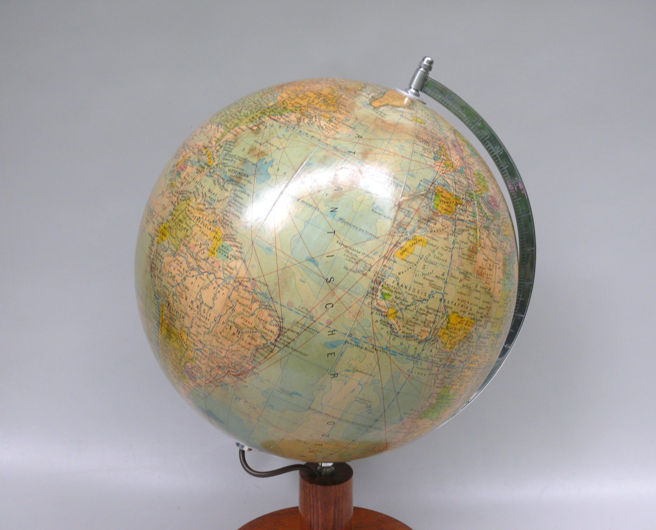 Der Globus ist in einem schönen Zustand. Die Kugel ist aus Pappe, handkaschiert, der Stand Holz mit einer verchromten Platte, der Meridian ist aus Aluminium.