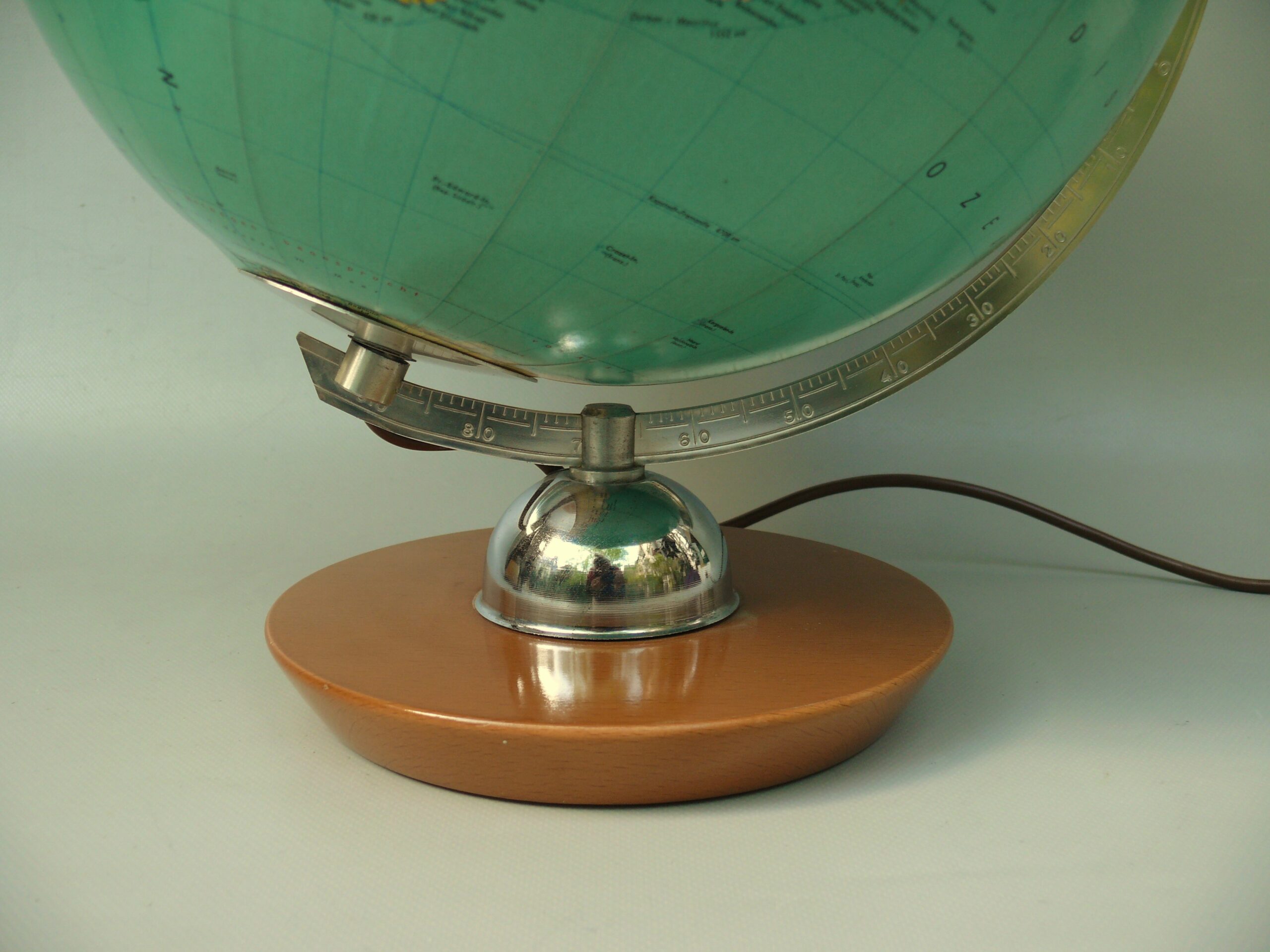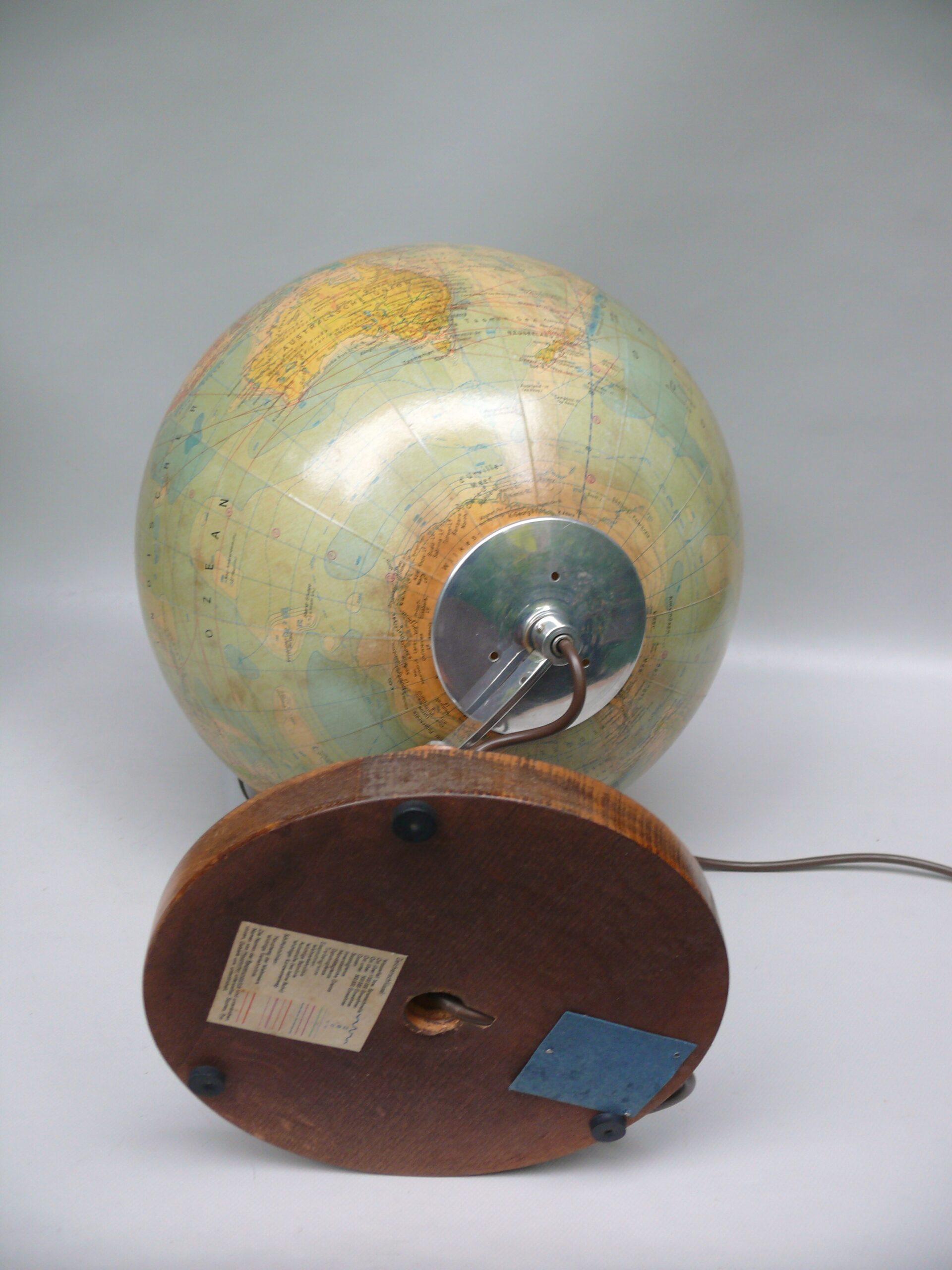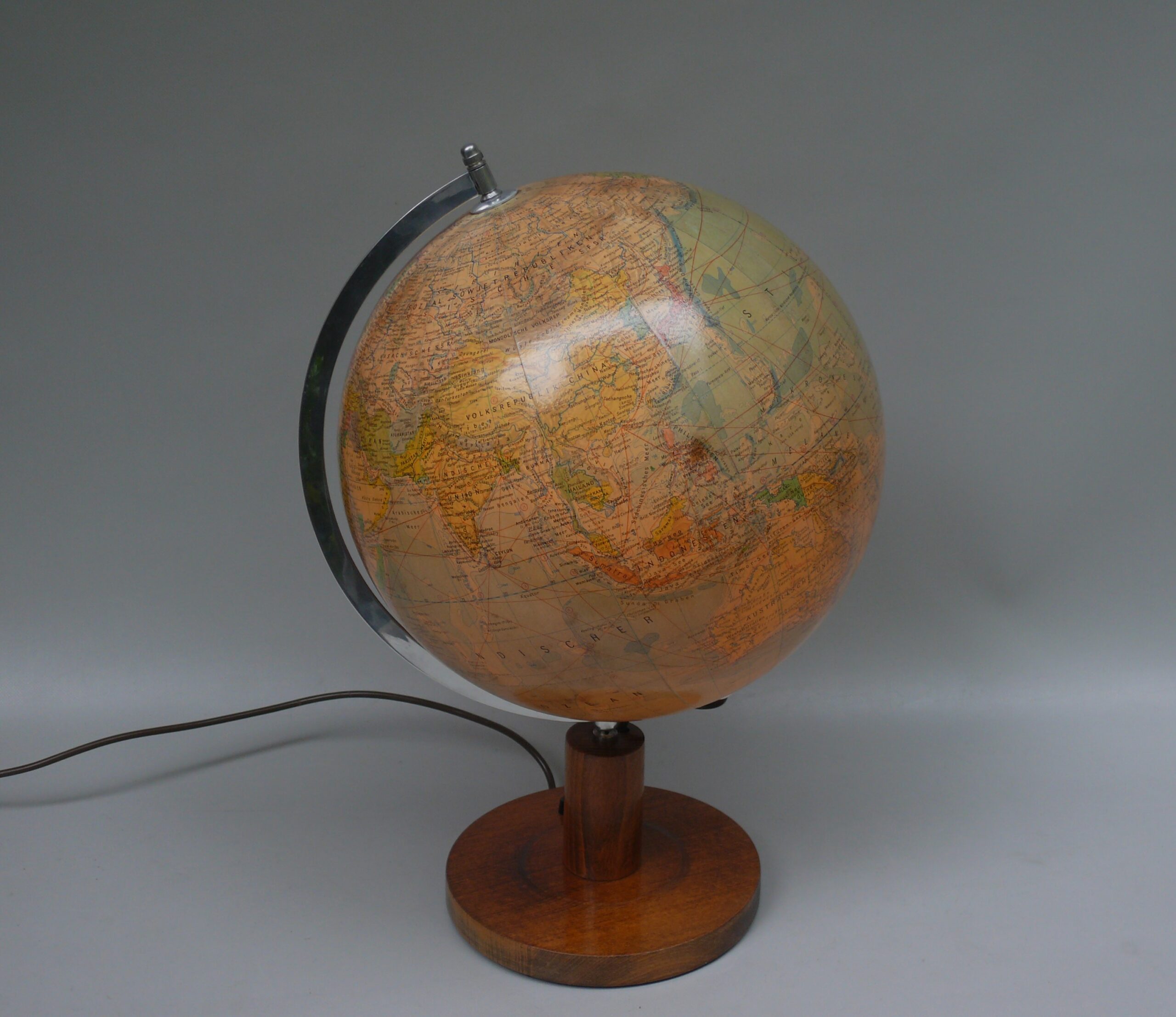 Der Globus ist in einem schönen Zustand. Die Kugel ist aus Pappe, handkaschiert, der Stand Holz mit einer verchromten Platte, der Meridian ist aus Aluminium.