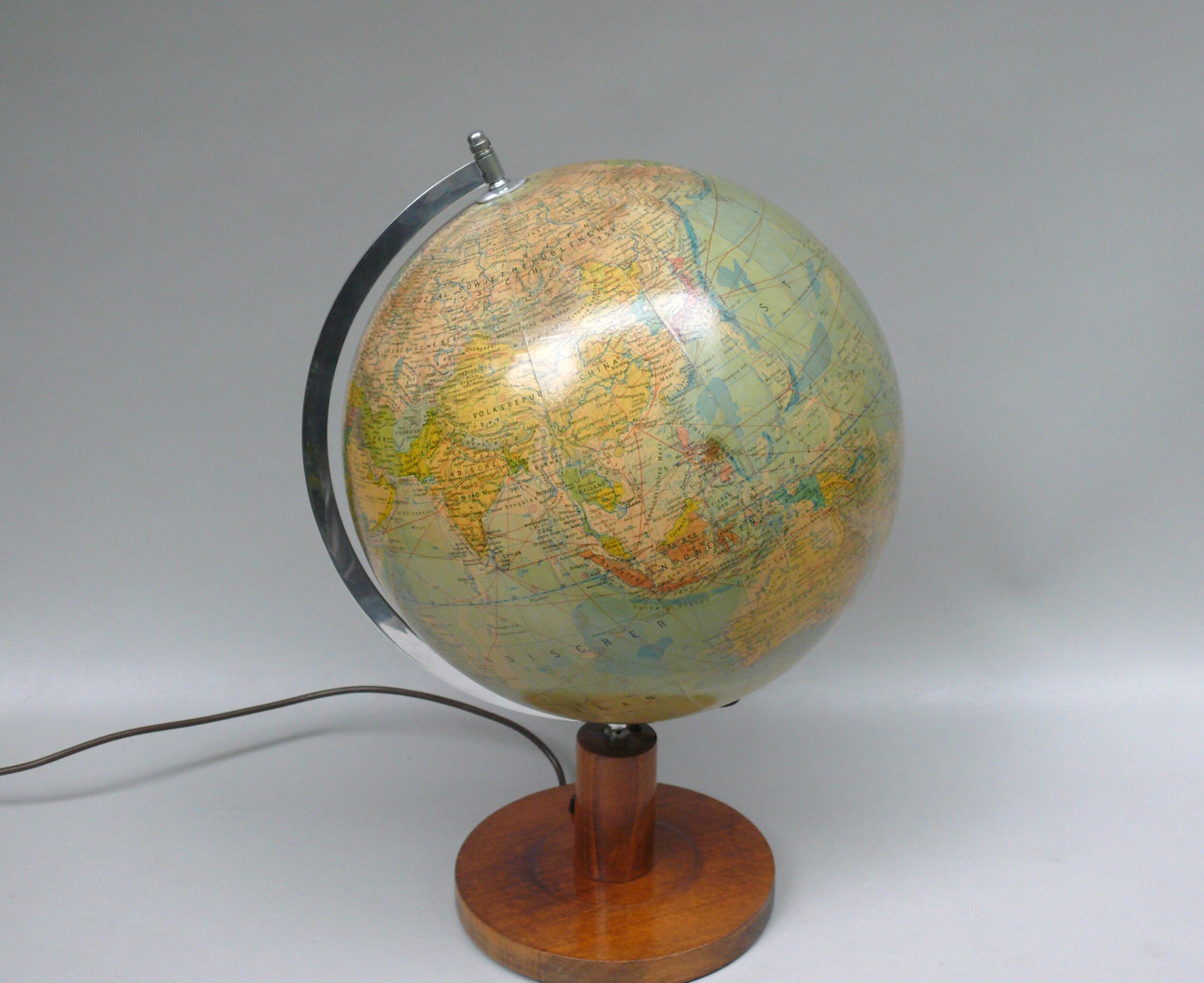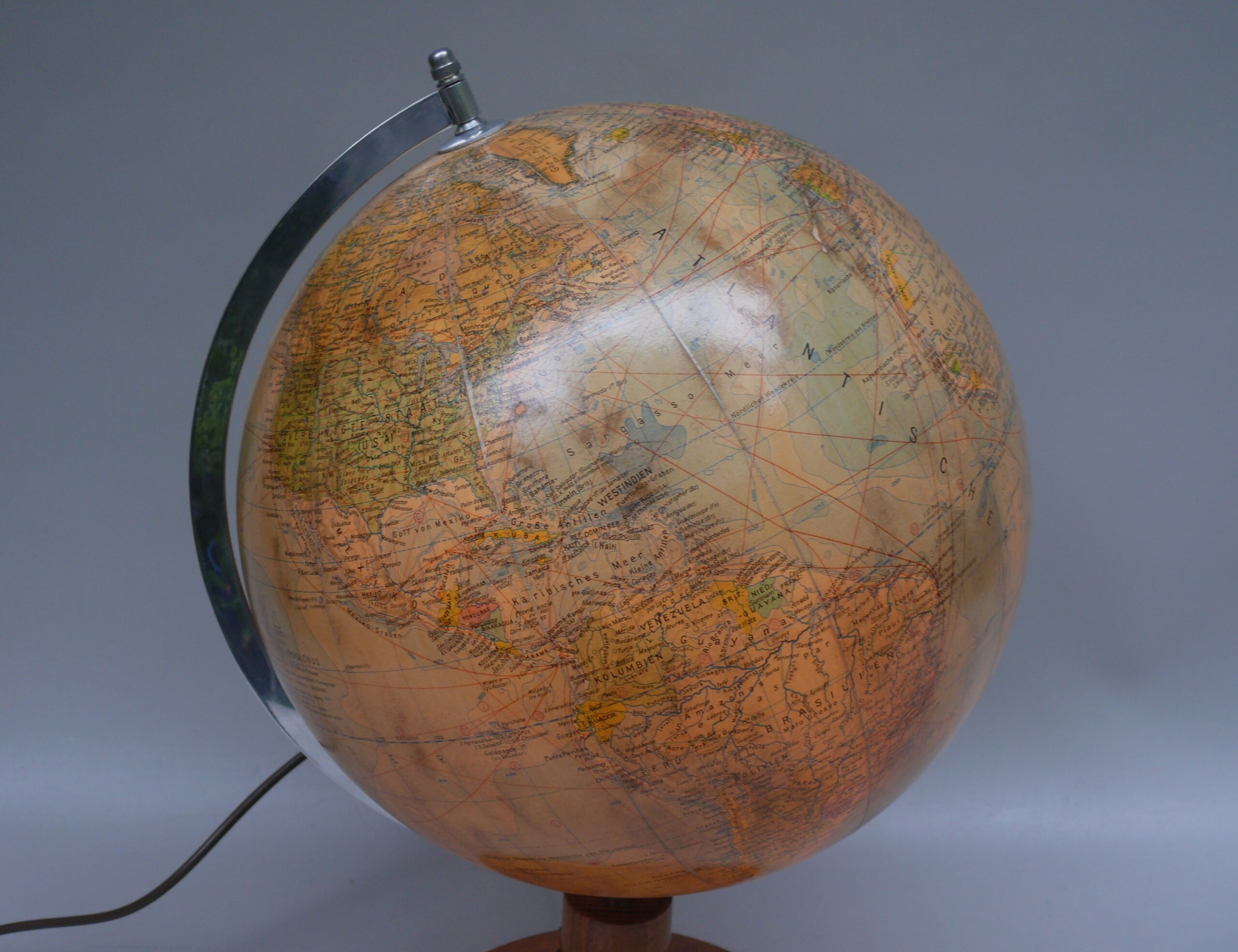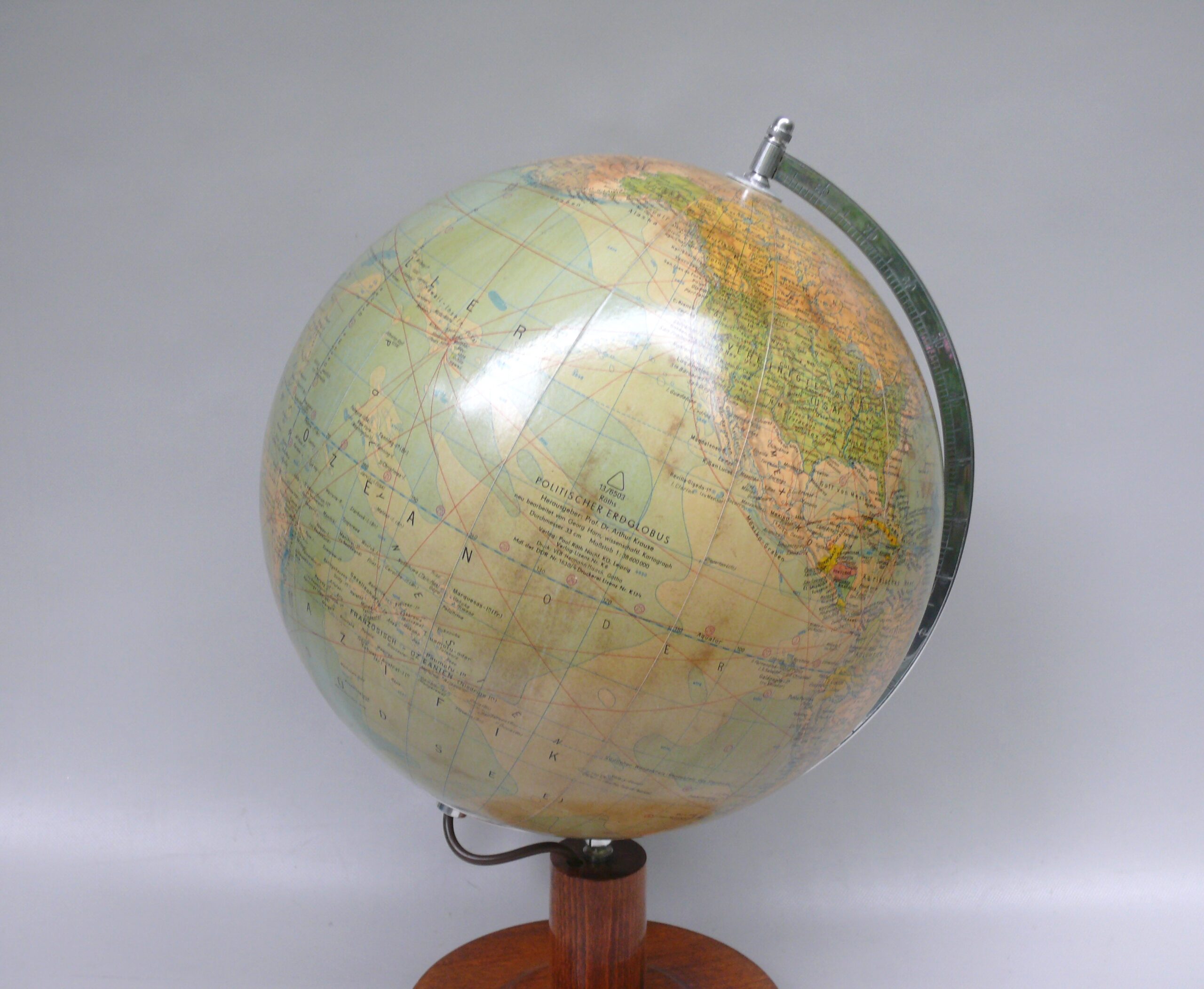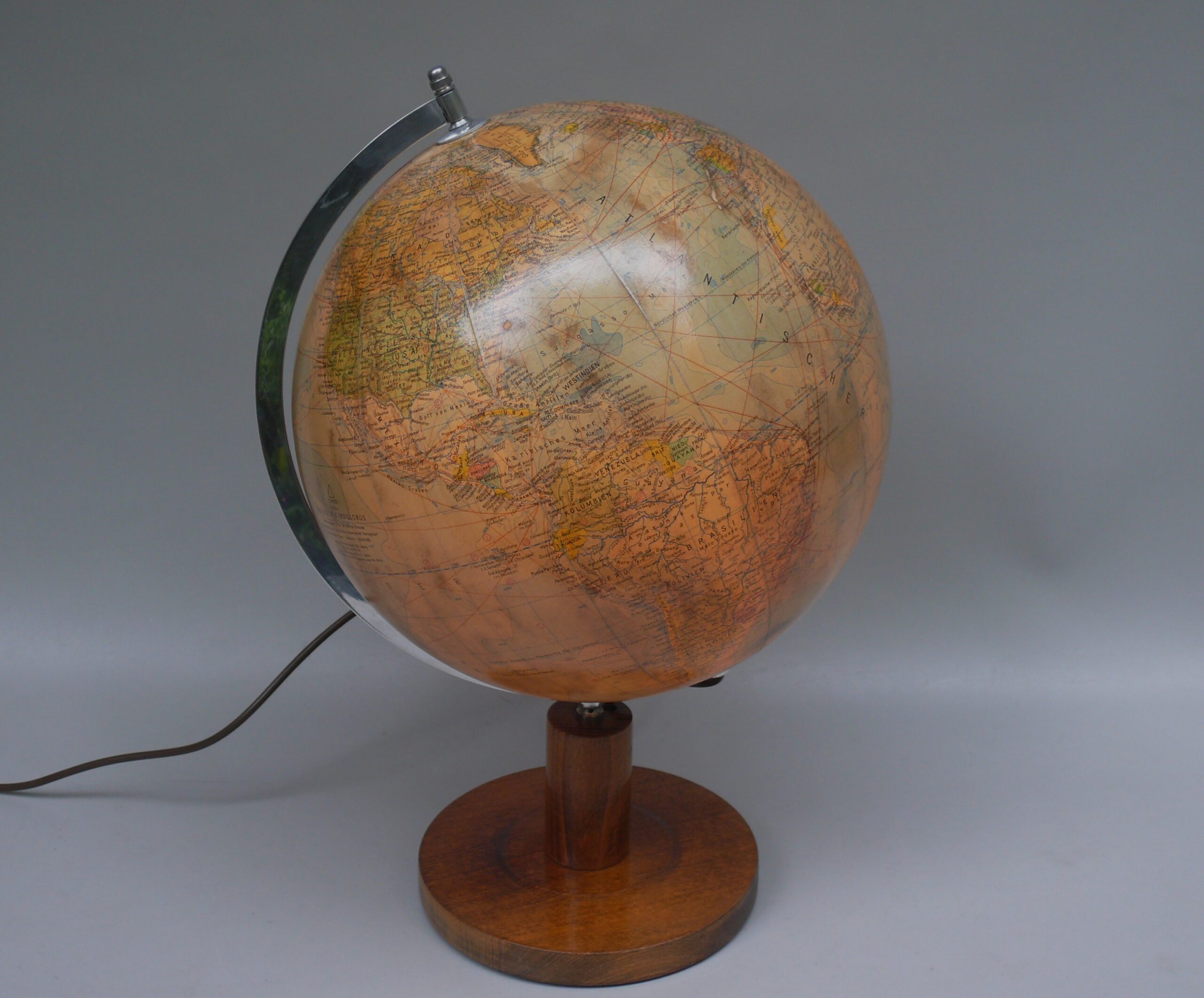 Der Globus ist in einem schönen Zustand. Die Kugel ist aus Pappe, handkaschiert, der Stand Holz mit einer verchromten Platte, der Meridian ist aus Aluminium.