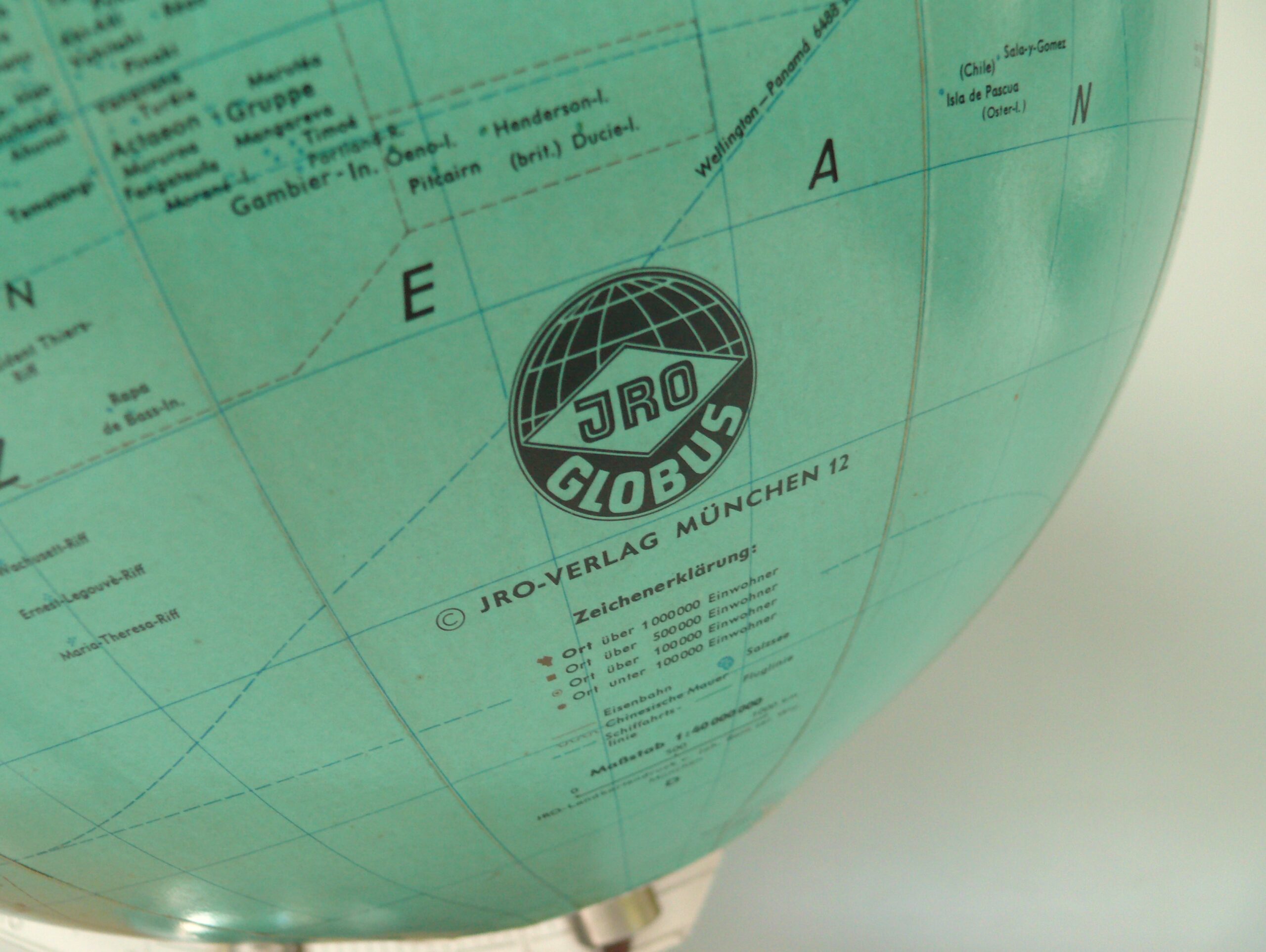 Ein Globus, bezeichnet mit JRO-Globus, JRO-Verlag München 12, aus den 50er Jahren. Es handelt sich hier um die kleine Ausführung.