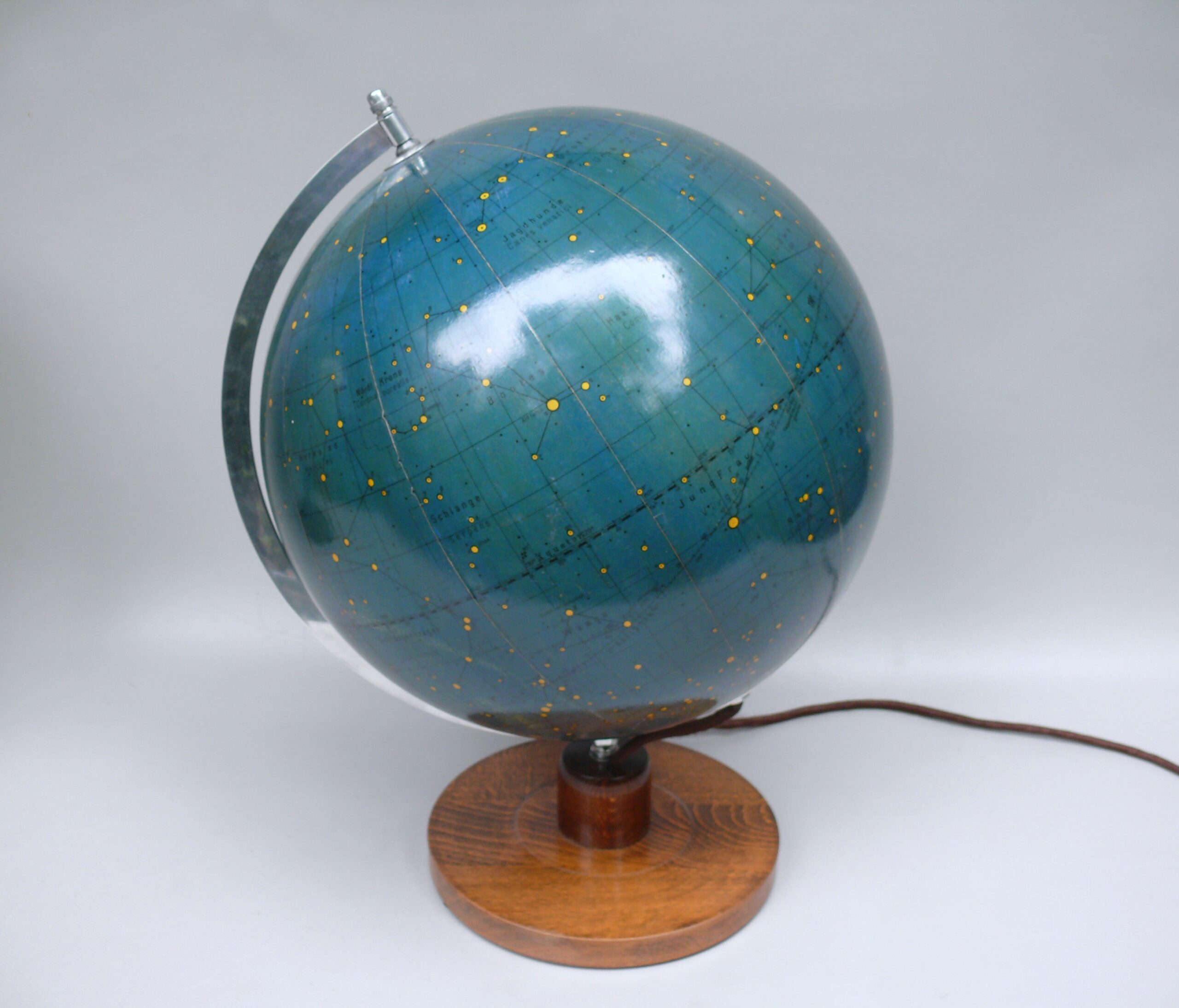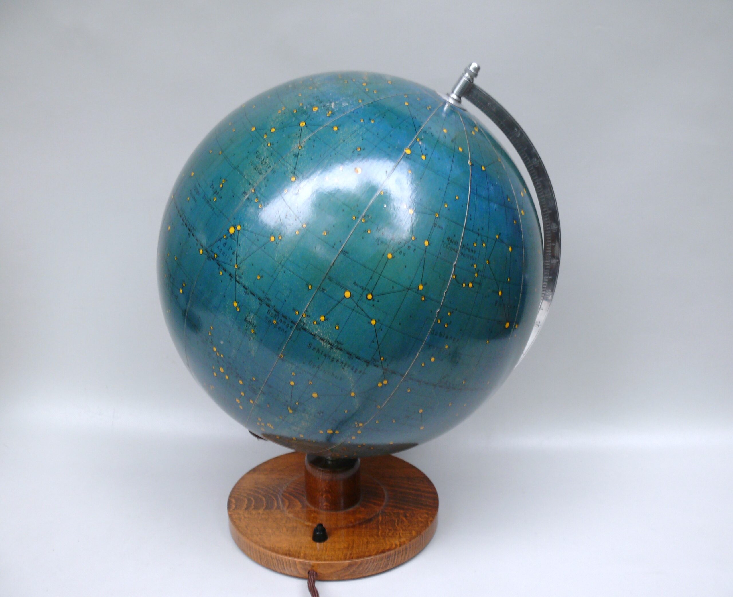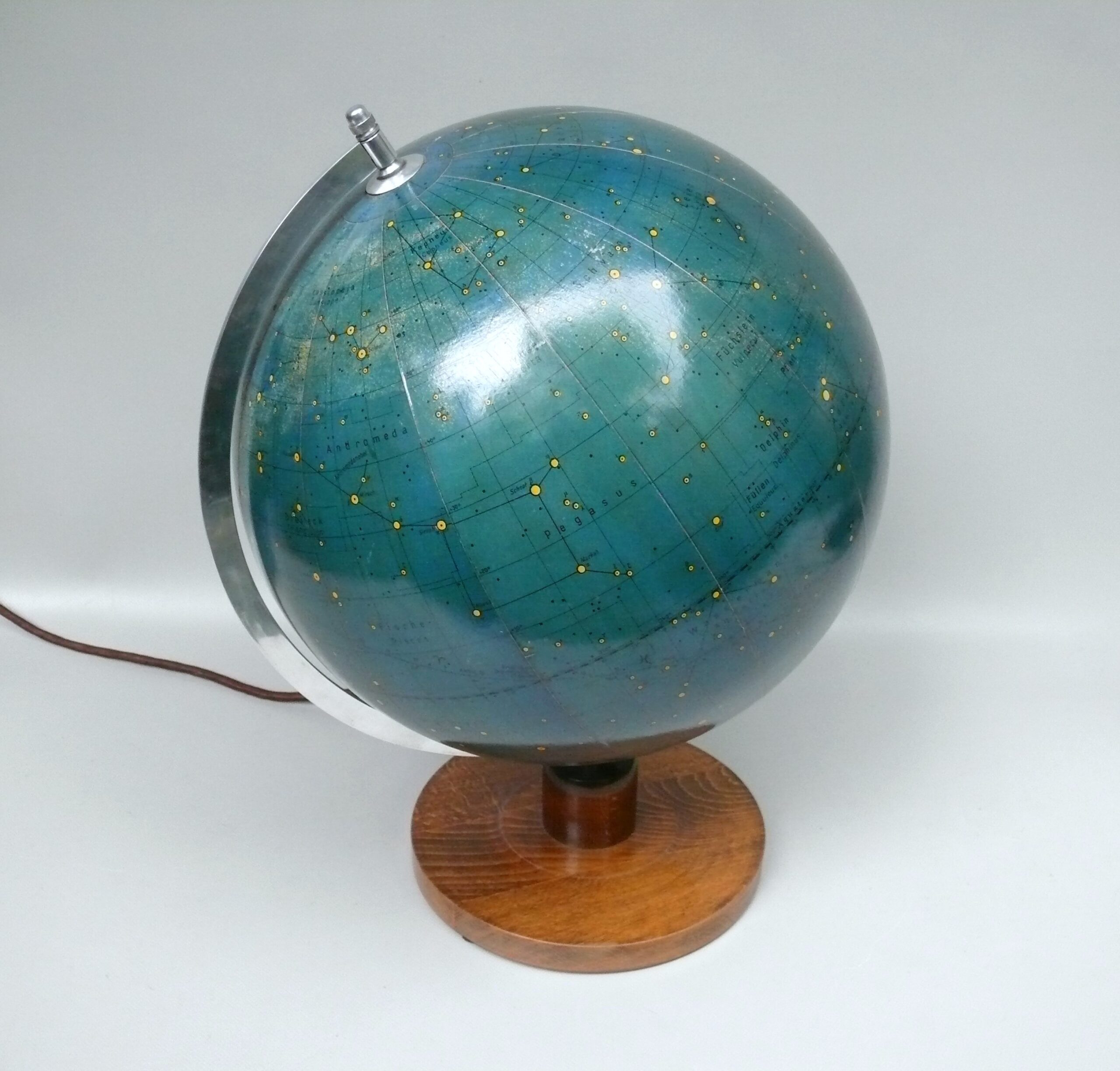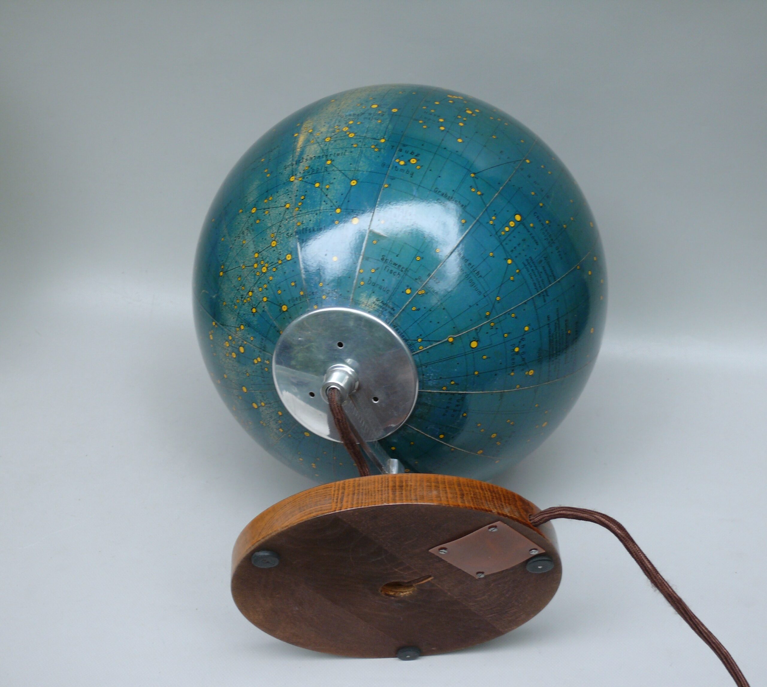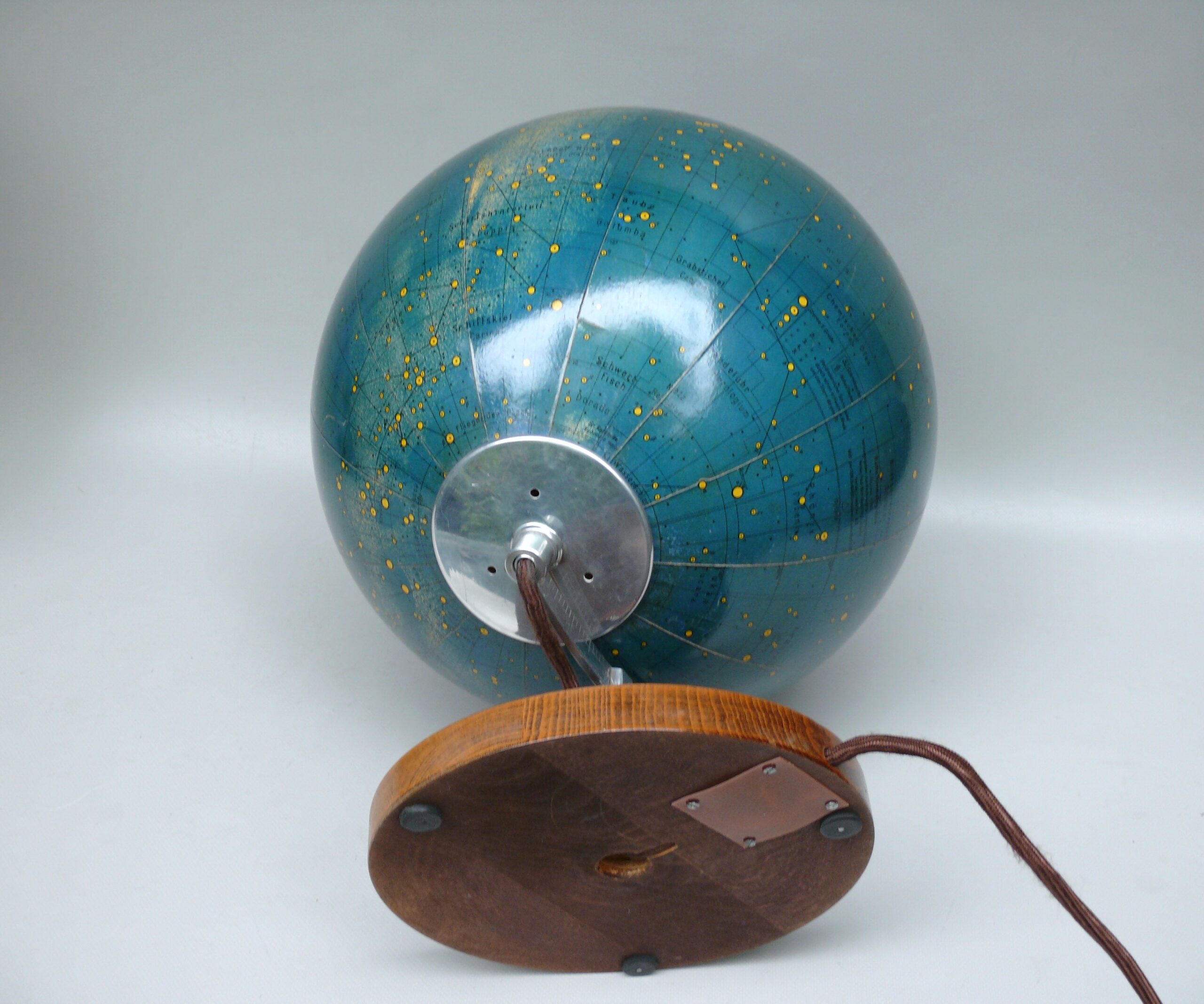G19 – Räths Himmelsglobus, Äquinox 1950, Kugel Glas handkaschiert, Sockel Holz, Aluminium, beleuchtet