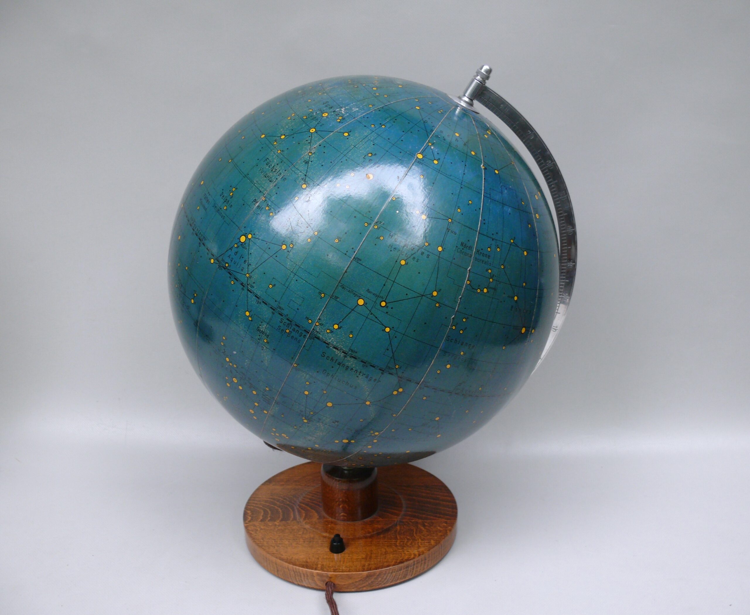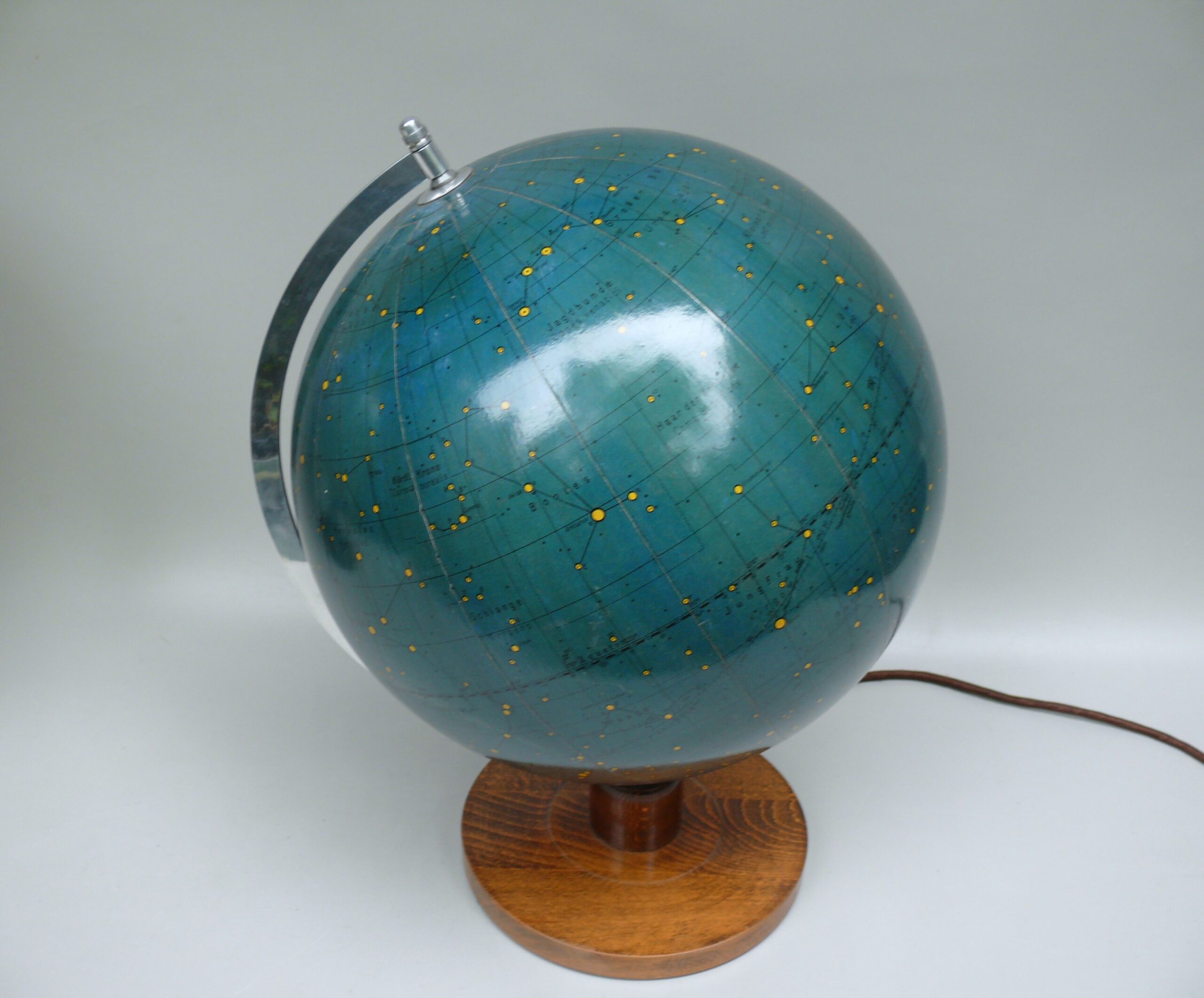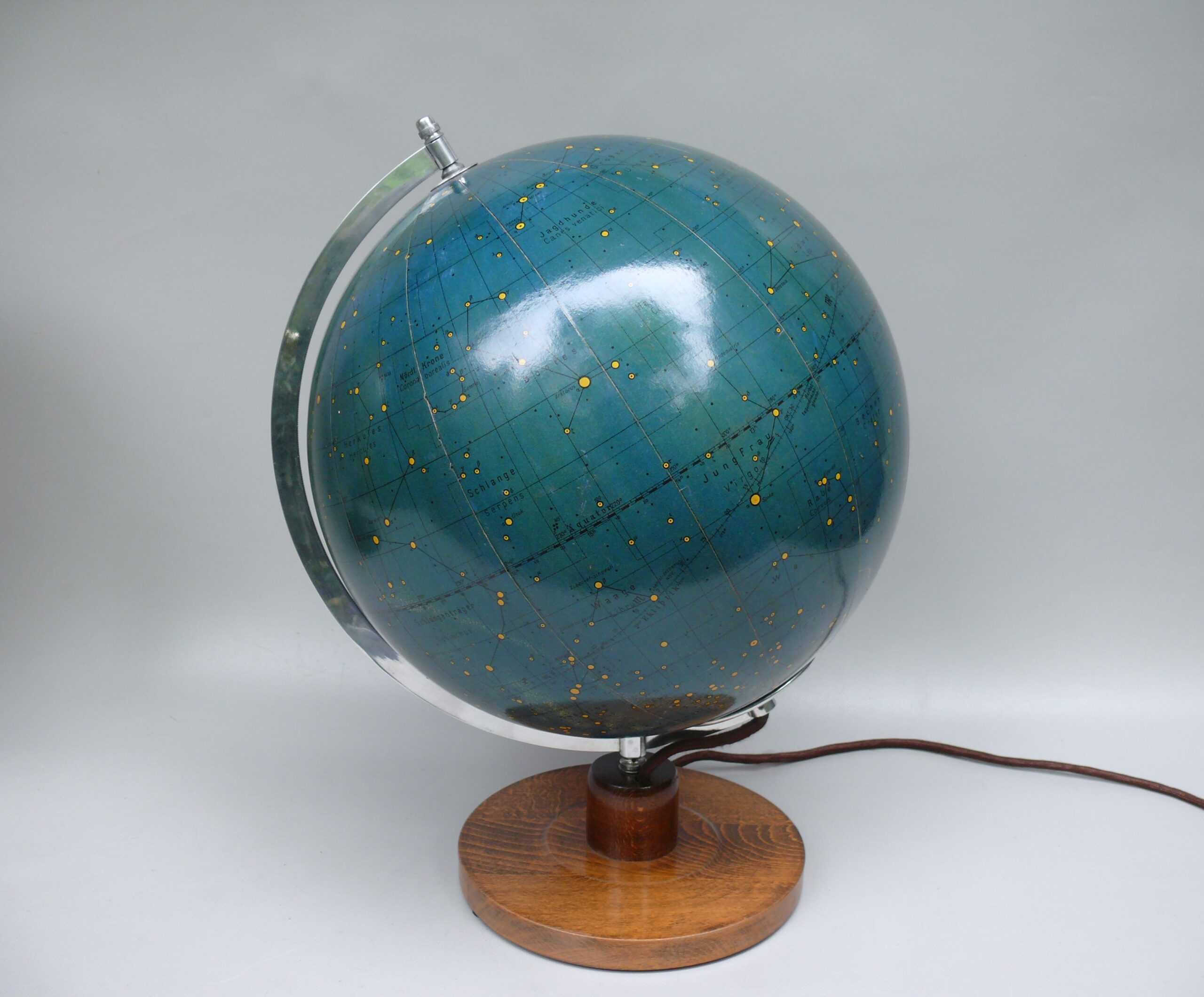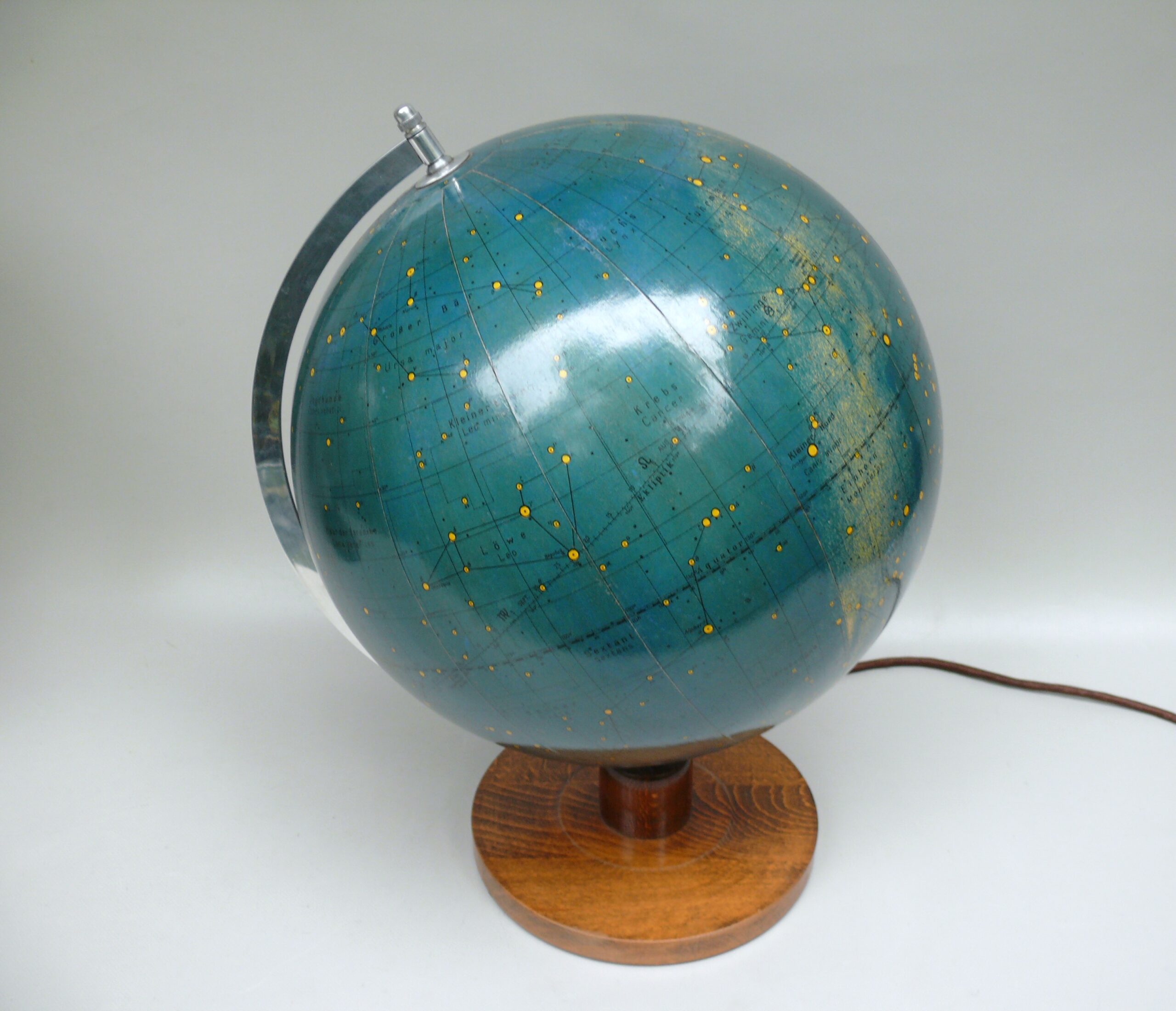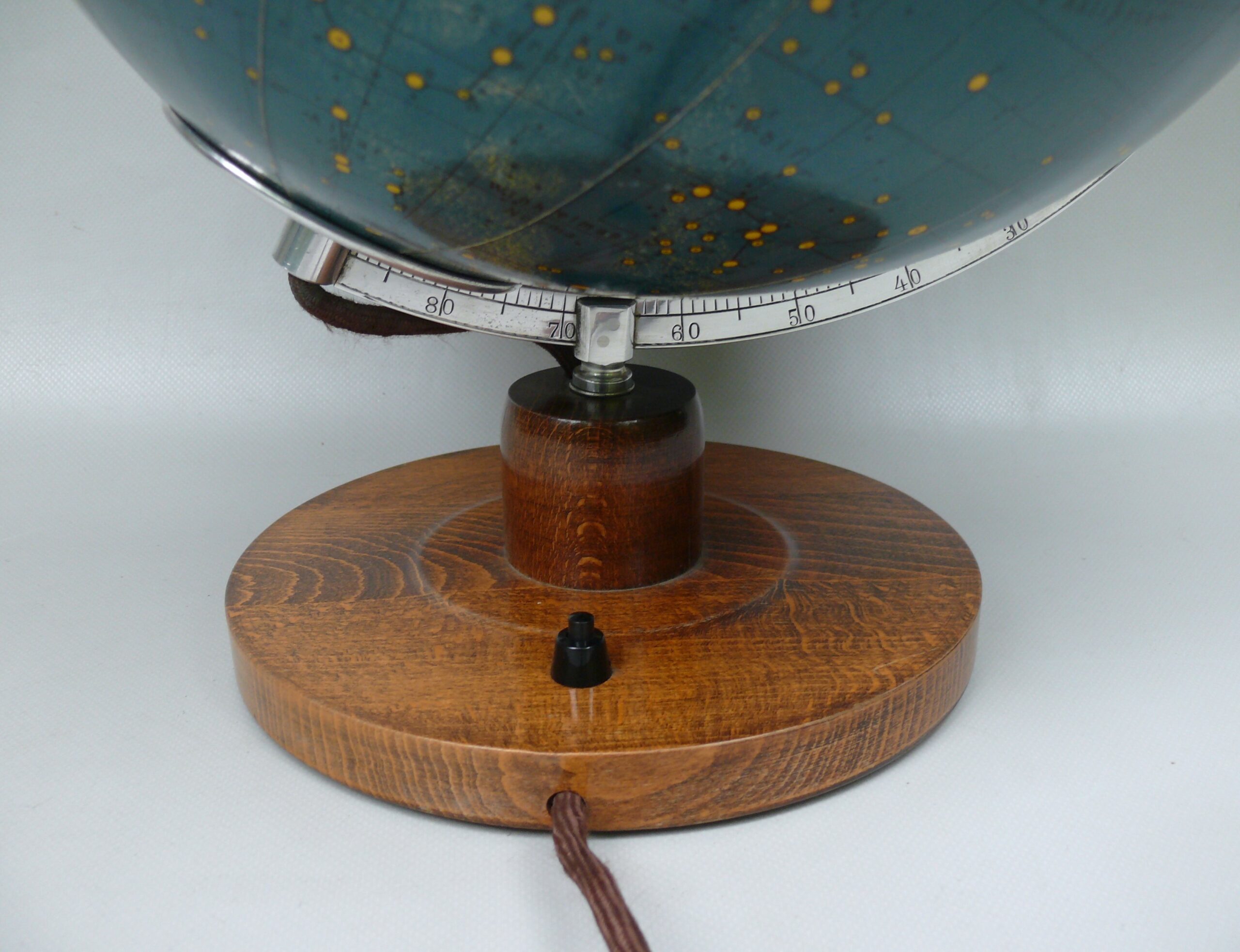 G19 – Räths Himmelsglobus, Äquinox 1950, Kugel Glas handkaschiert, Sockel Holz, Aluminium, beleuchtet