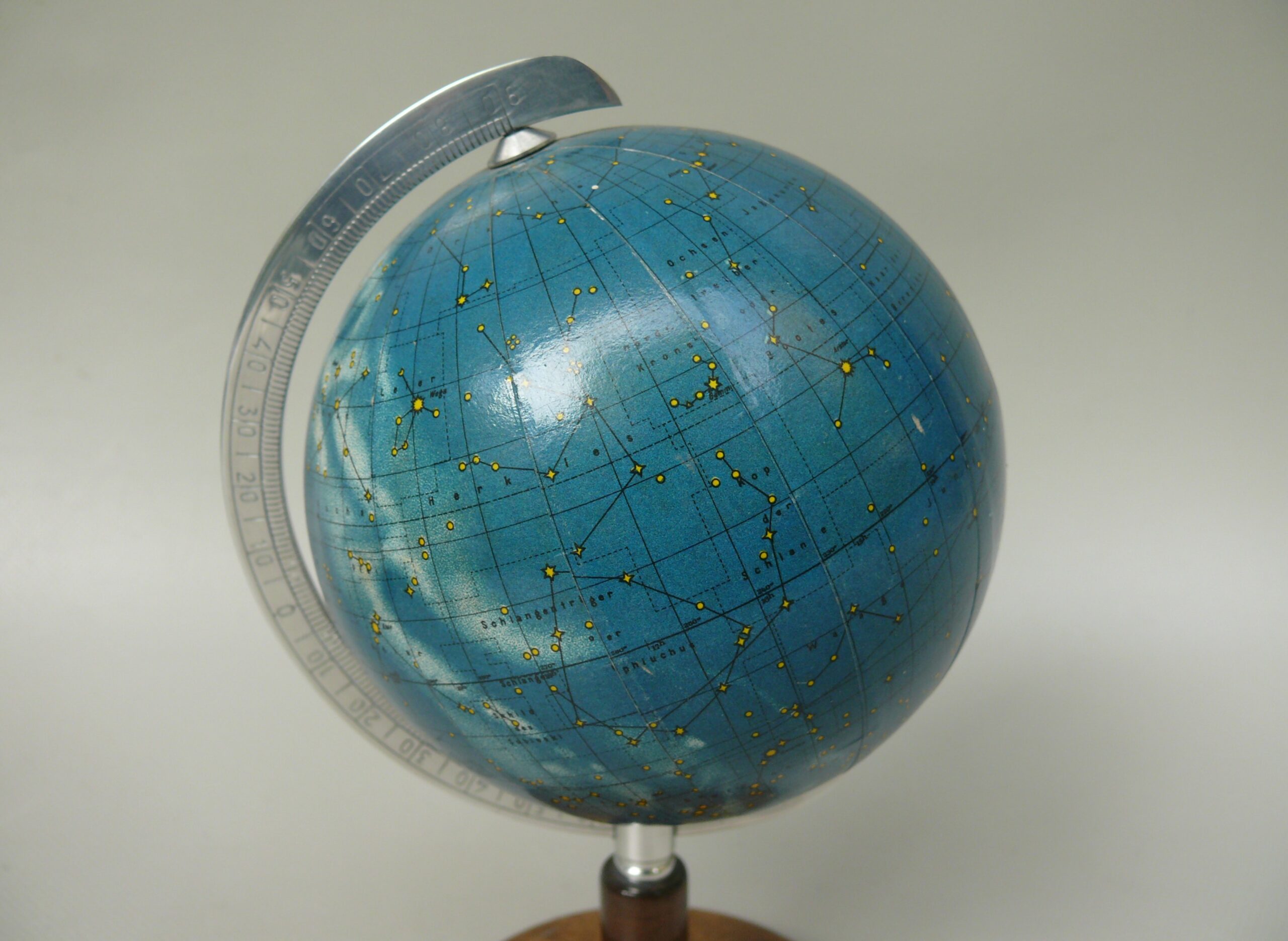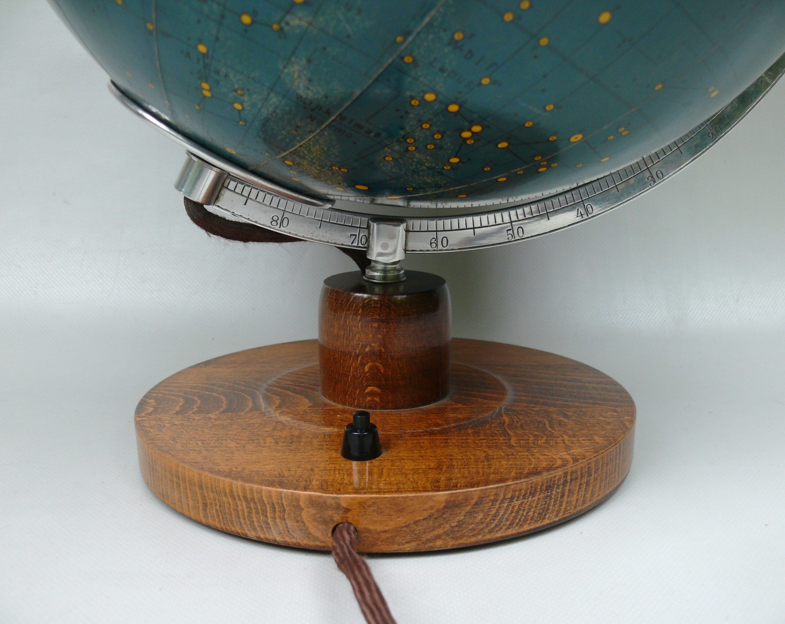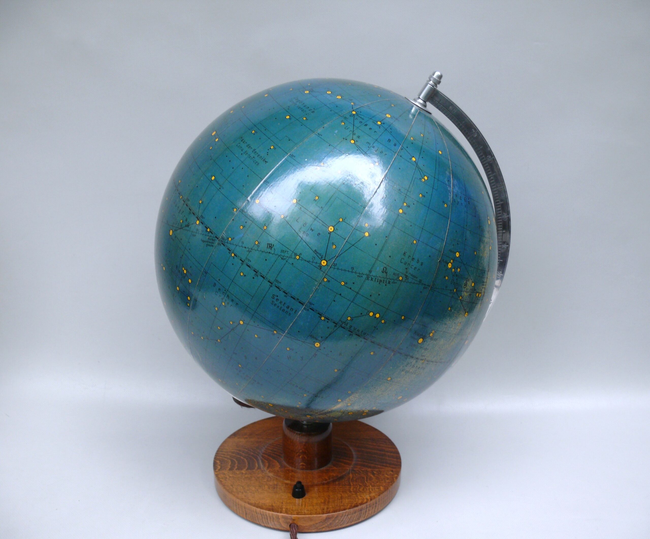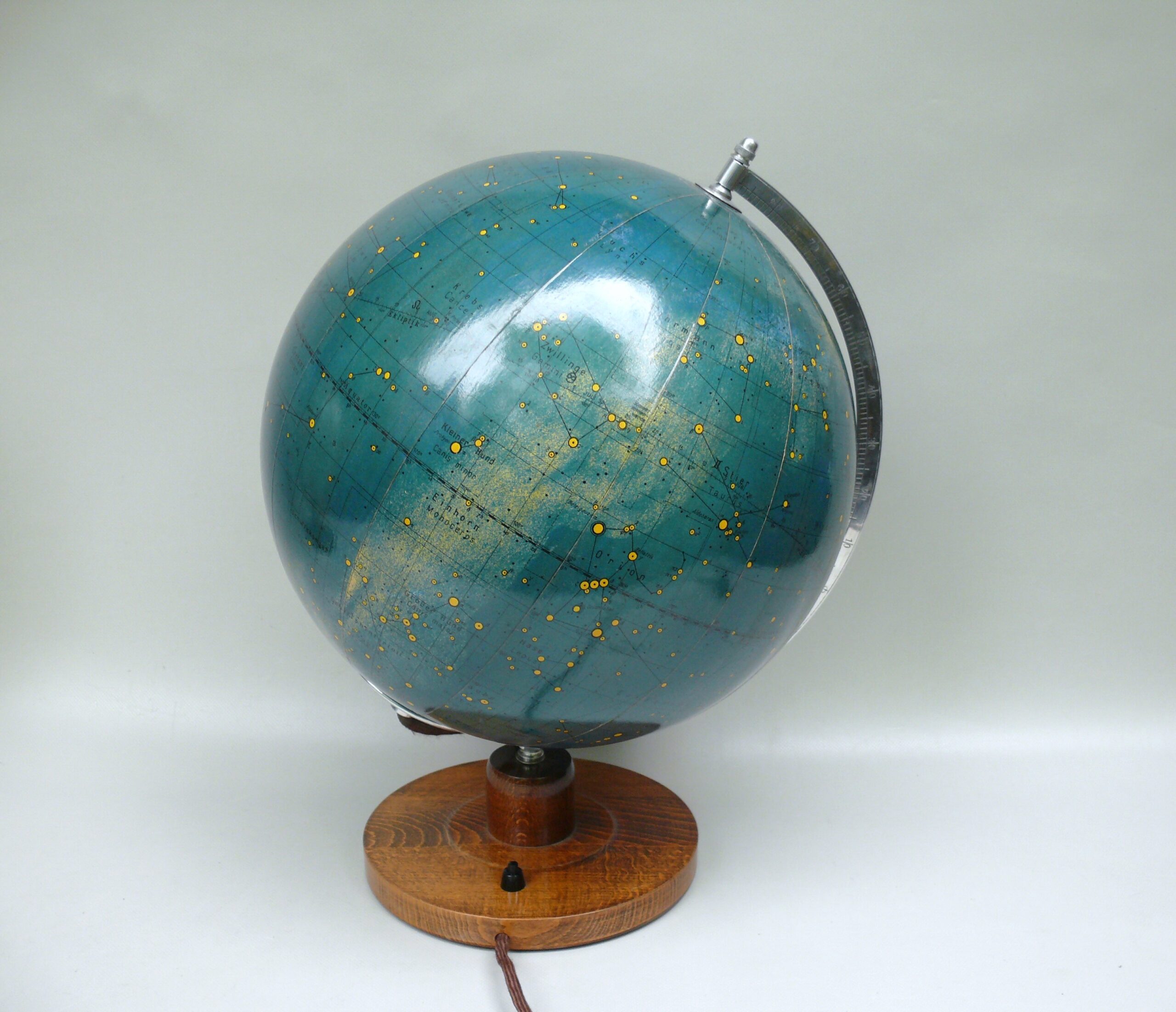 G19 – Räths Himmelsglobus, Äquinox 1950, Kugel Glas handkaschiert, Sockel Holz, Aluminium, beleuchtet