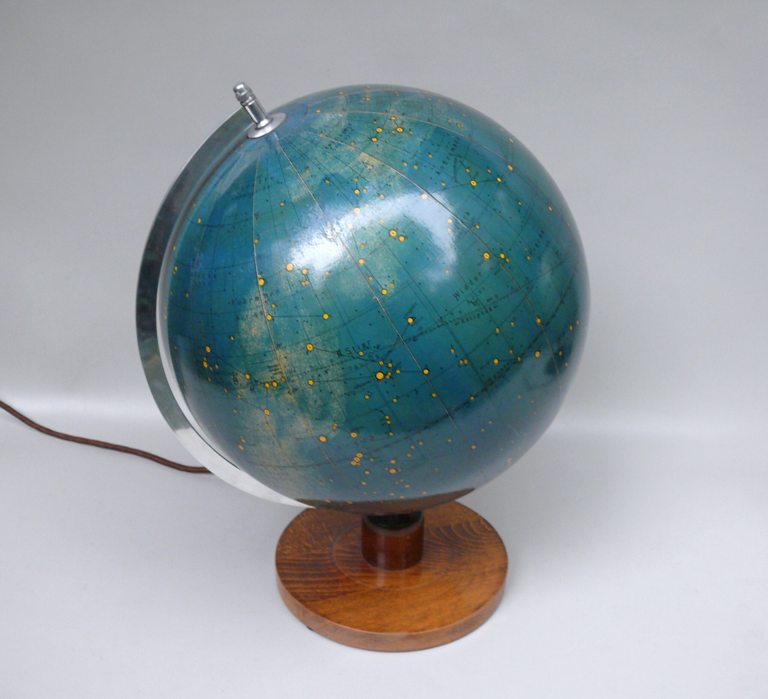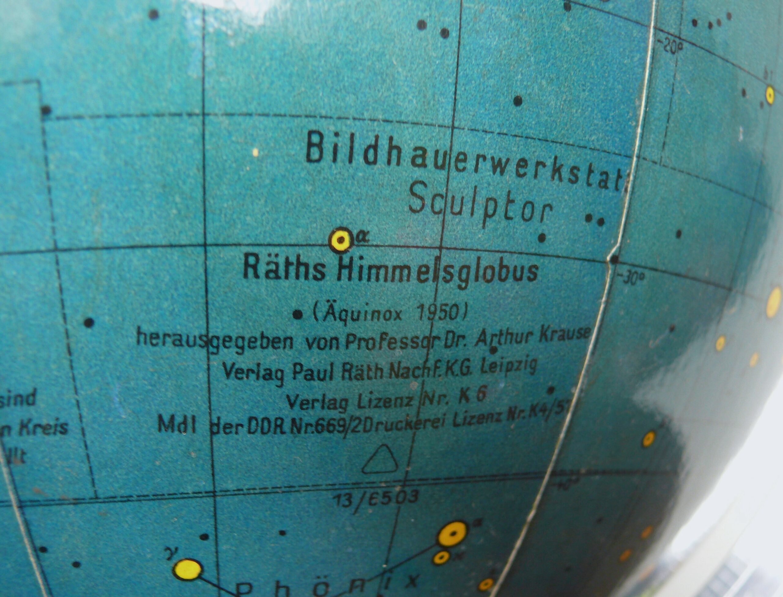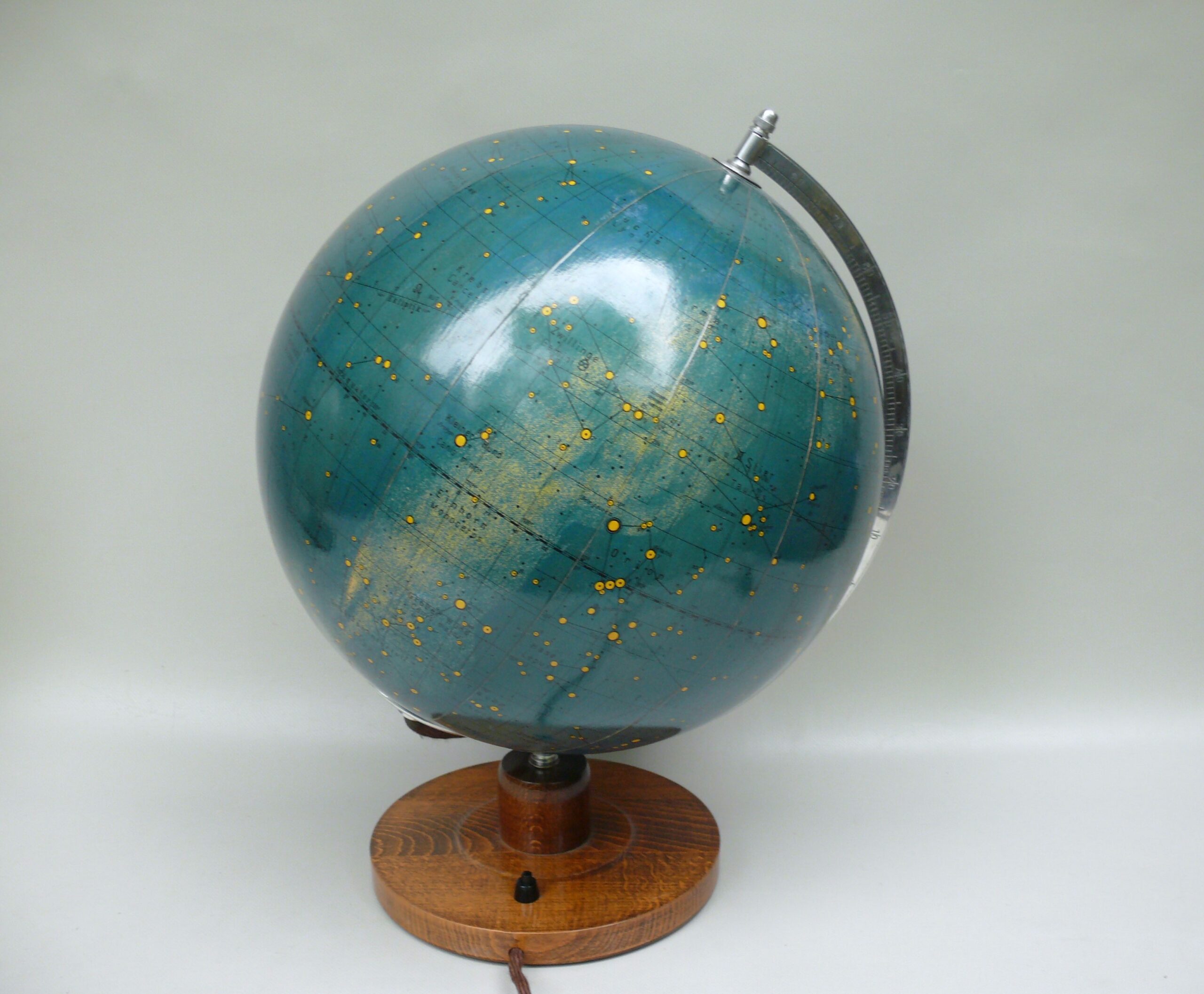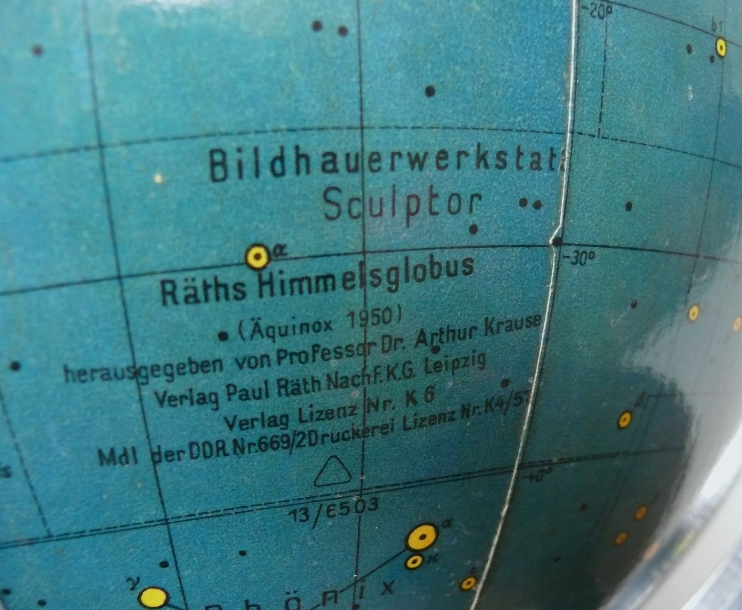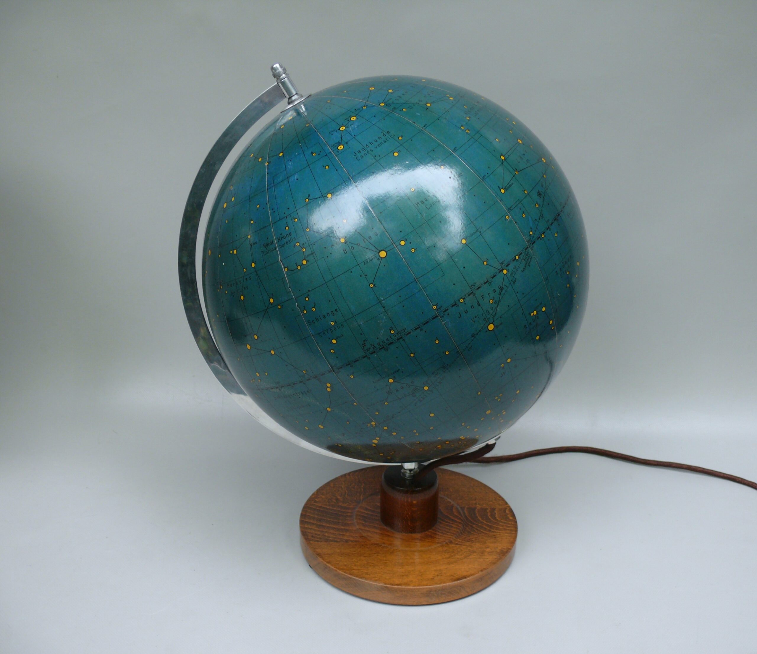 G19 – Räths Himmelsglobus, Äquinox 1950, Kugel Glas handkaschiert, Sockel Holz, Aluminium, beleuchtet