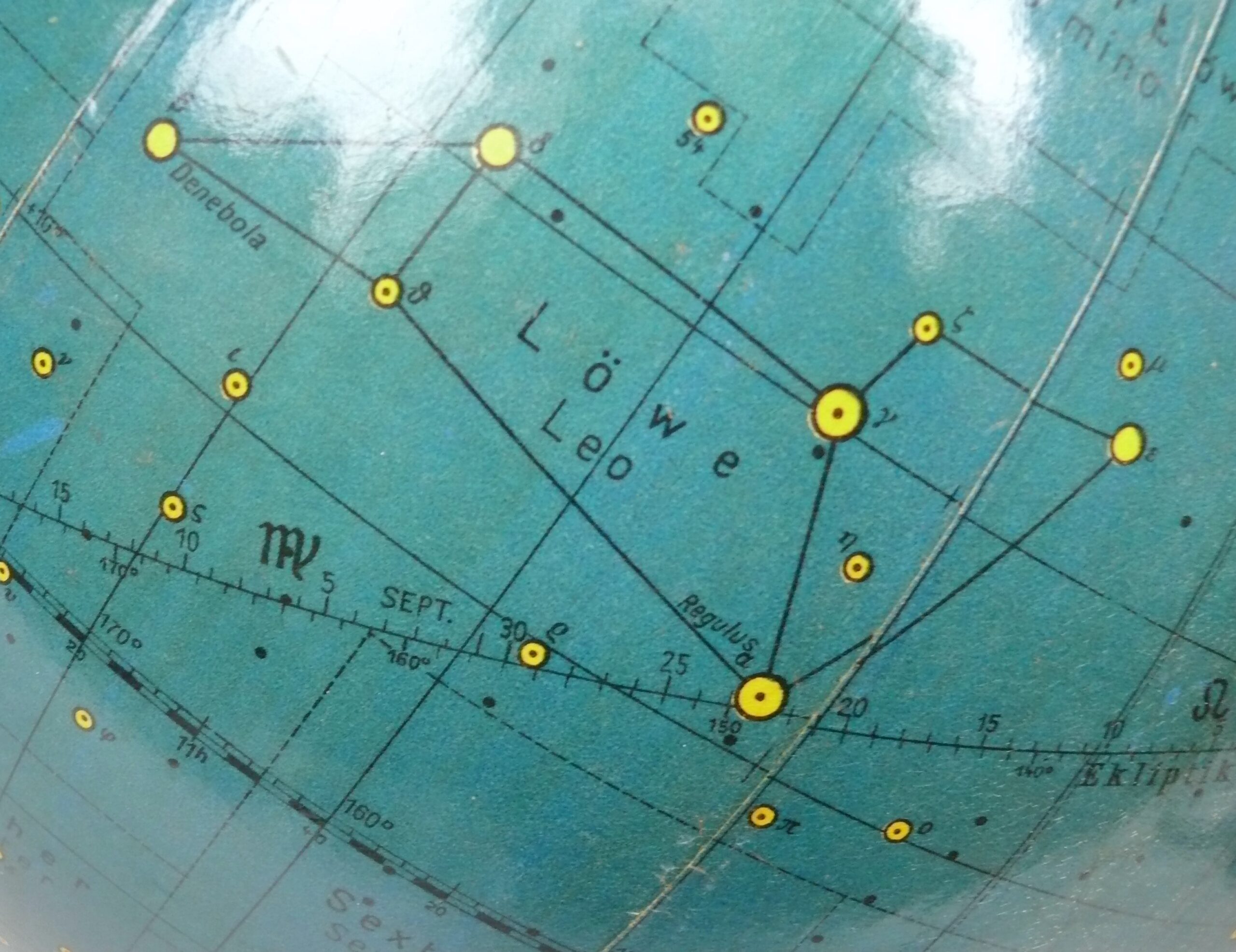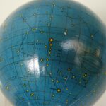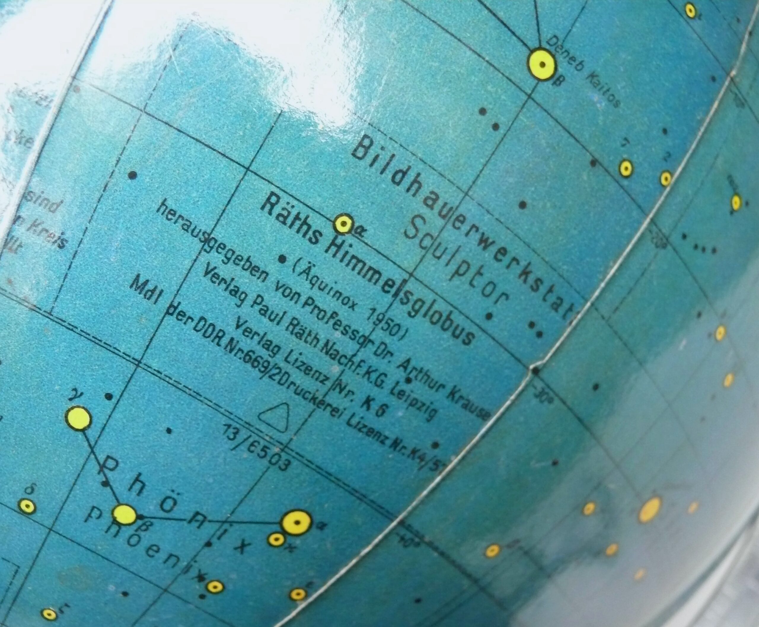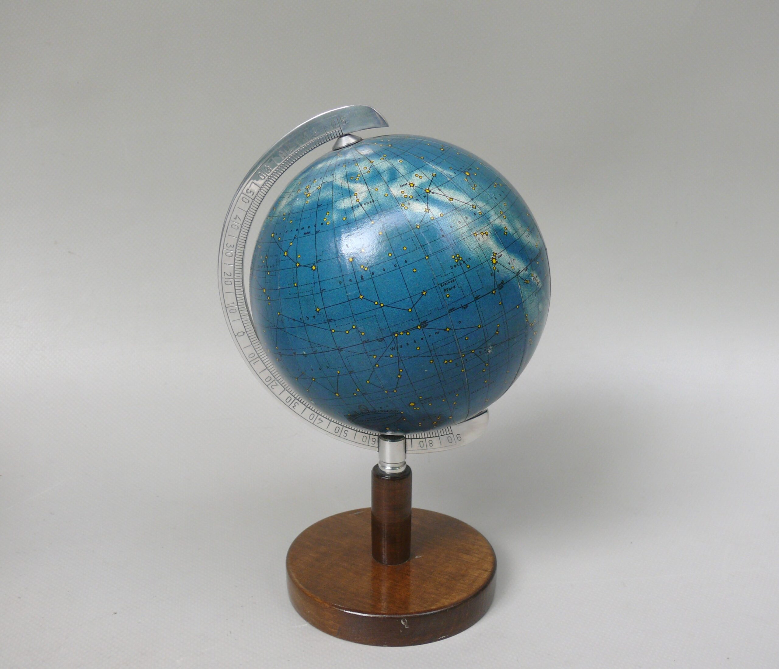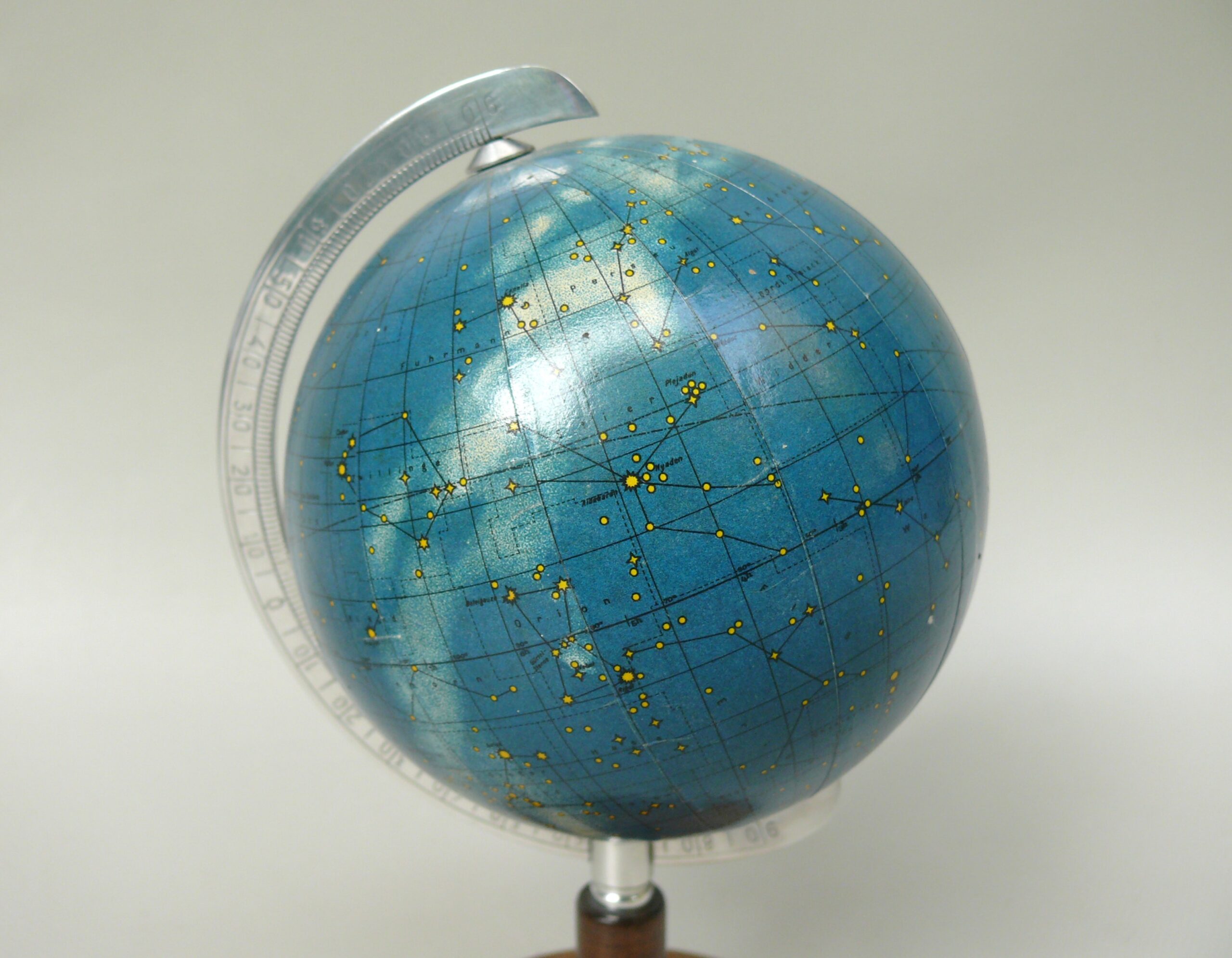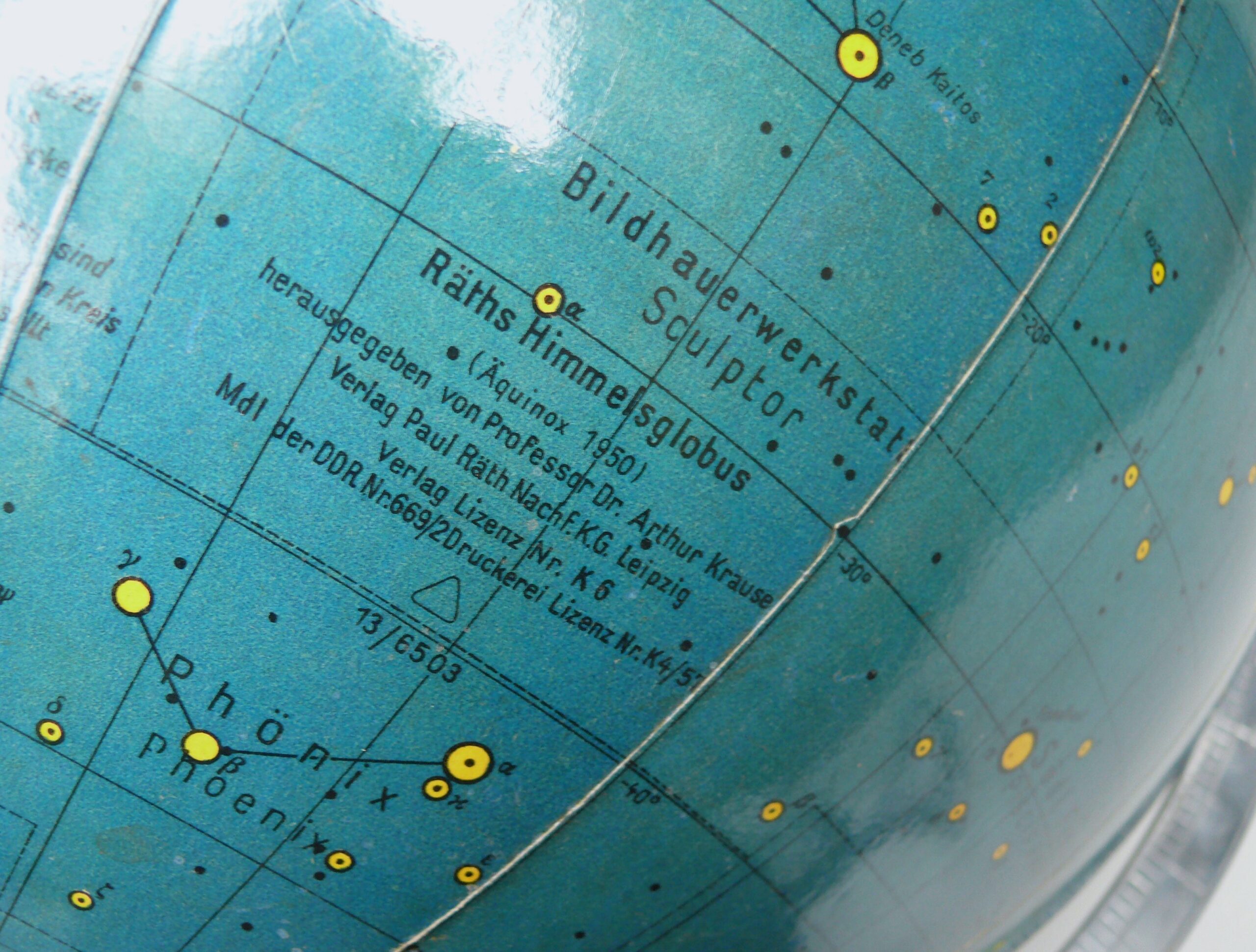 G19 – Räths Himmelsglobus, Äquinox 1950, Kugel Glas handkaschiert, Sockel Holz, Aluminium, beleuchtet