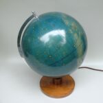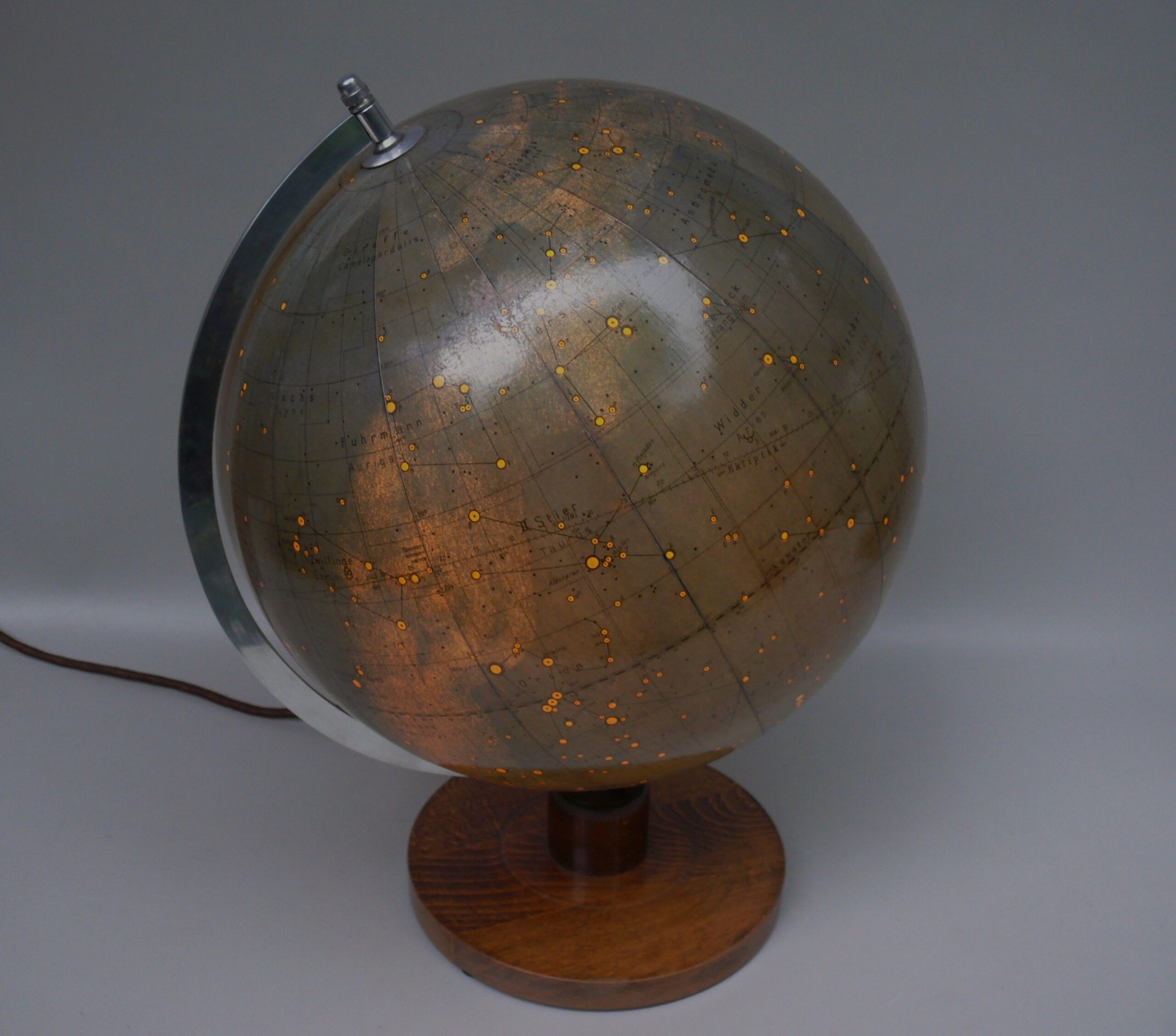 G20 – SOLD – Columbus Himmelsglobus, 50er/60er Jahre, Sockel Holz, verchromt, Kugel Glas handkaschiert, beleuchtet