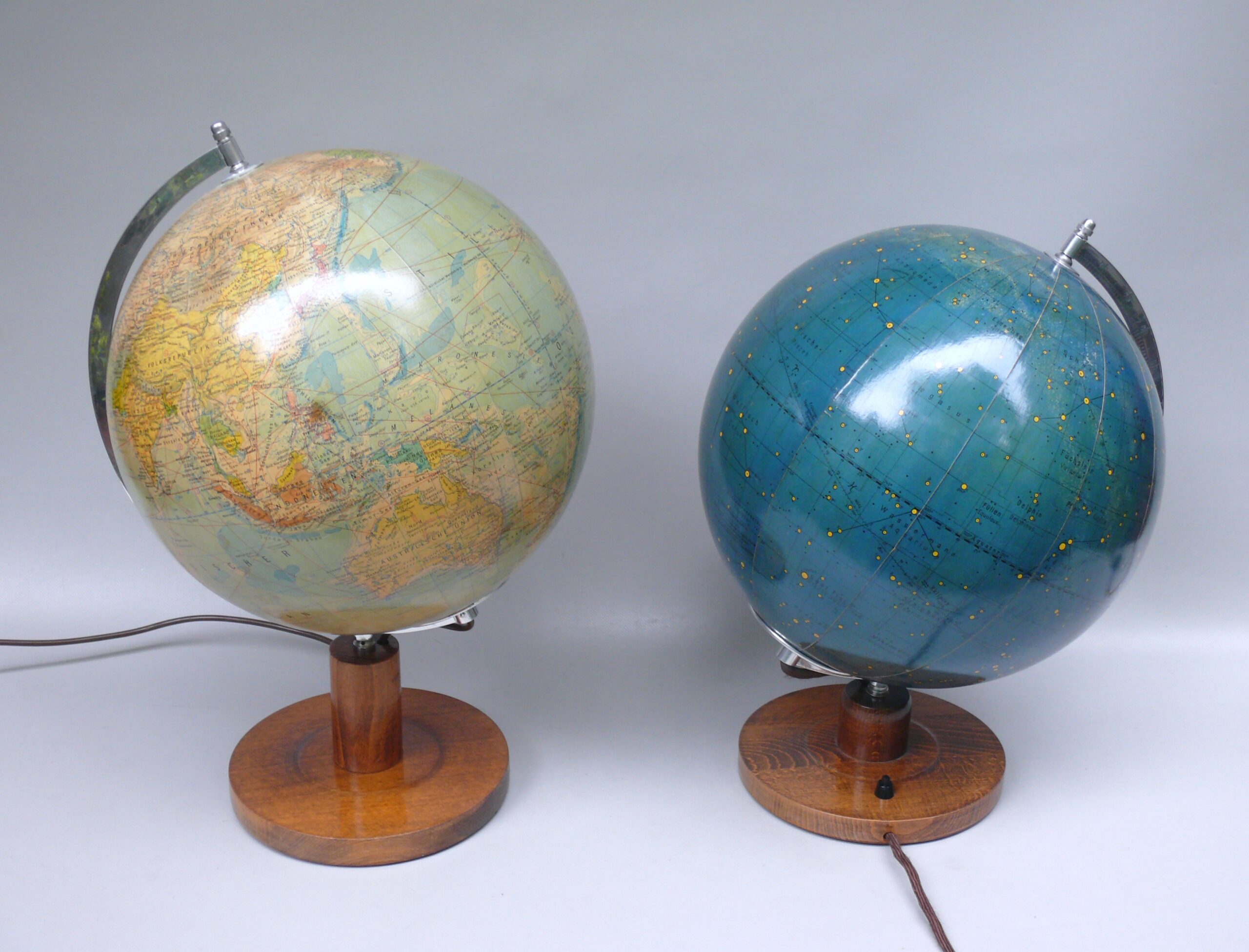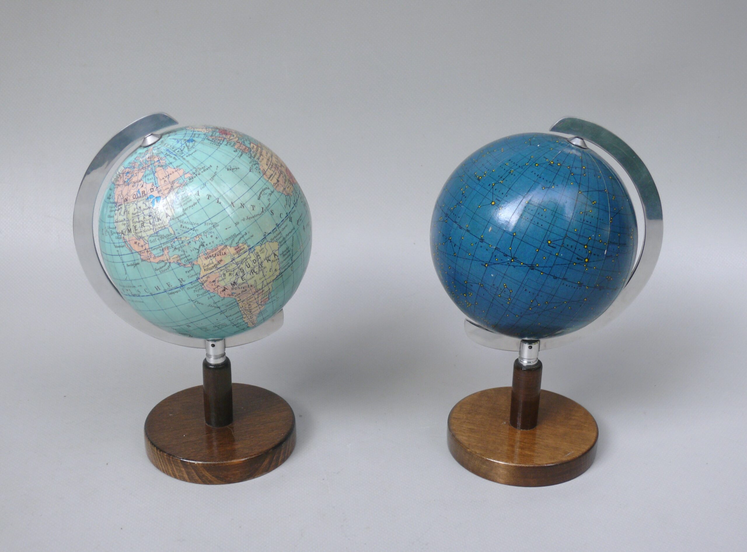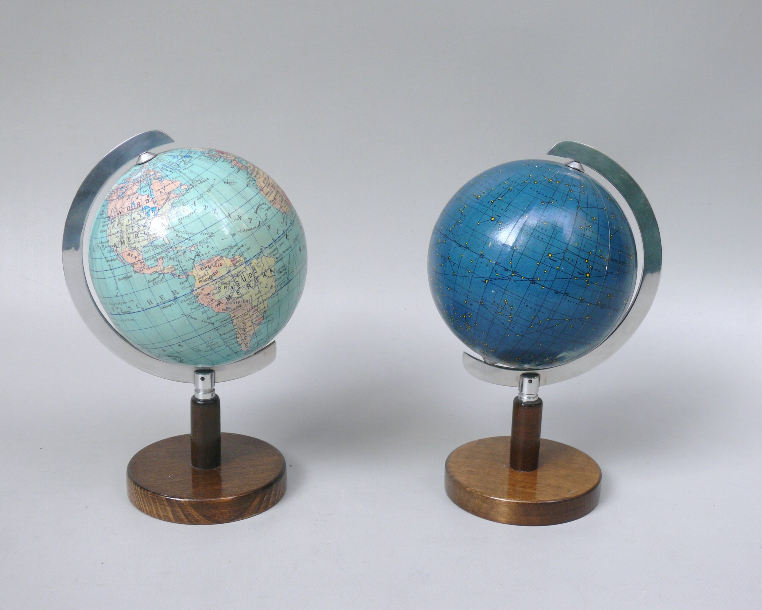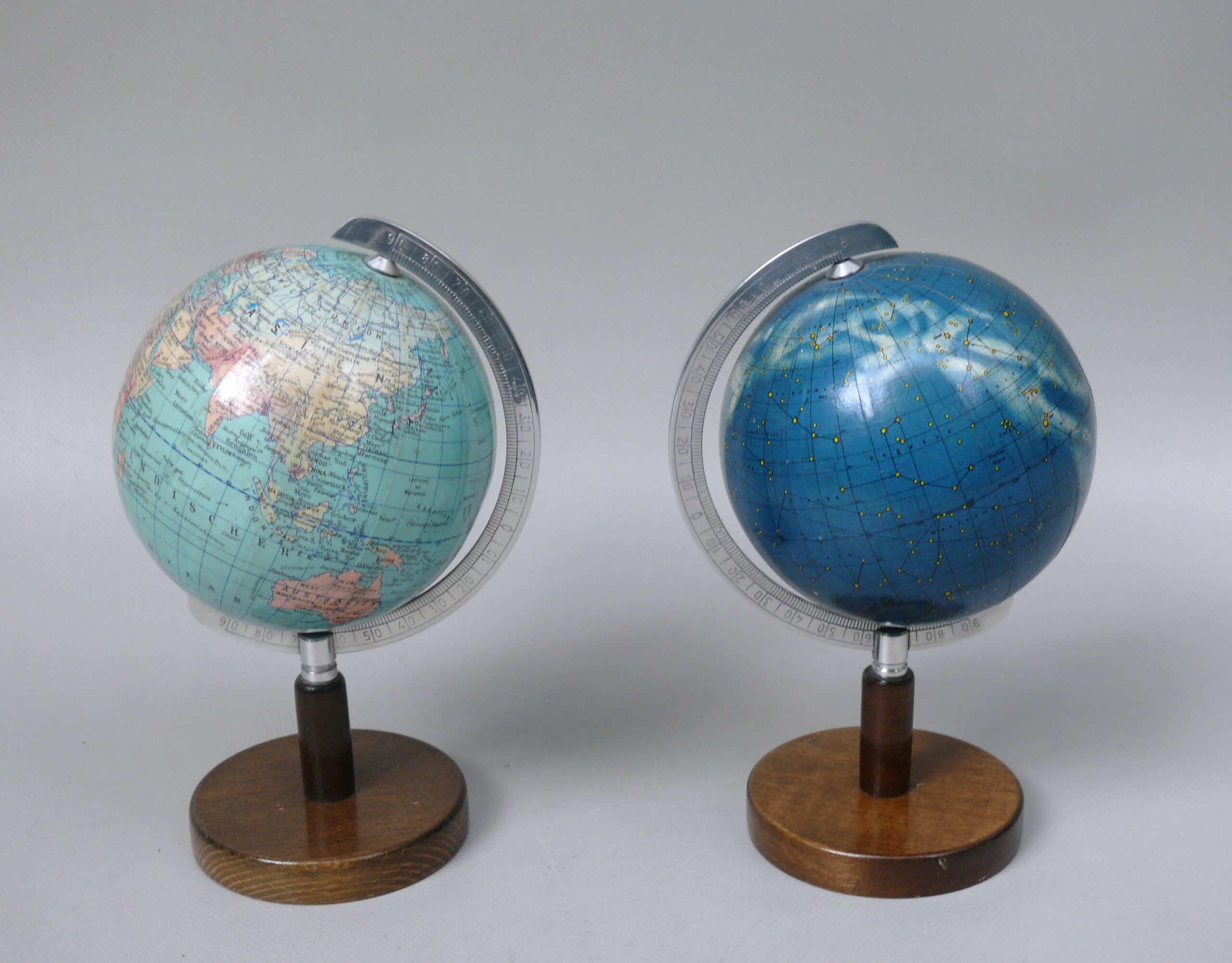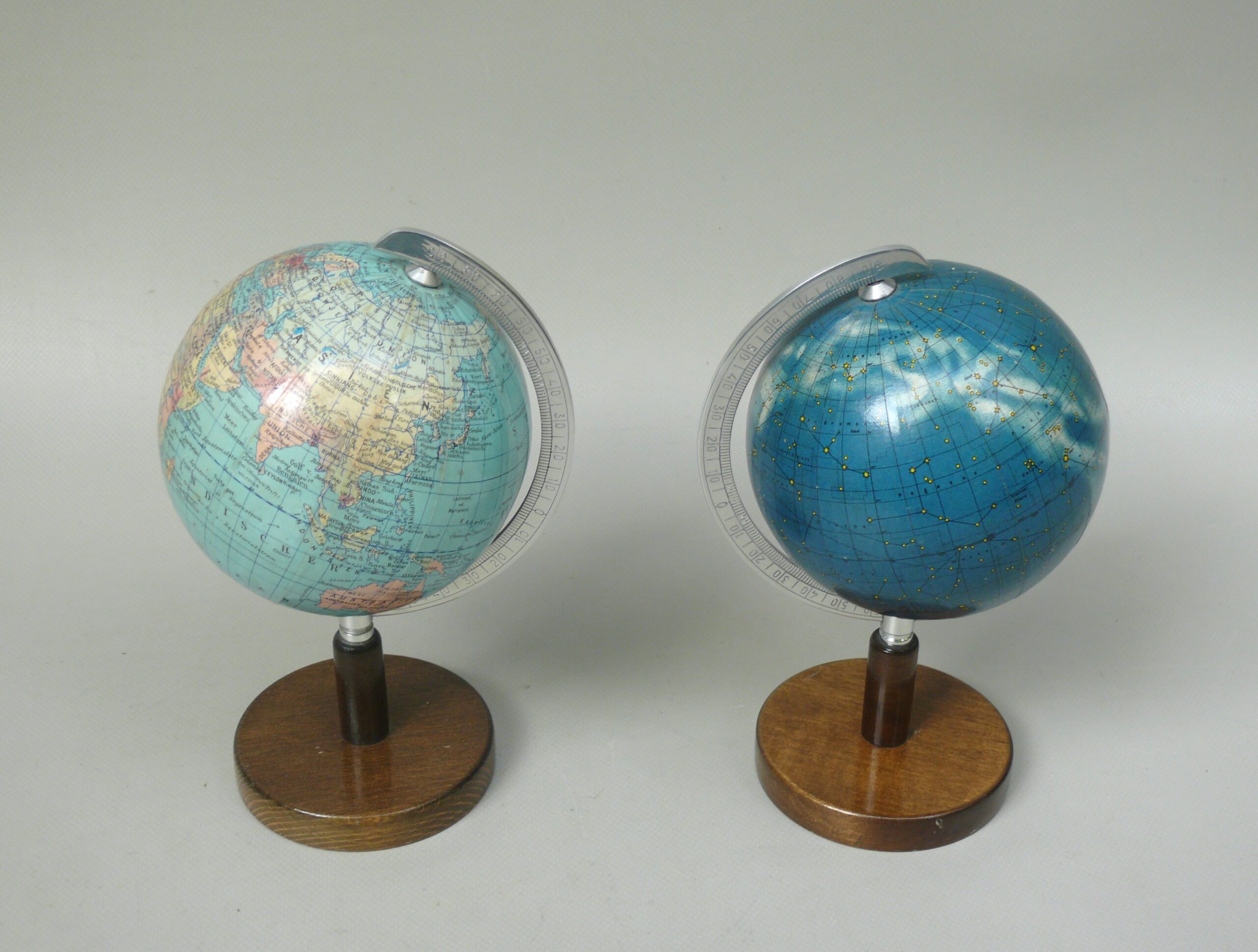 G56 – 1 Paar Schülergloben, Columbus Erdglobus und Columbus Himmelsglobus, 50er/60er Jahre, Sockel Holz, Kugel Pappe handkaschiert