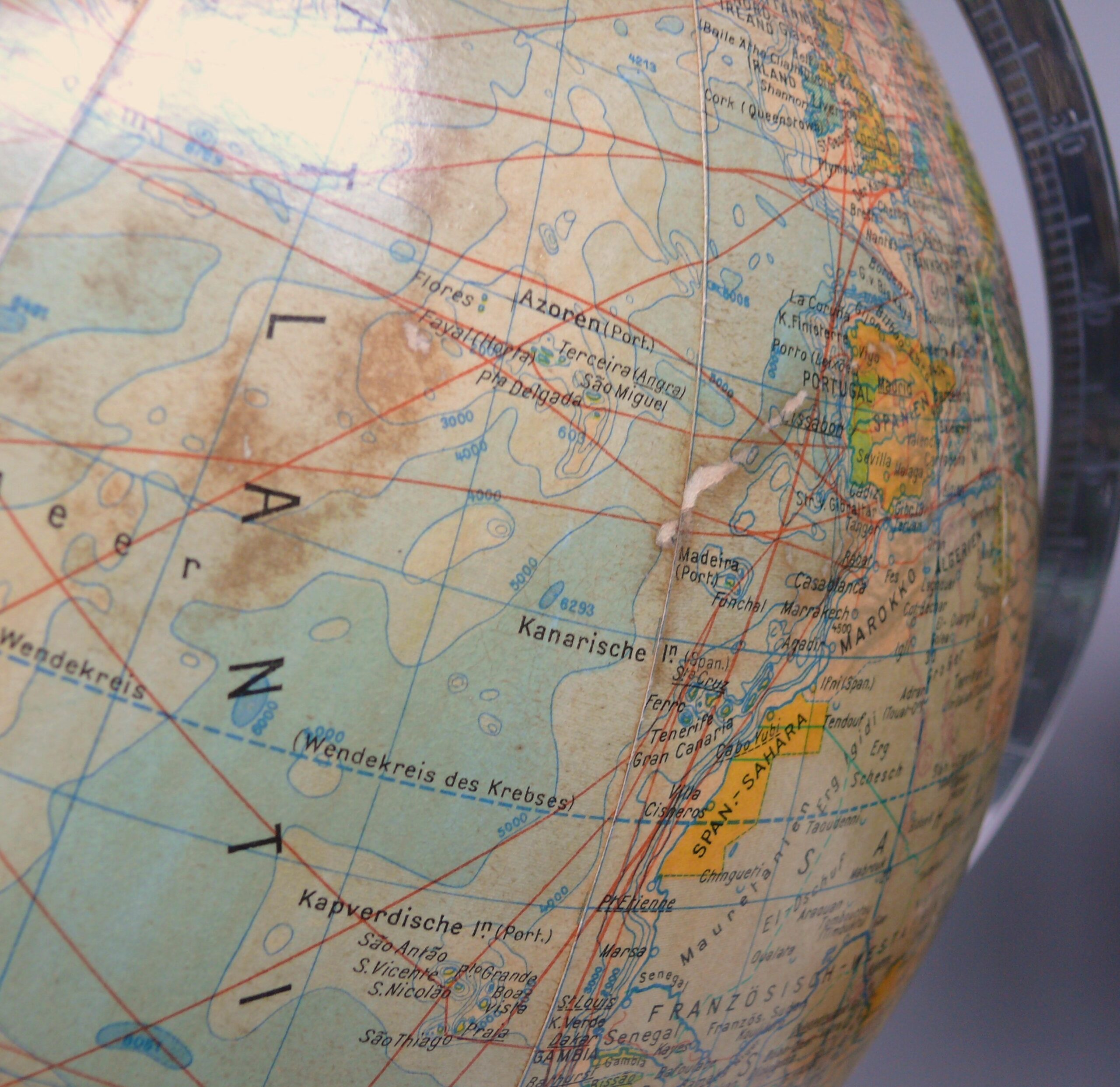 Der Globus hat Patina: Nord- und Südpol berieben, Fehlstelle 5 cm x 5 cm sowie eine weitere beriebene Stelle.
