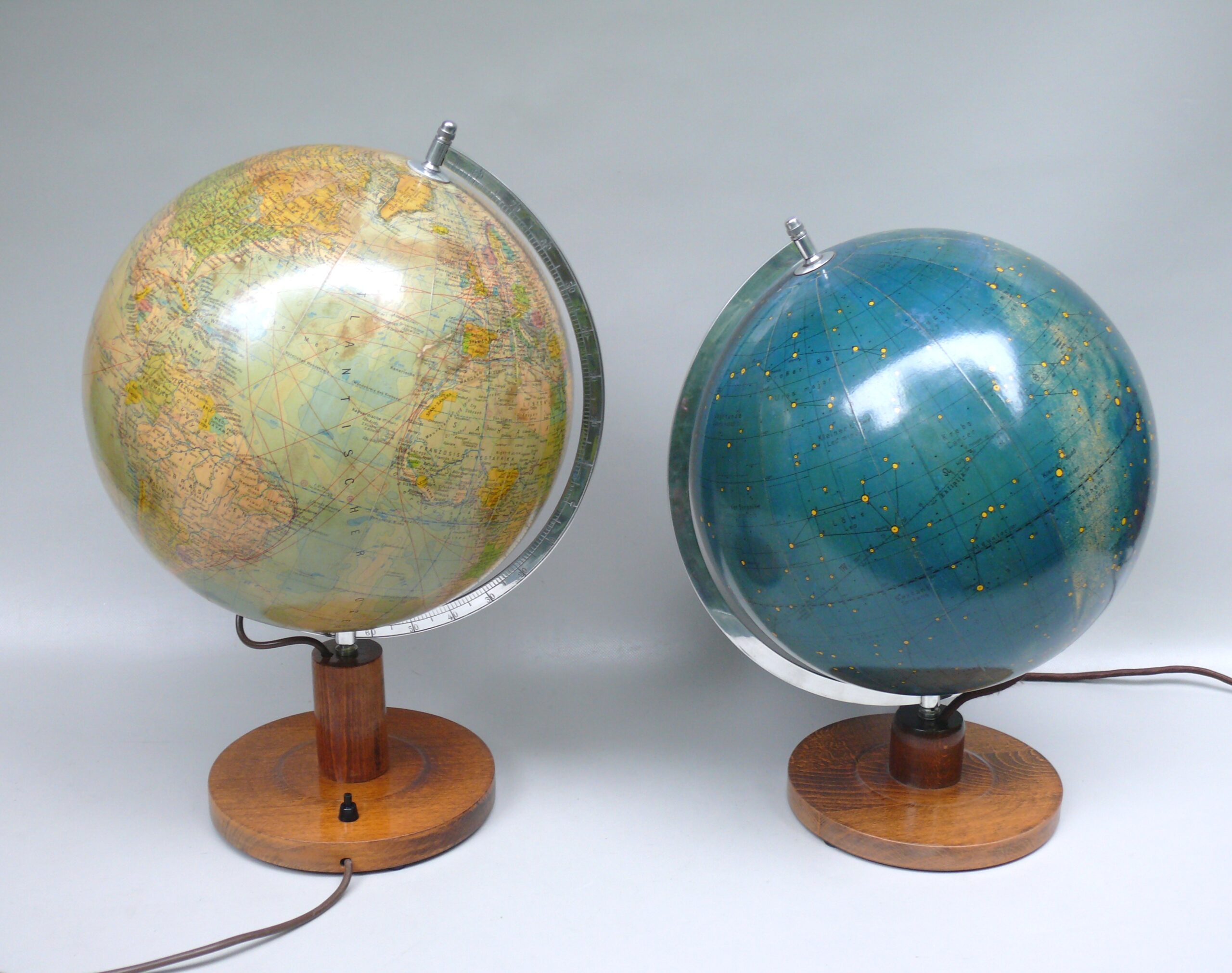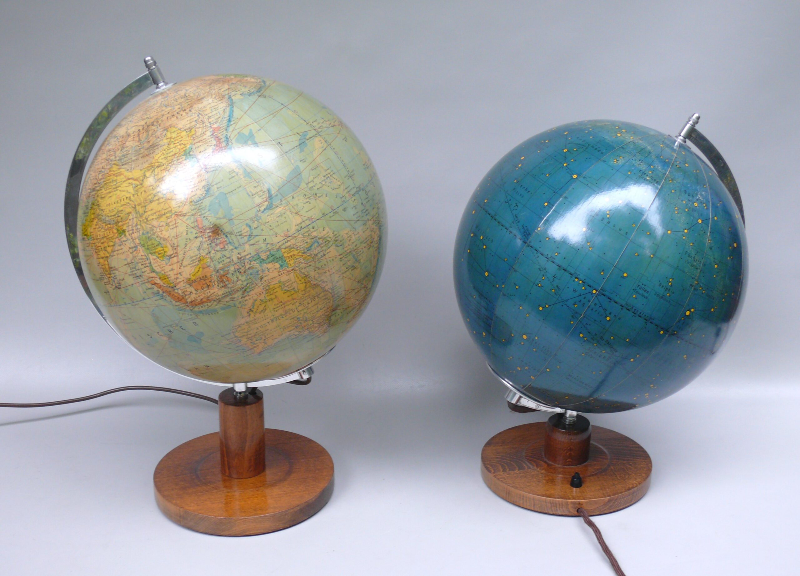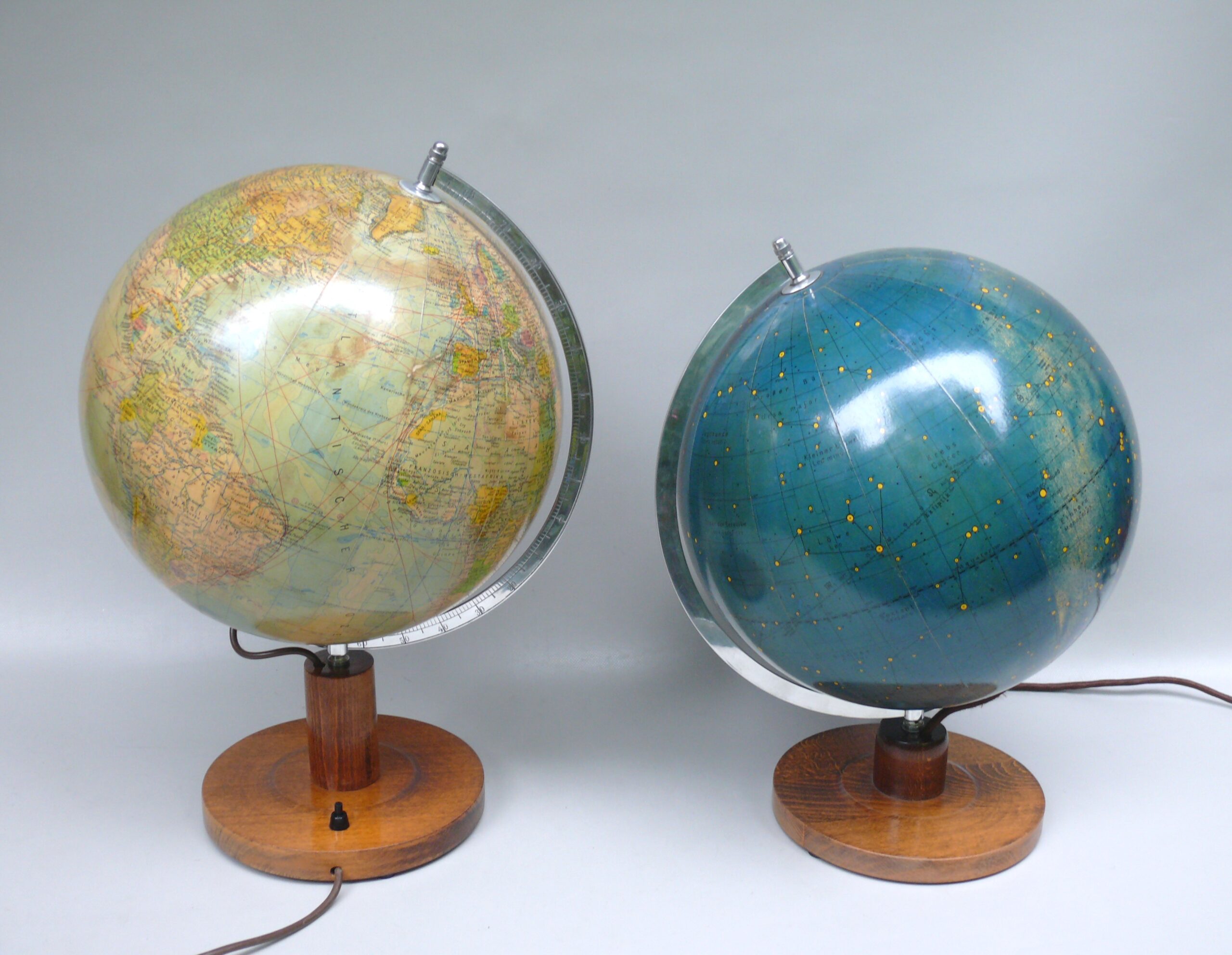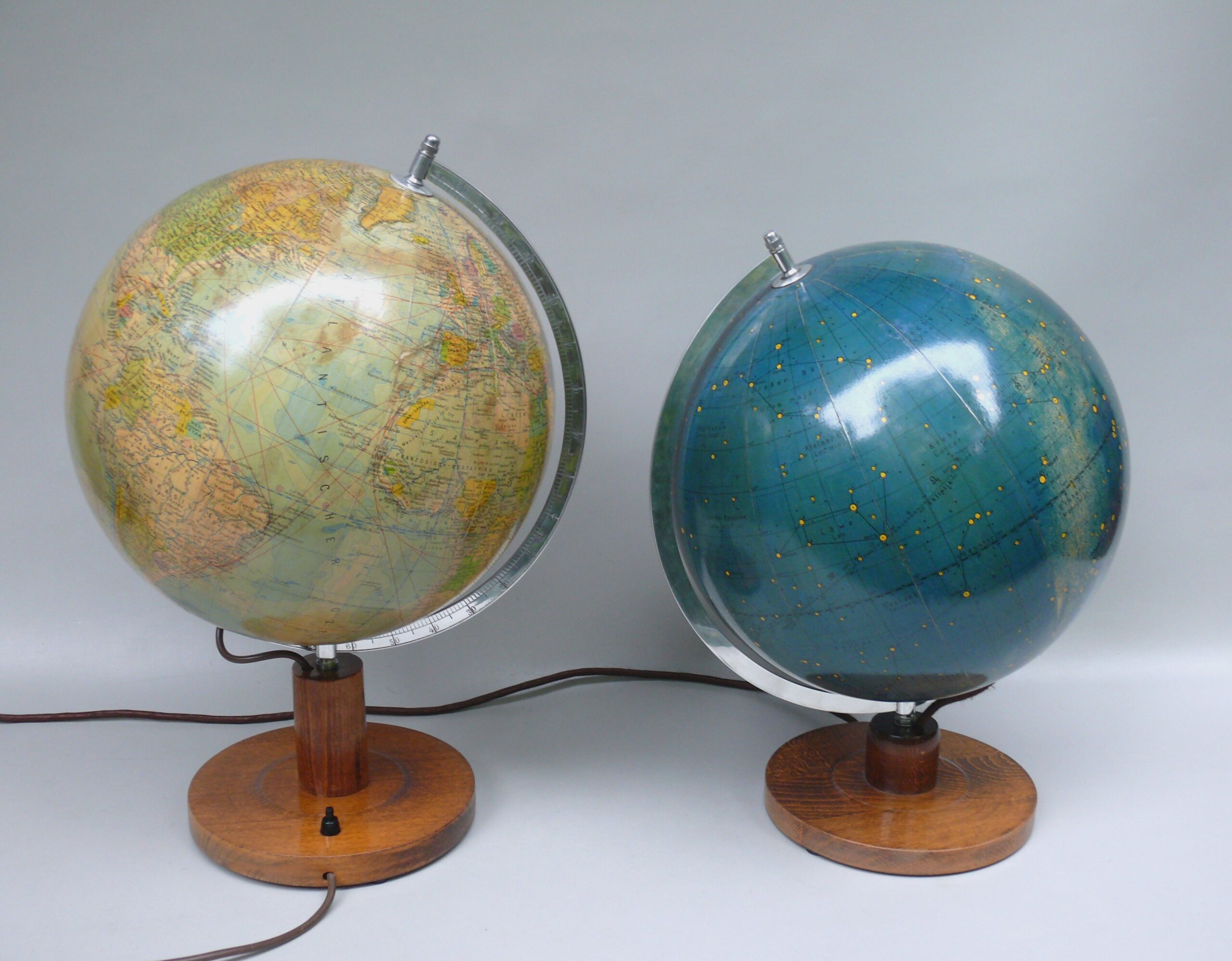 G36 – 1 Paar Globen, Columbus Duo Erdglobus (beleuchtet) und Columbus Himmelsglobus (Pappkugel), 50er Jahre, Streamline-Design