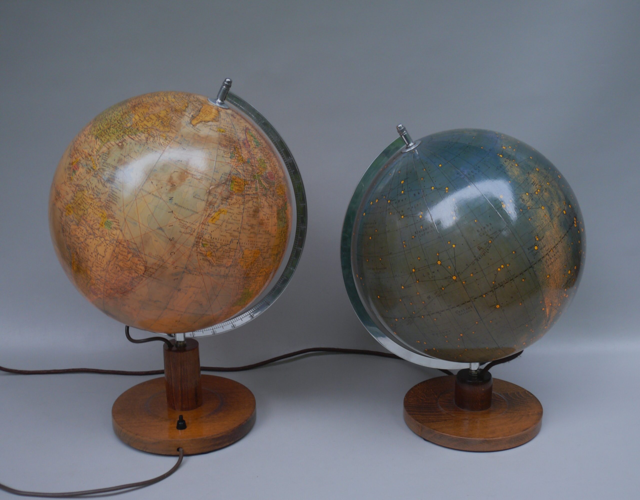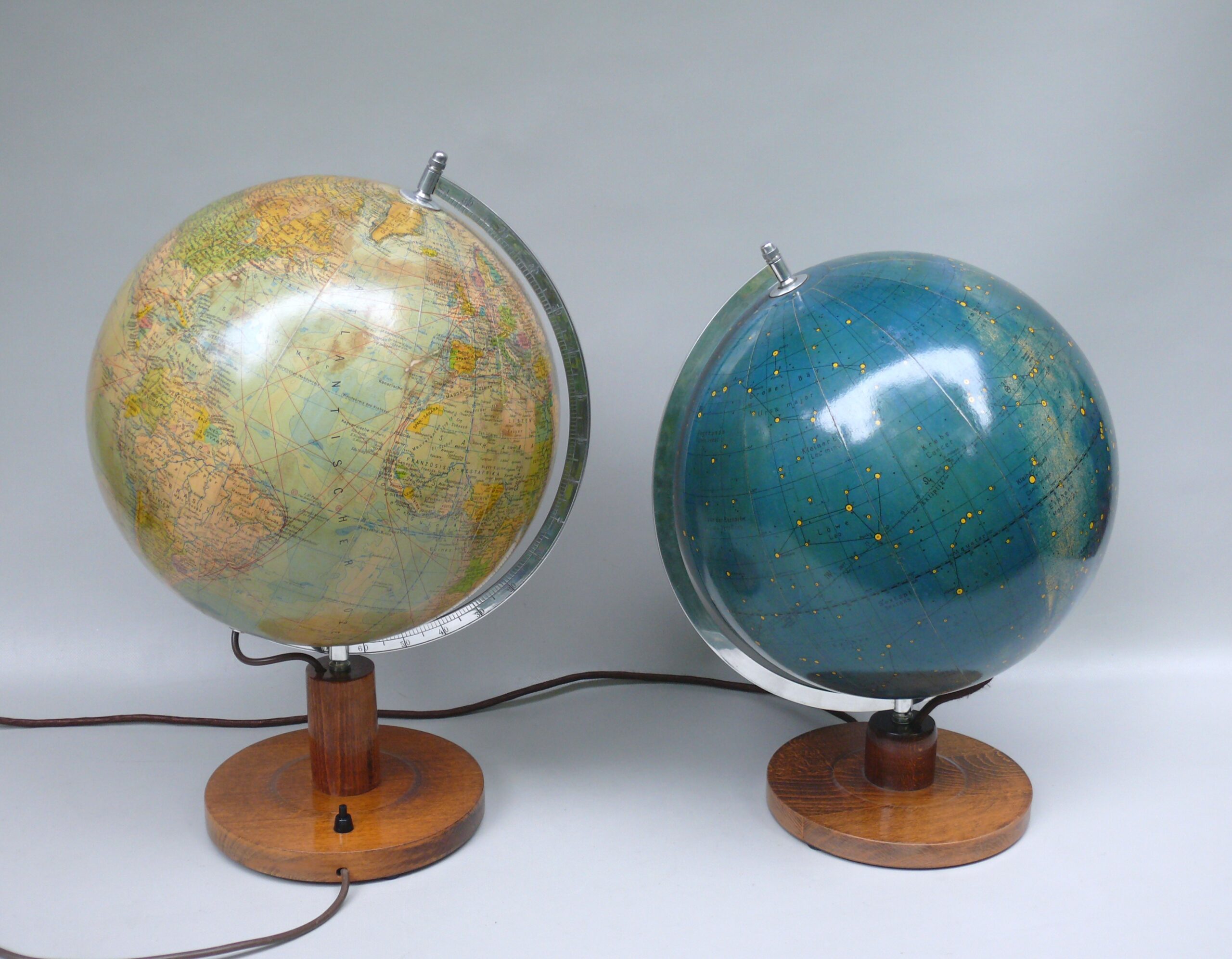 Es handelt sich bei diesen beiden Globen um die große Ausführung der beleuchteten Globen aus dieser Zeit. Sie sind hochwertig produziert, ganz im Stil der Firma Columbus.