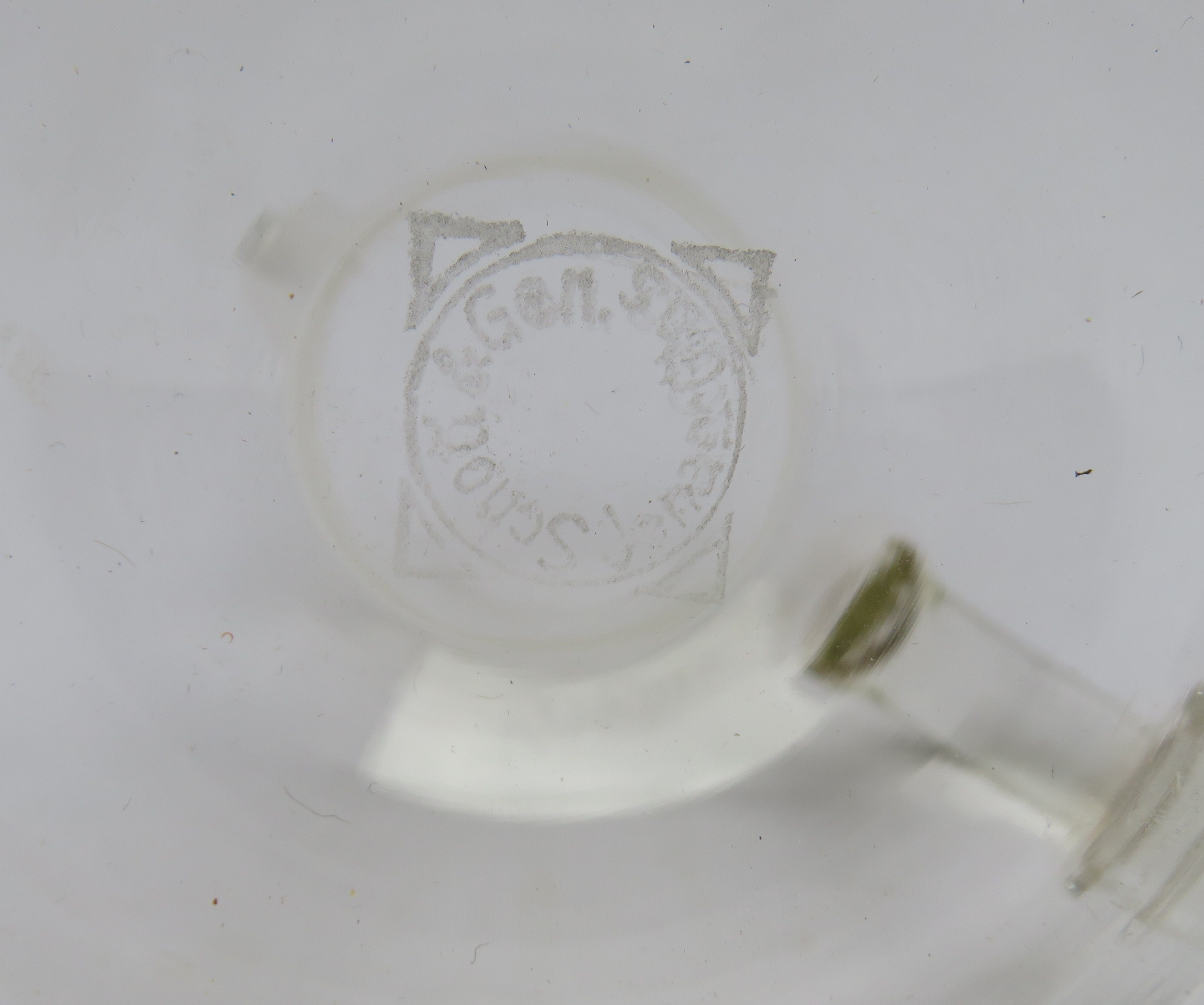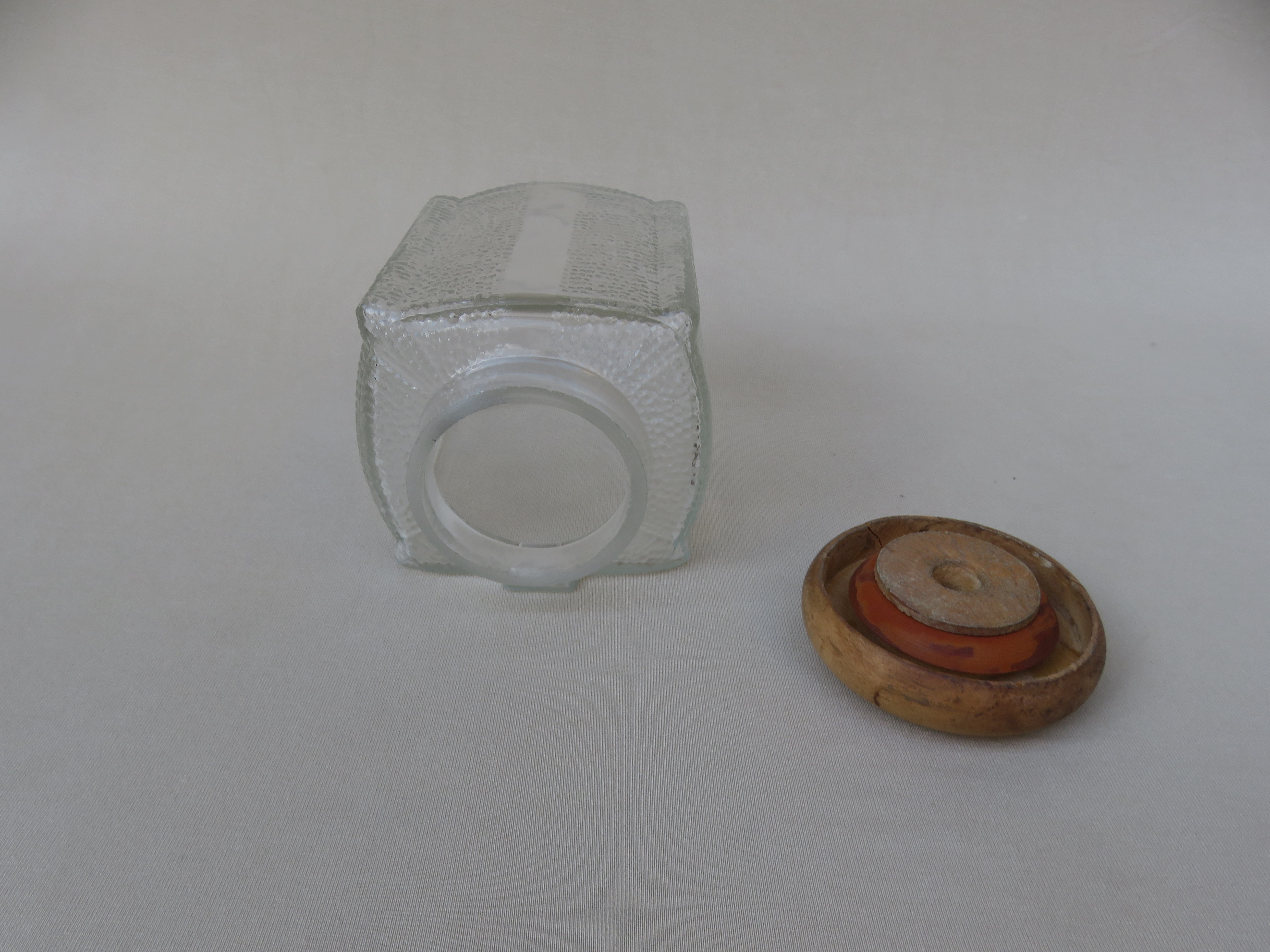 Der Einfülltrichter ist aus strukturiertem Peßglas, bekannt vor allem für Glasschütten, die in den Küchenschränken eingesetzt waren.
