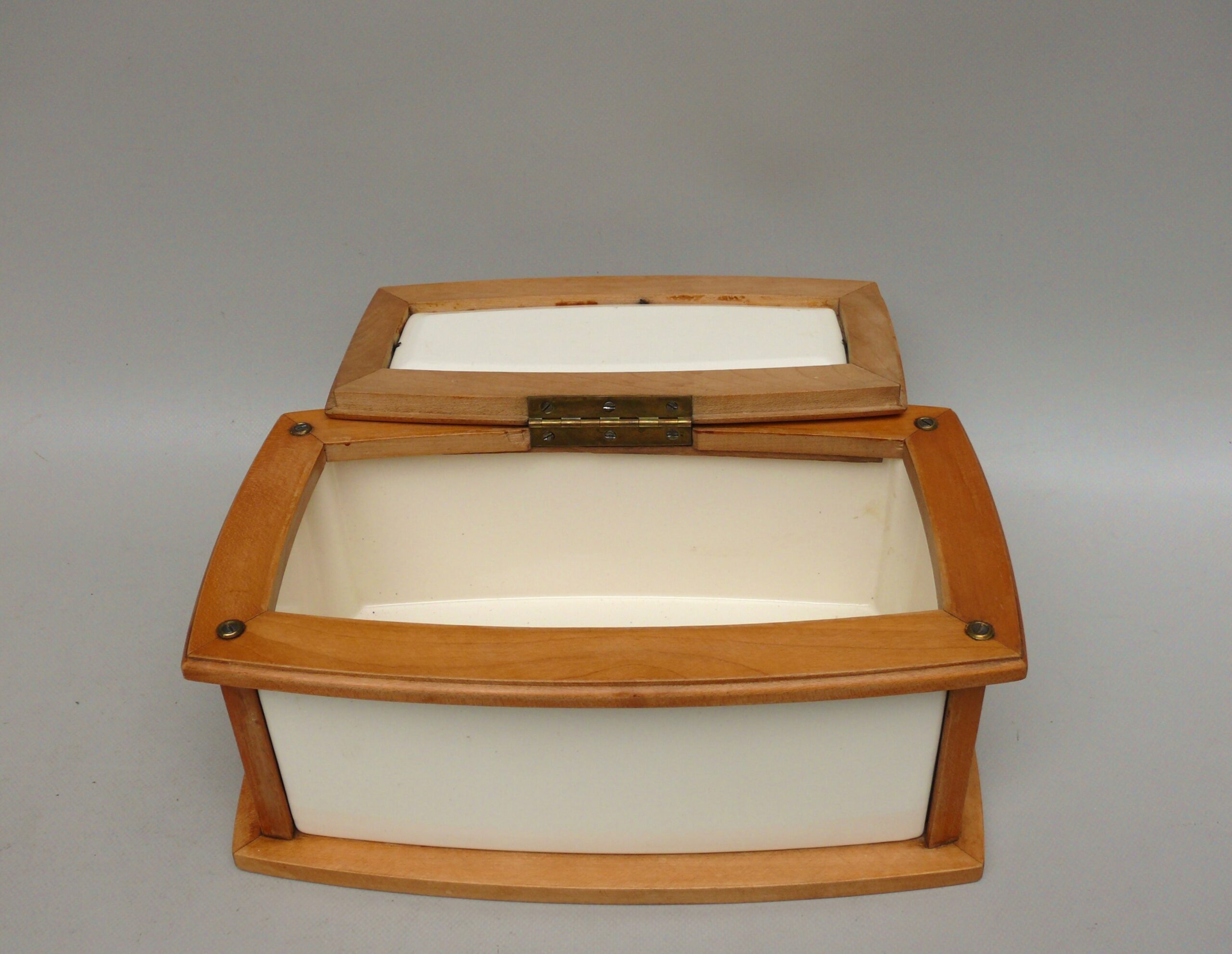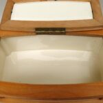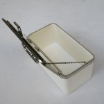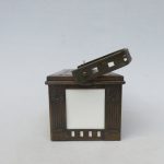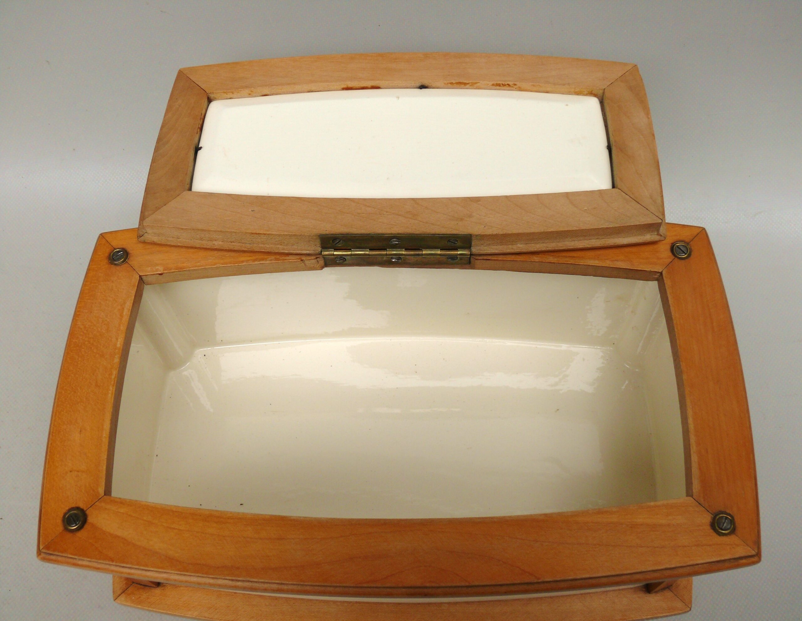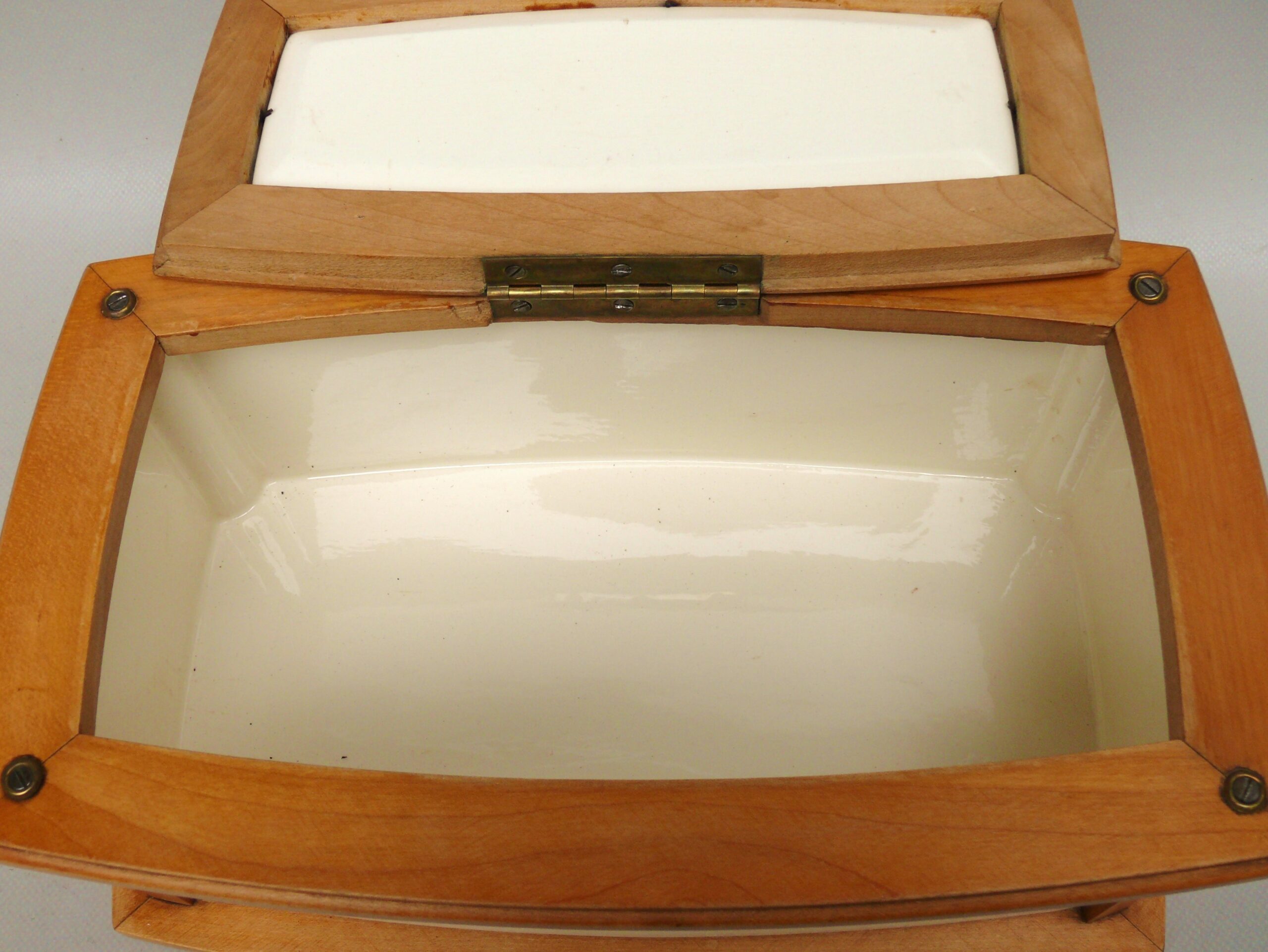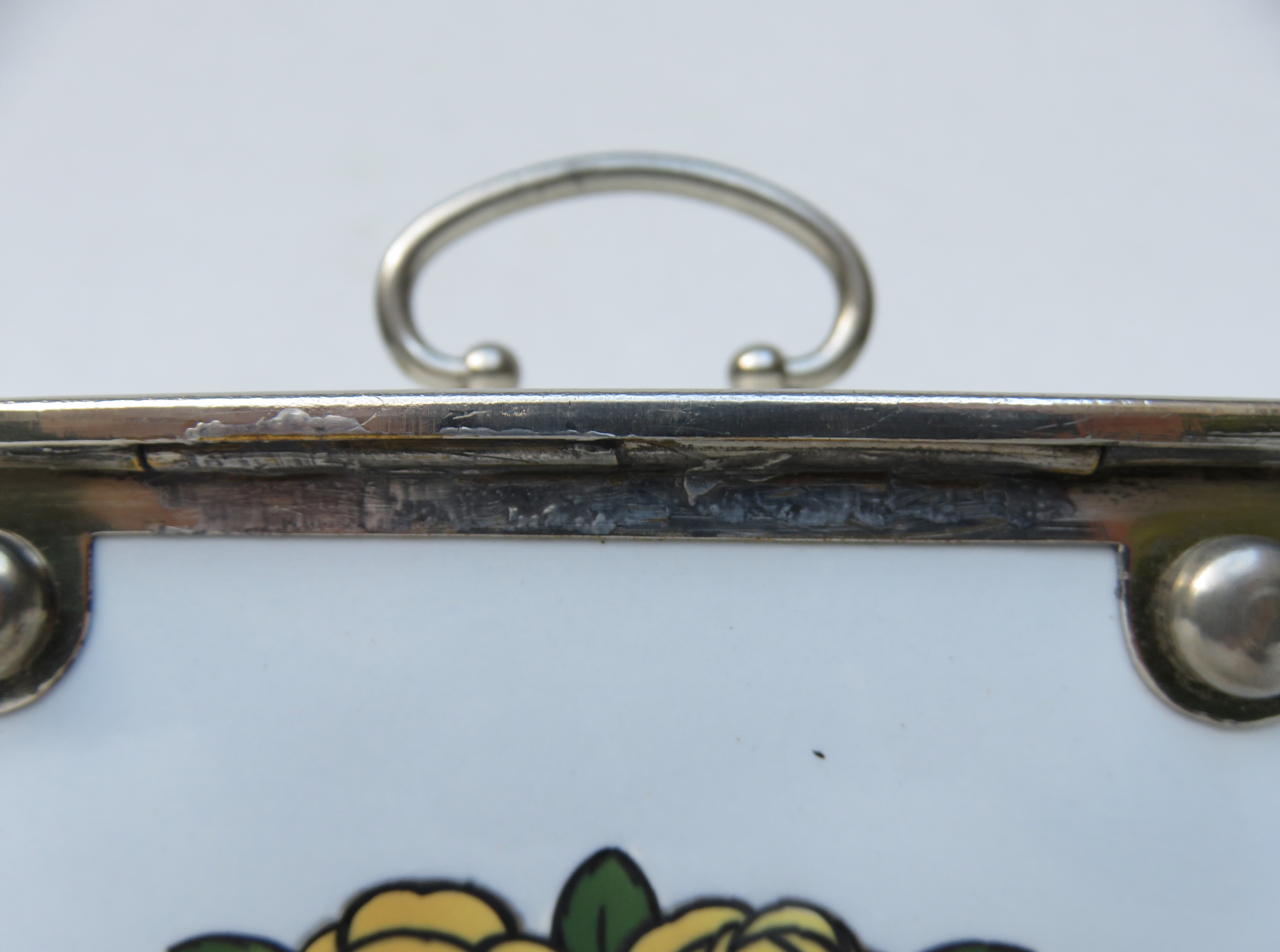 Das Scharnier wurde alt neu angelötet.Im Inneren am Dosenboden die für Keramk typischen Craquelee mit leichten Verfärbung. Von außen an 2 Stellen ist die Lasur etwas rauh – siehe Fotos.Die Vernickelung hat leichte Gebrauchsspuren.