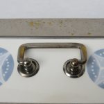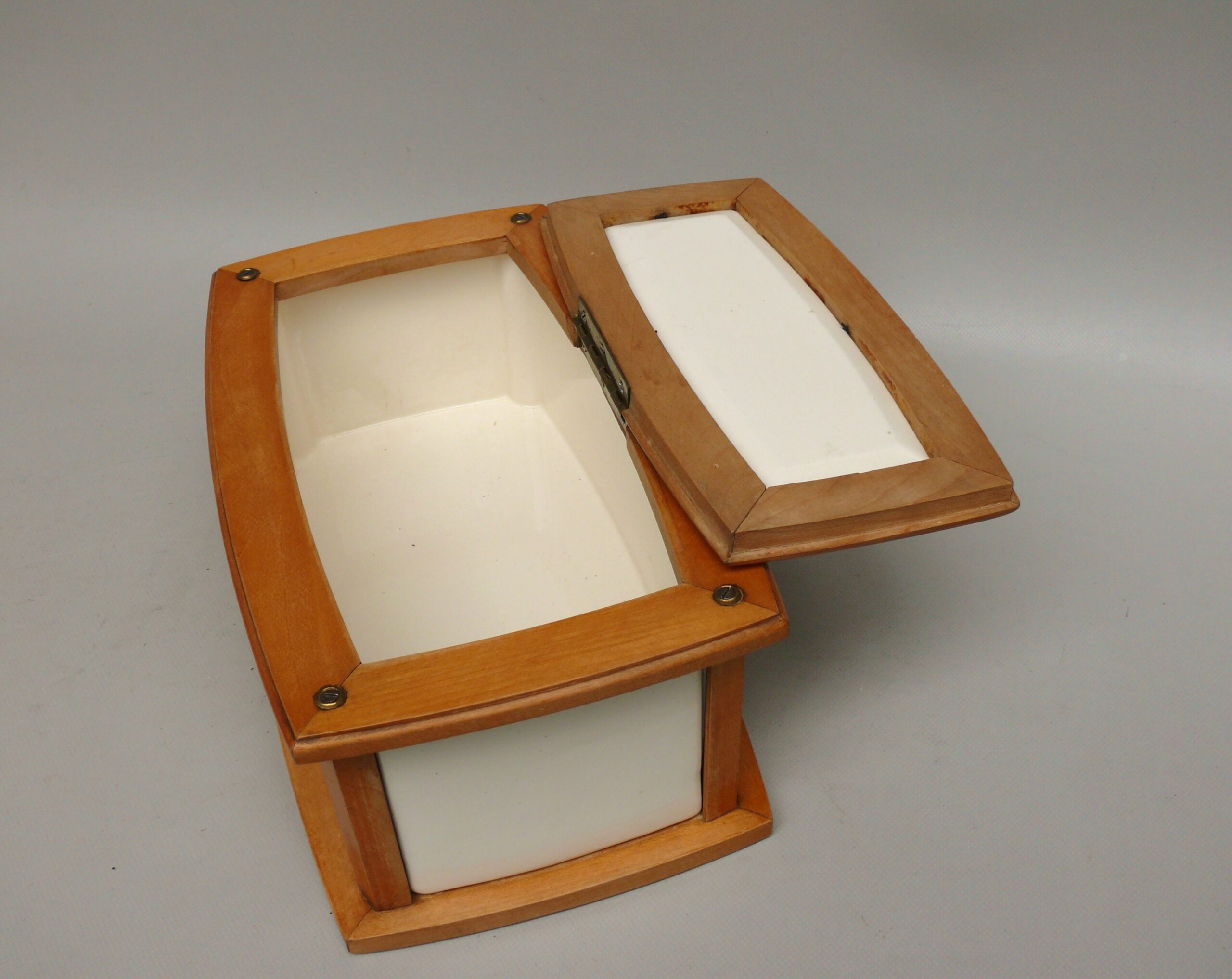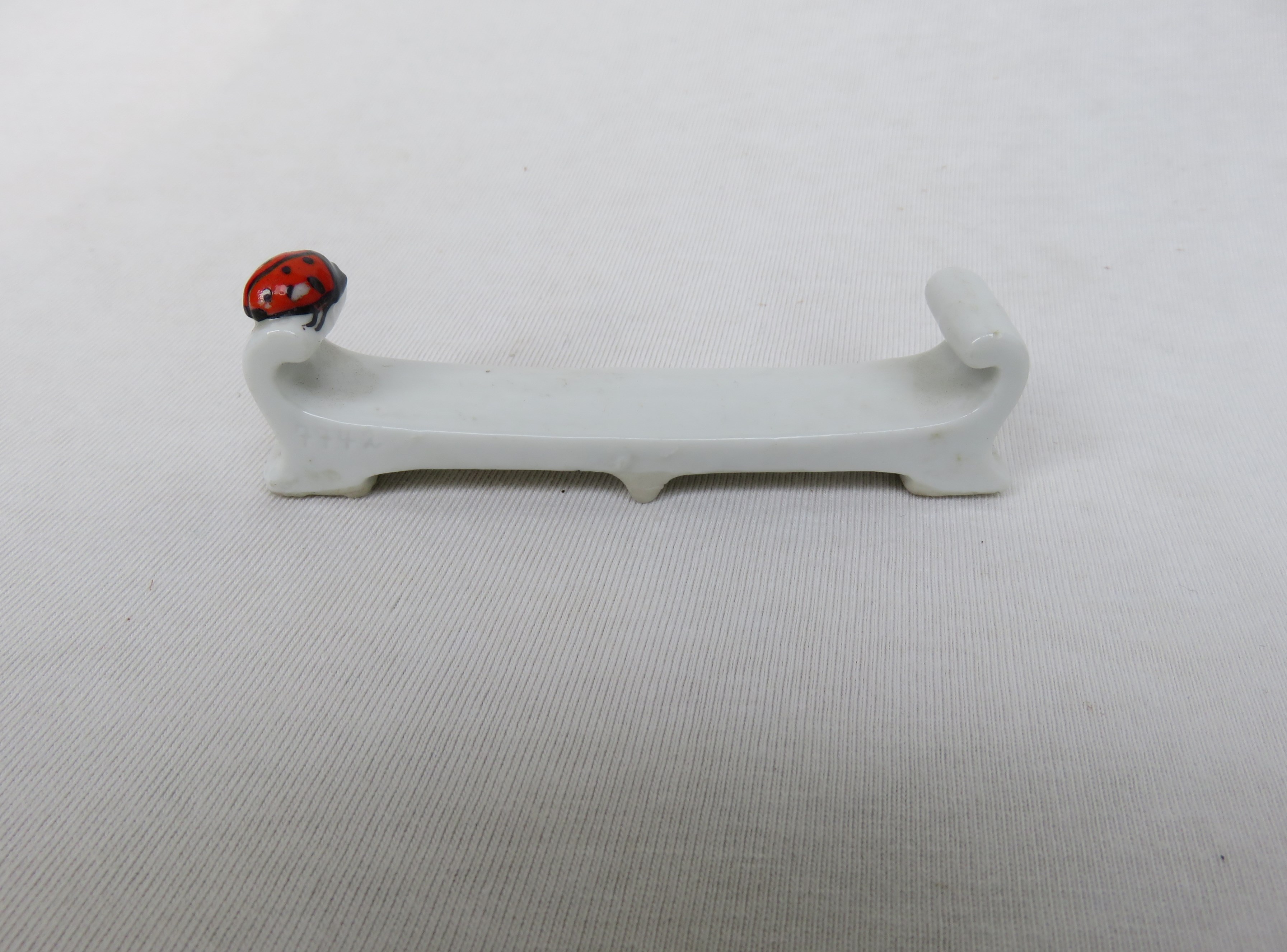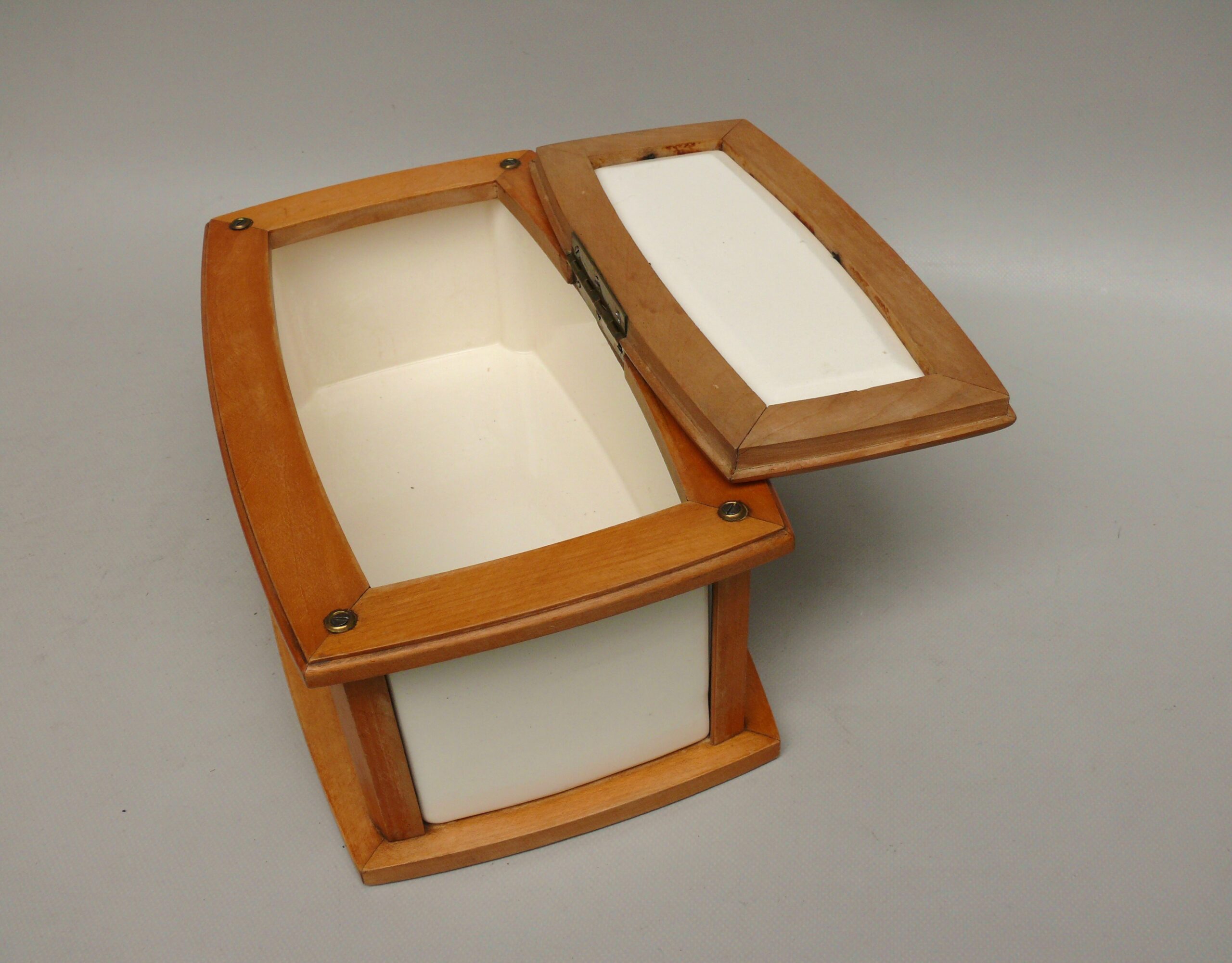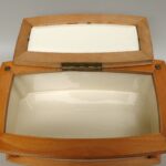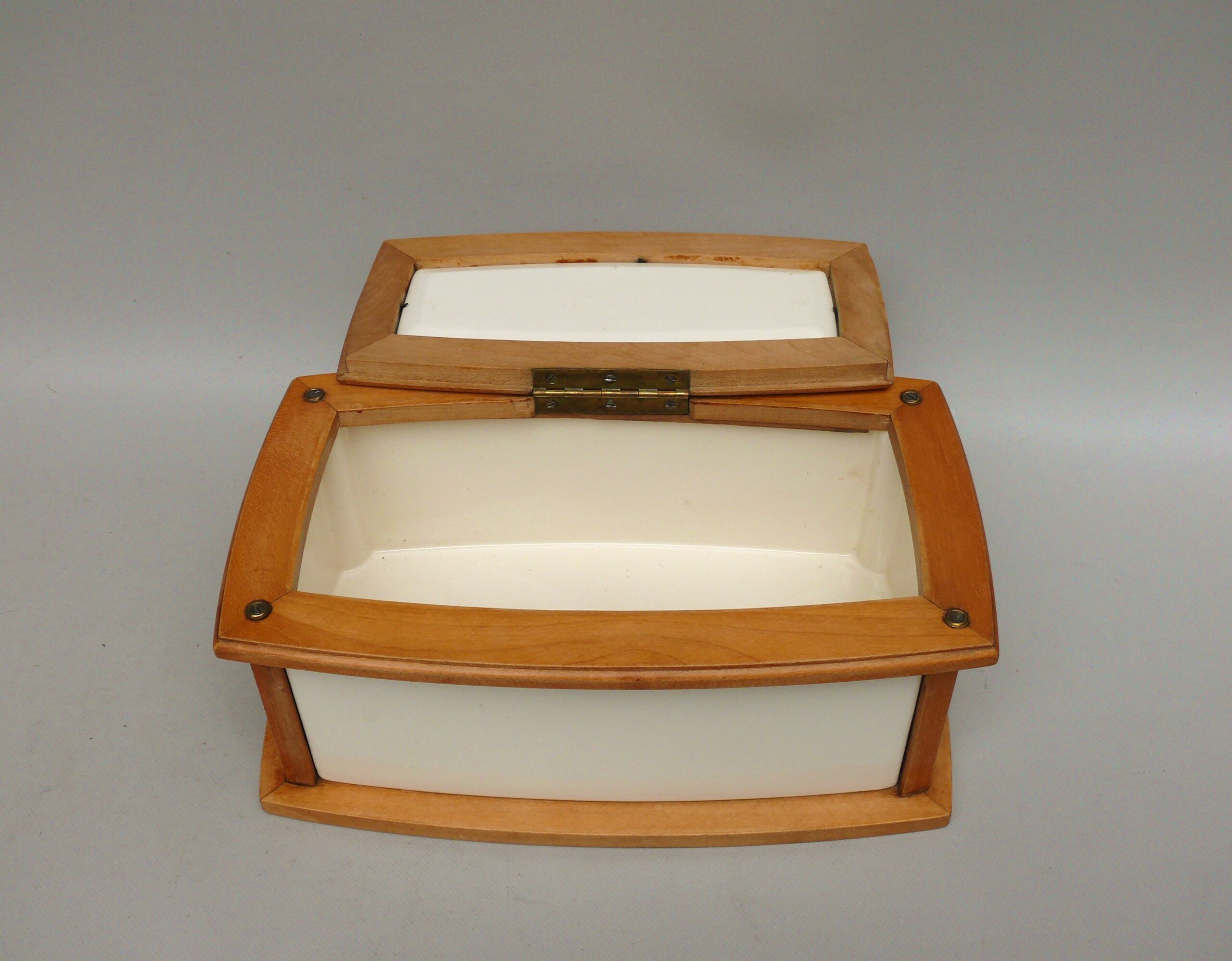 Das Scharnier wurde alt neu angelötet.Im Inneren am Dosenboden die für Keramk typischen Craquelee mit leichten Verfärbung. Von außen an 2 Stellen ist die Lasur etwas rauh – siehe Fotos.Die Vernickelung hat leichte Gebrauchsspuren.