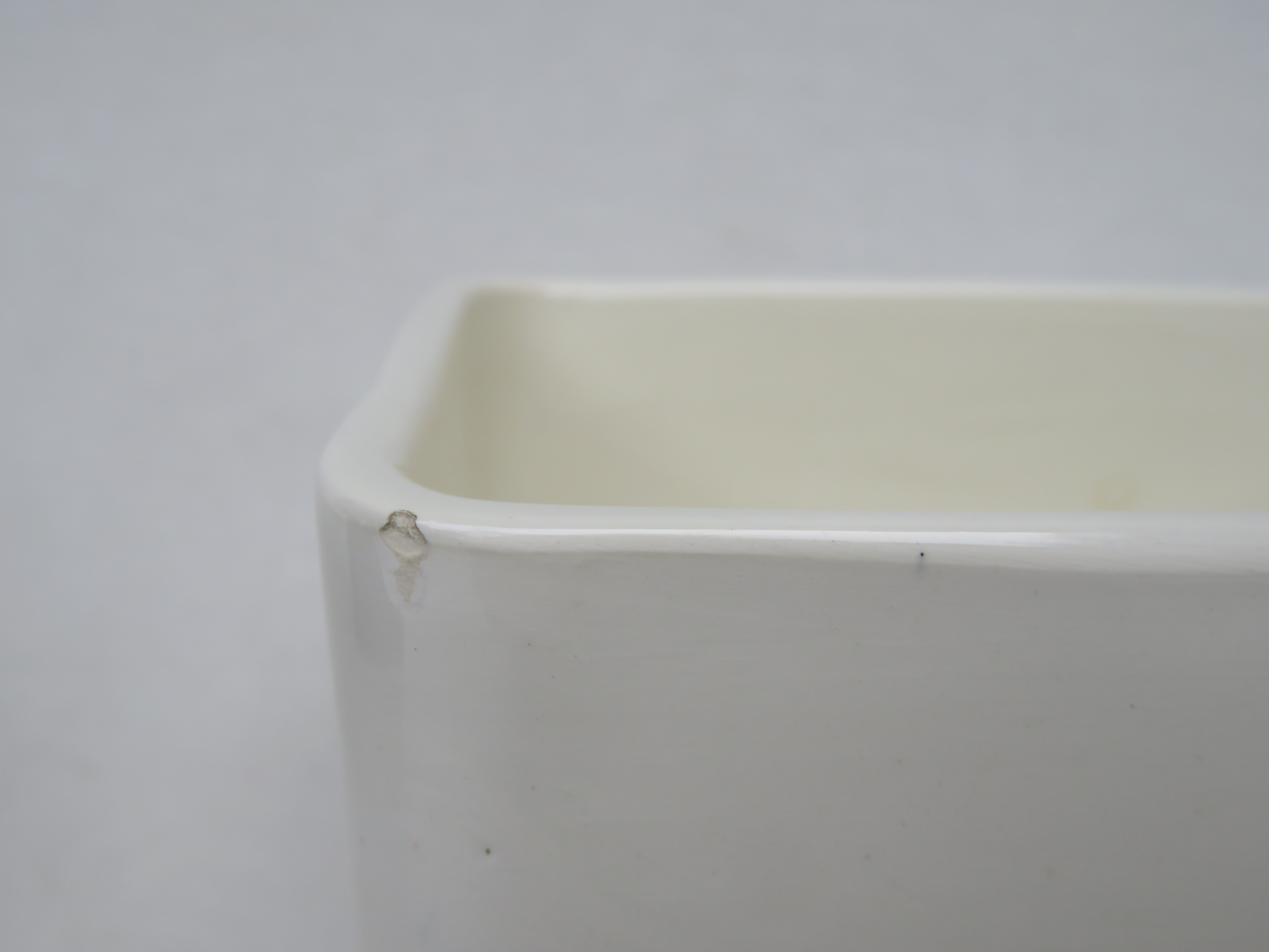 Höhe 12 cm incl. Griff, Breite 27 cm, Tiefe 14 cm6eckig – längliche Form, geringe Glasurchips sind vorhanden – siehe Fotos