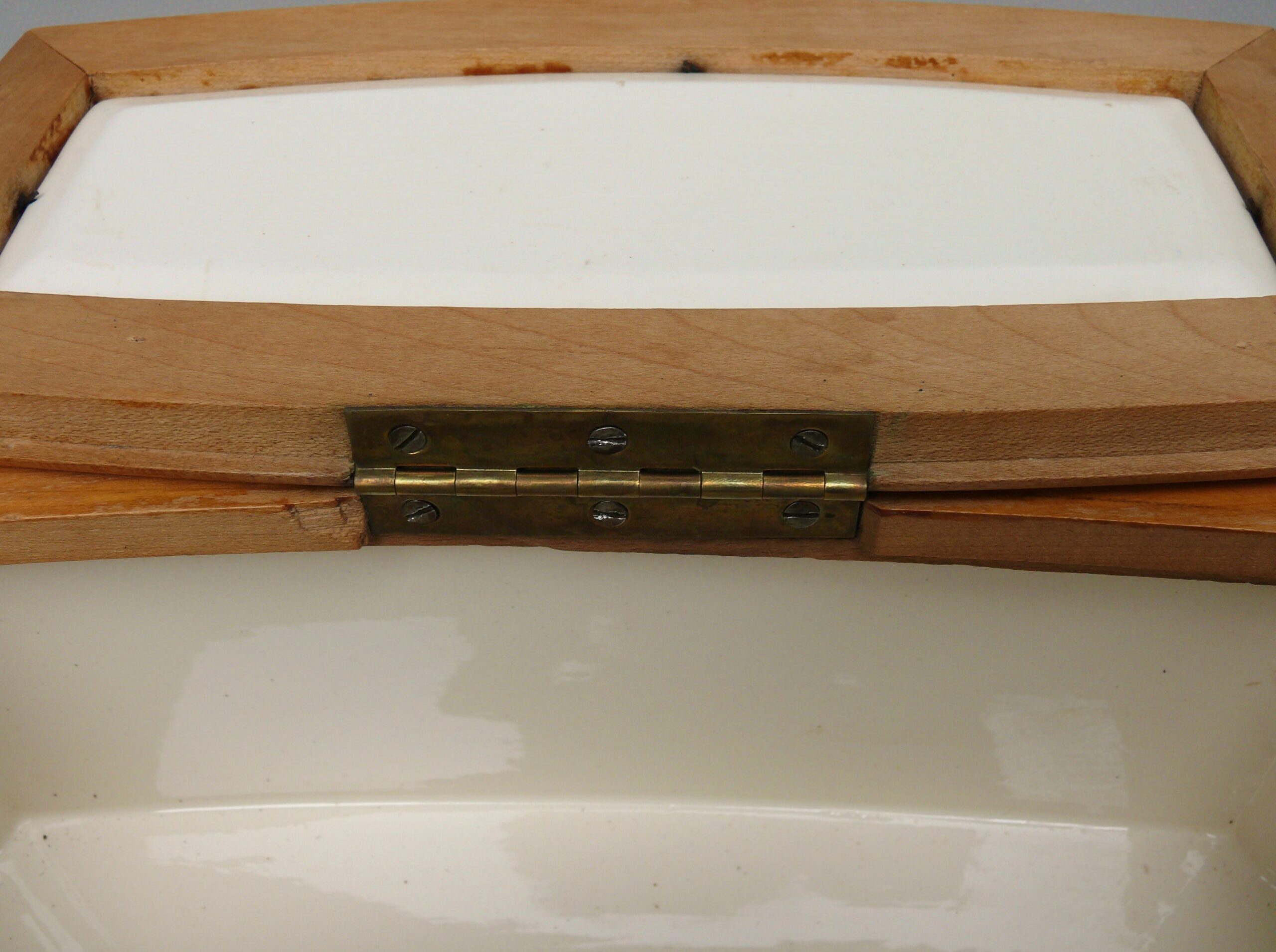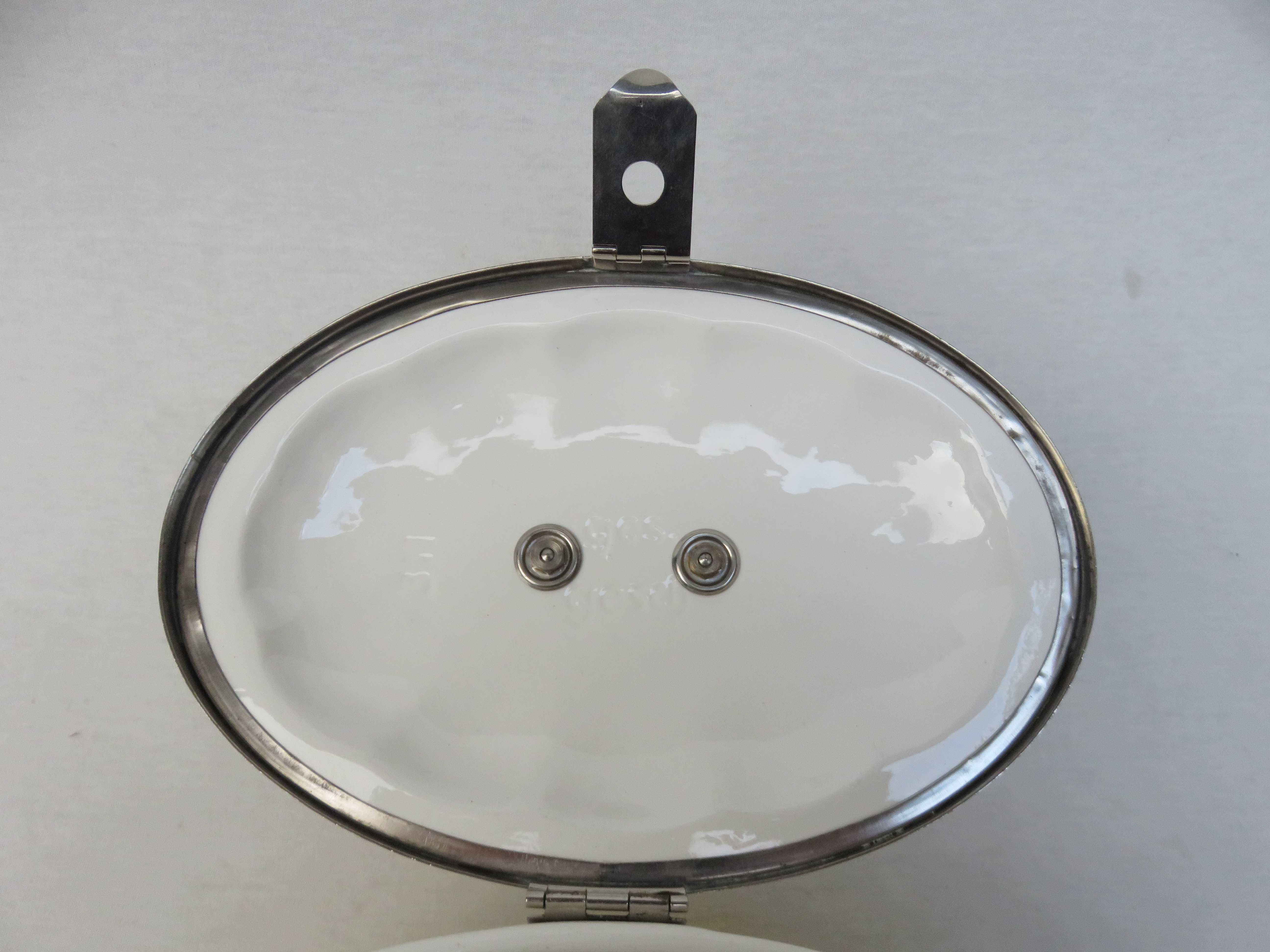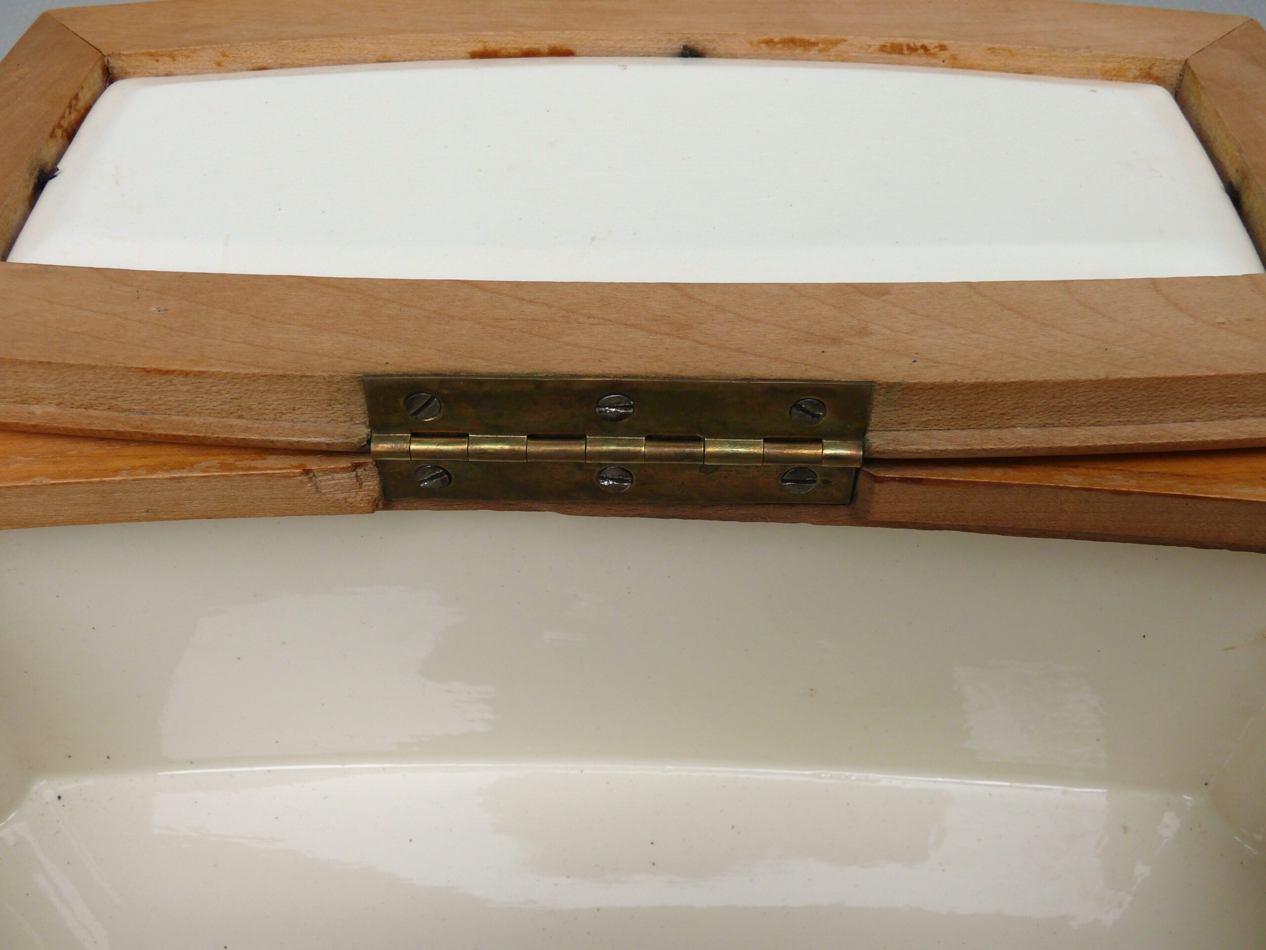 Das Scharnier wurde alt neu angelötet.Die Keramik weist am Deckel von außen die für Keramik typischen Craquele mit leichten Verfärbungen auf, ebenso geringfügig im Inneren am Boden.Die Vernickelung hat leichte Gebrauchsspuren.