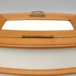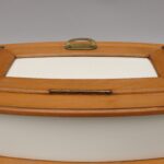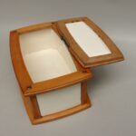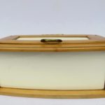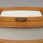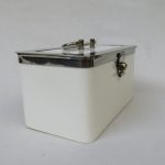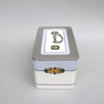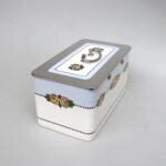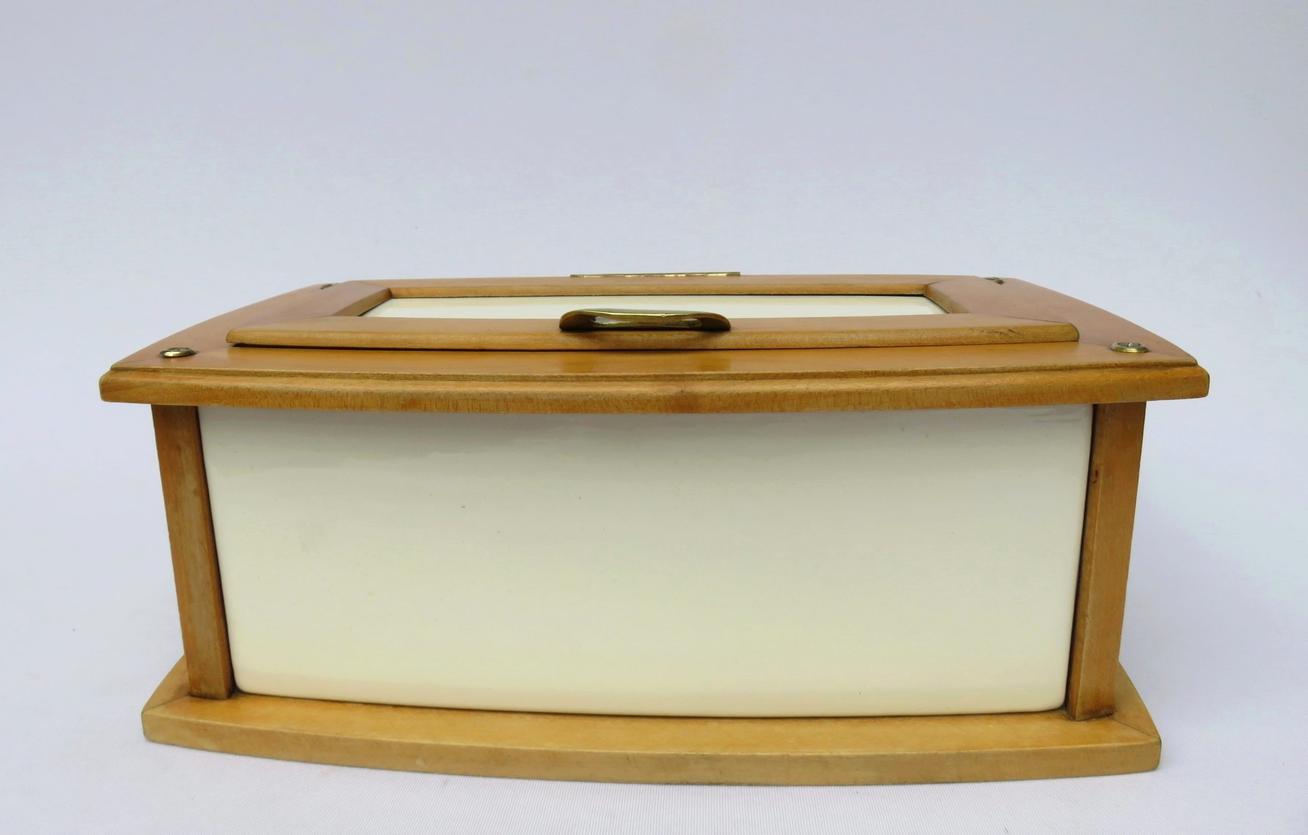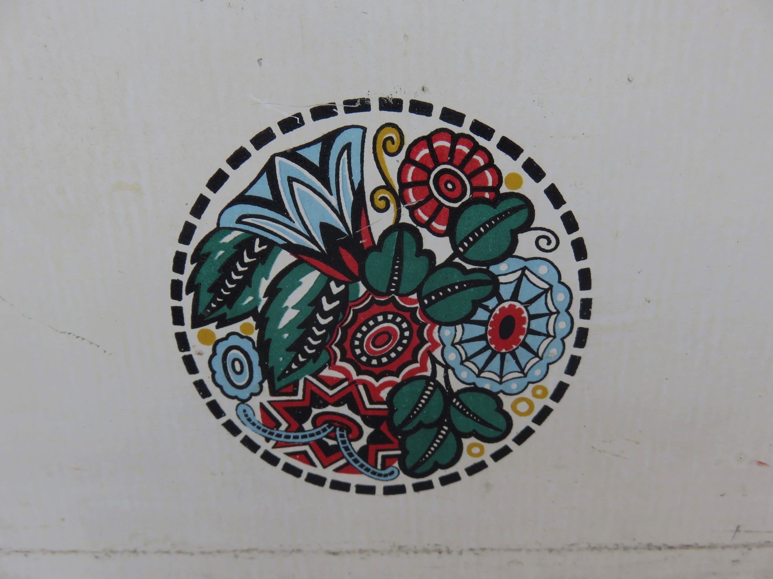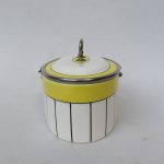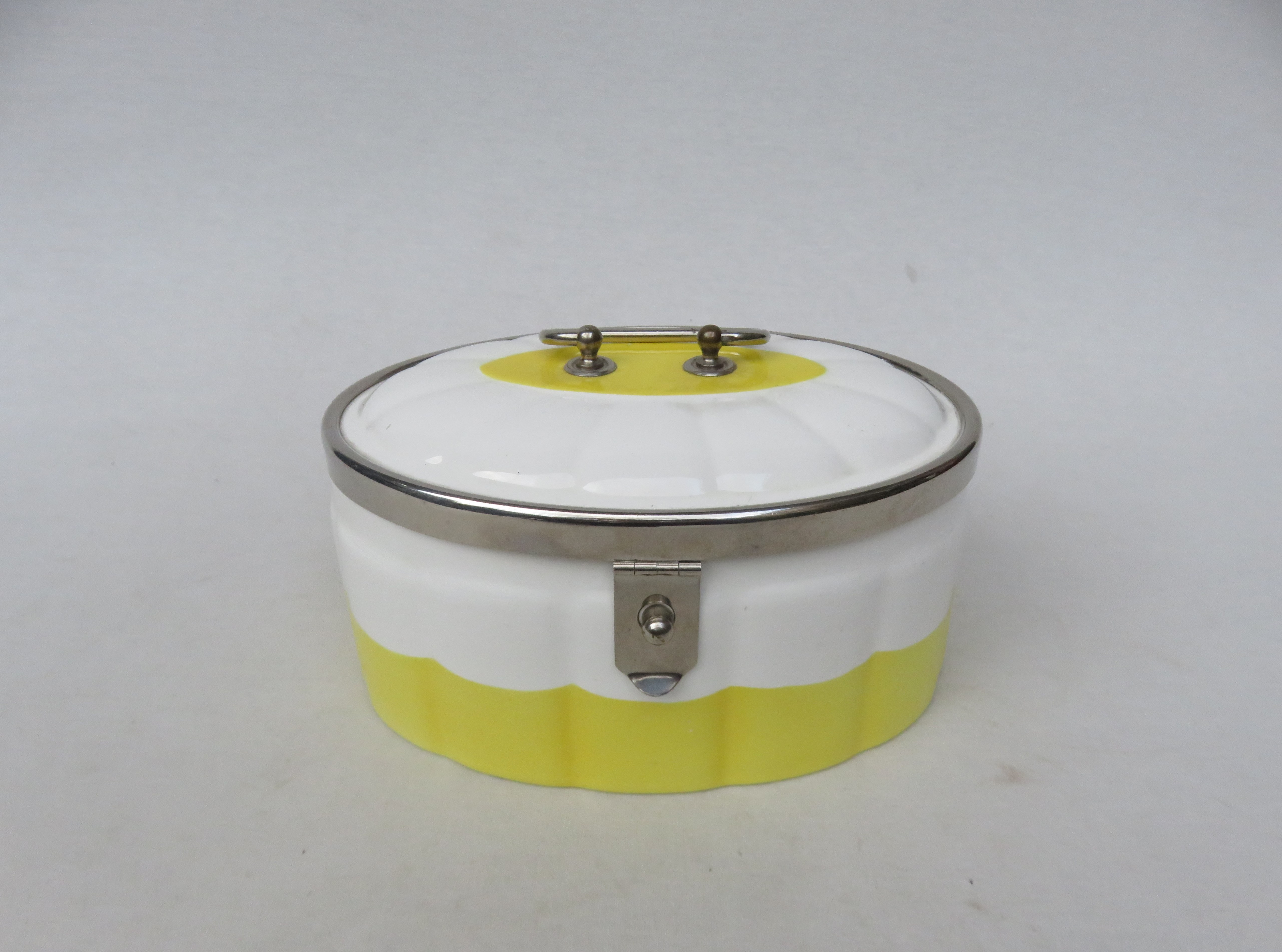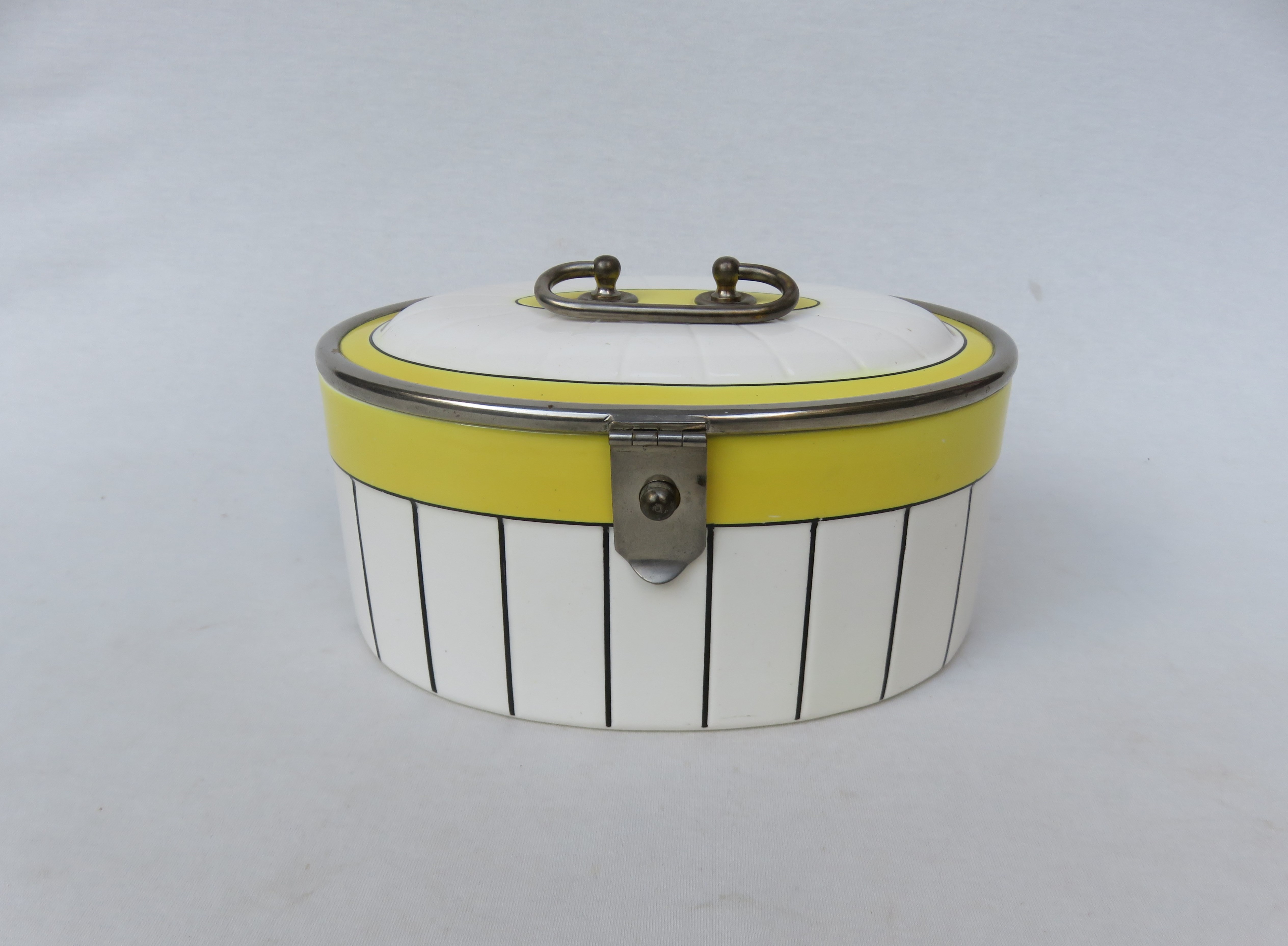 Sie zeigt ein typisch für die Zeit strenges Dekor in schwarz und gelb auf weißem Grund. Die Dose hat eine ovale Form.