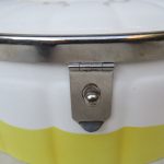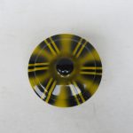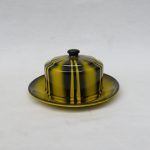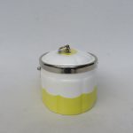 Eine Butterdose aus den 20er Jahren, emailliert mit Spritzdekor in der kontrastreichen Kombination gelb/schwarz. Das Dekor wurde ausgeführt in einer strengen Formensprache, die an Entwürfe des Bauhaus erinnert.