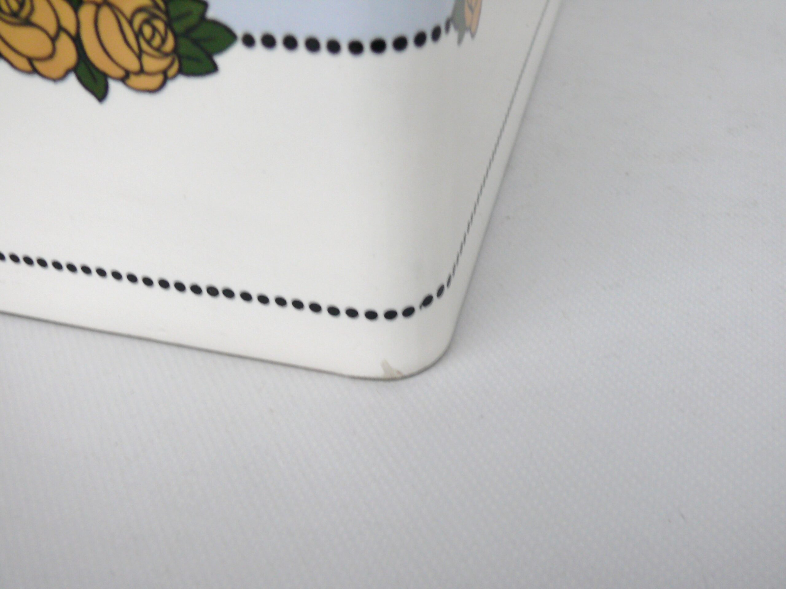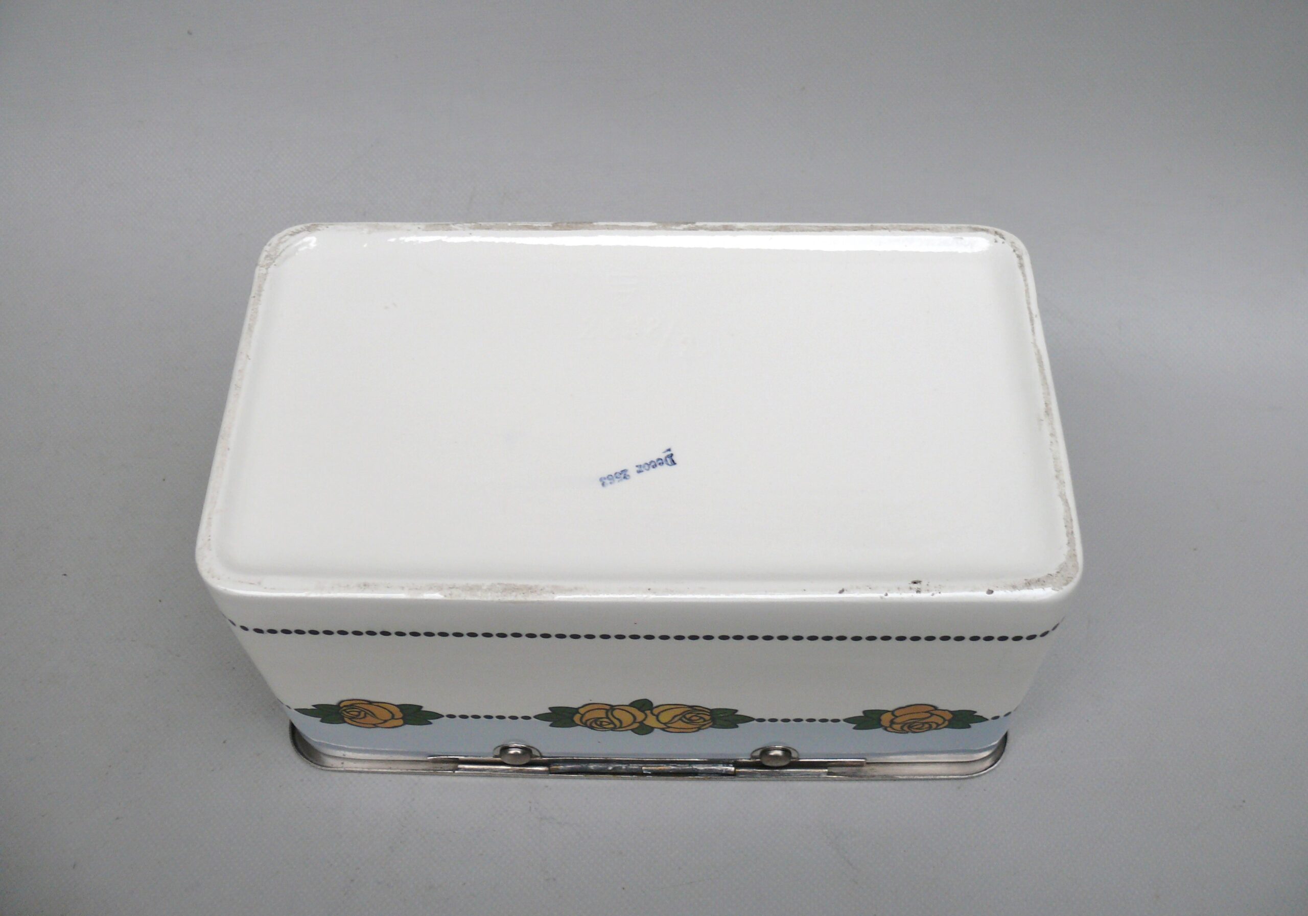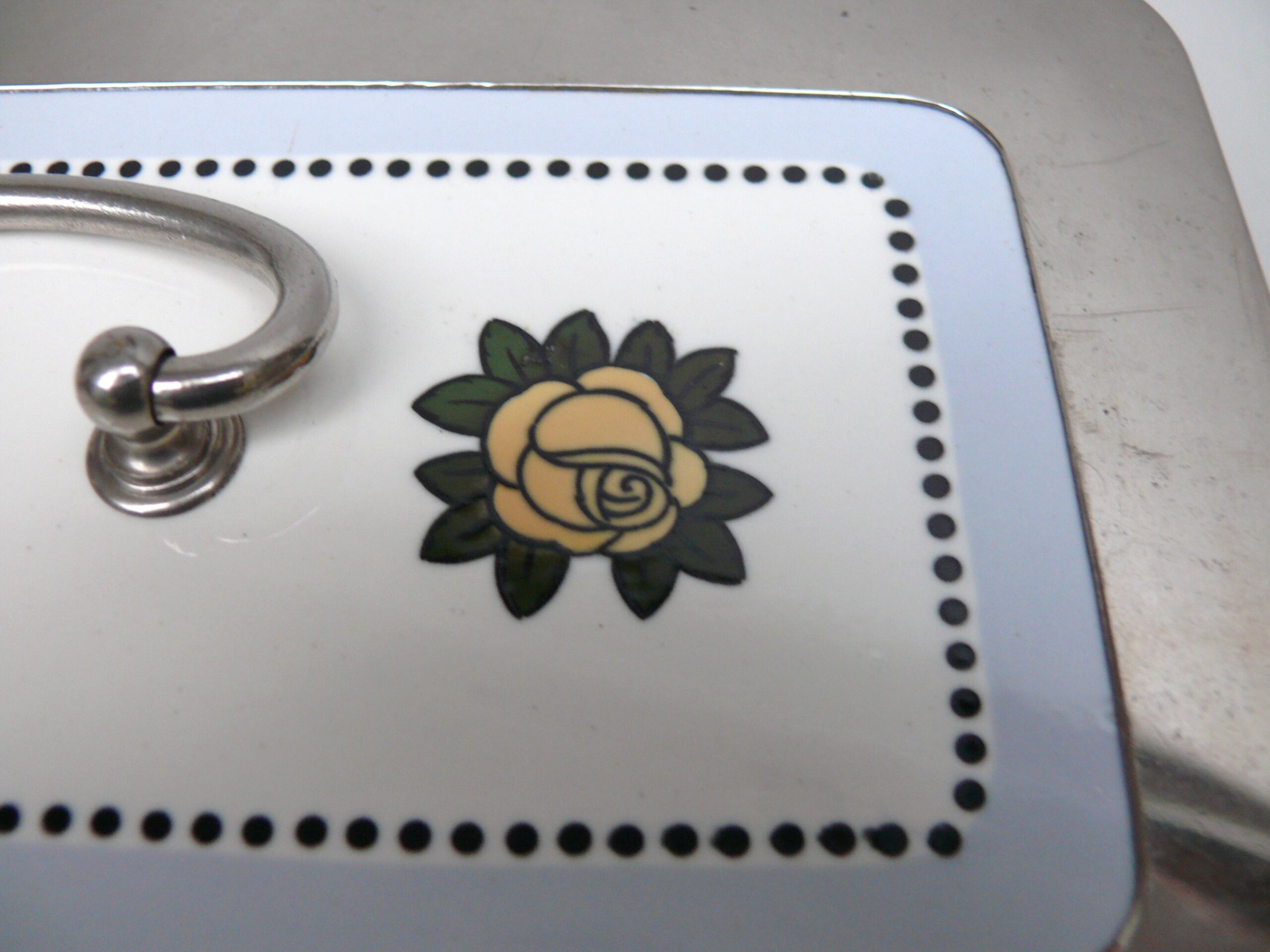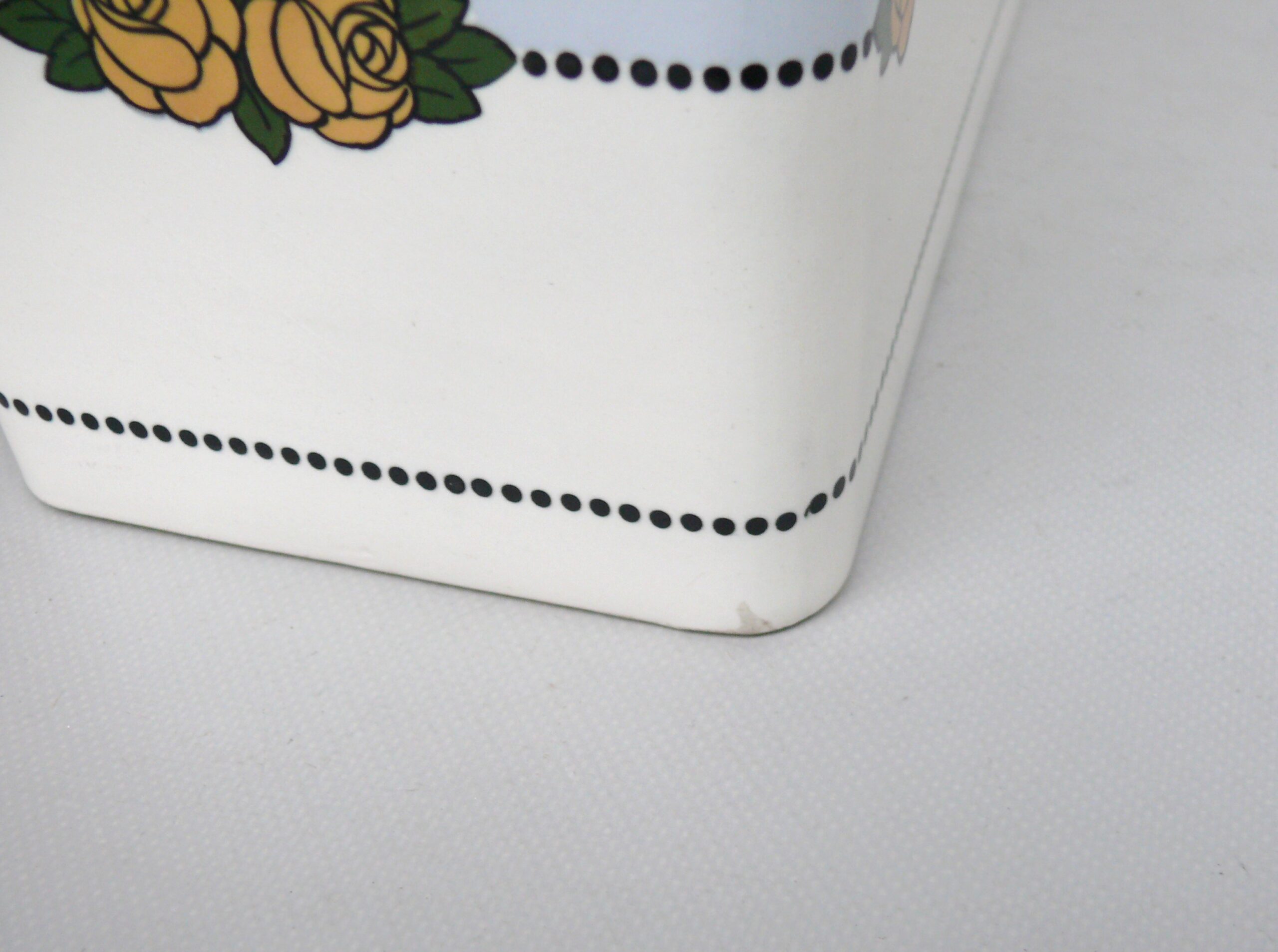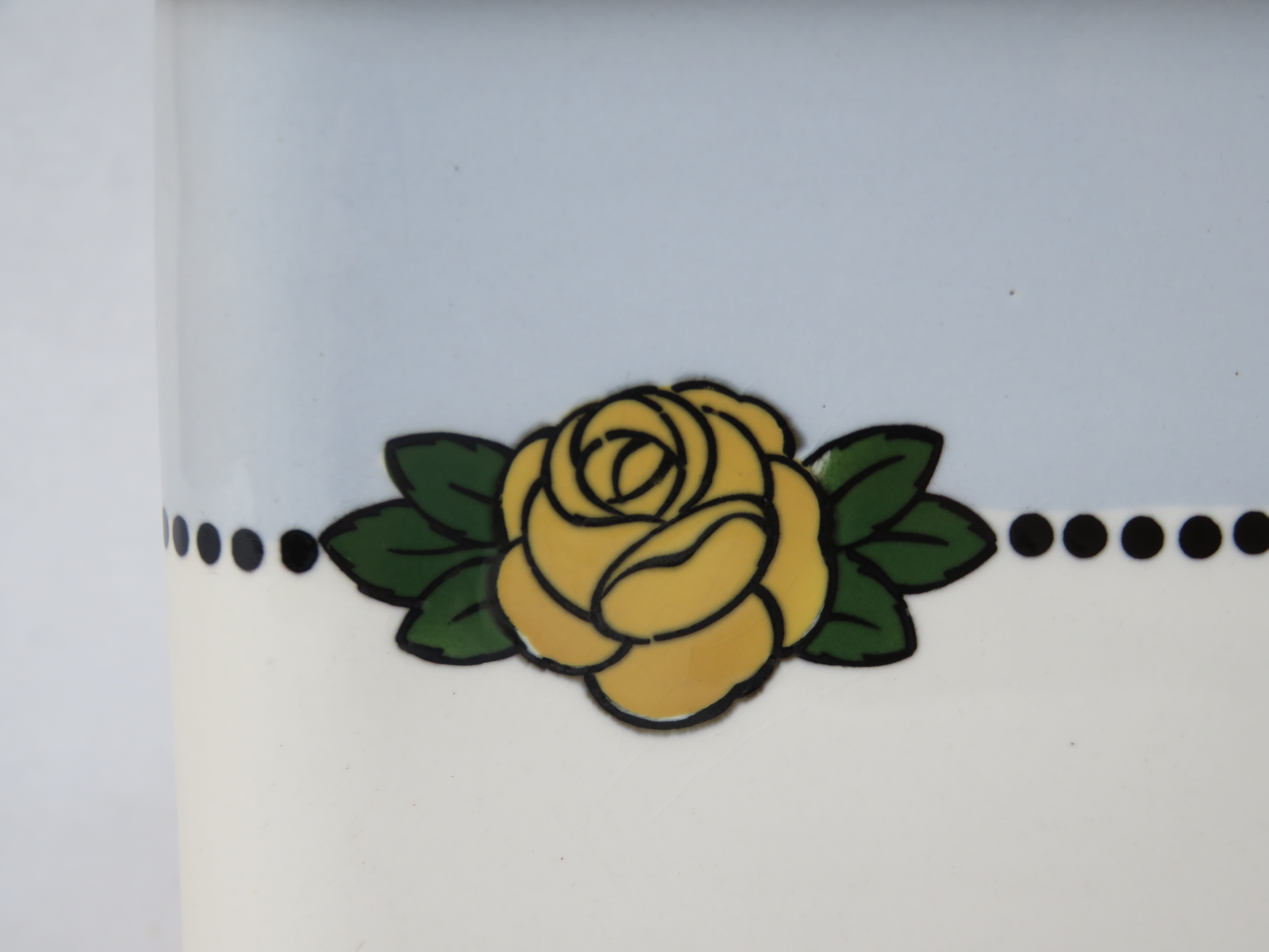 Das Dekor – Rosen – ist in gelb, grün und schwarz auf weißem/hellblauem Grund gehalten, rechteckige Grundform mit abgerundeten Ecken.