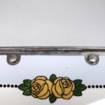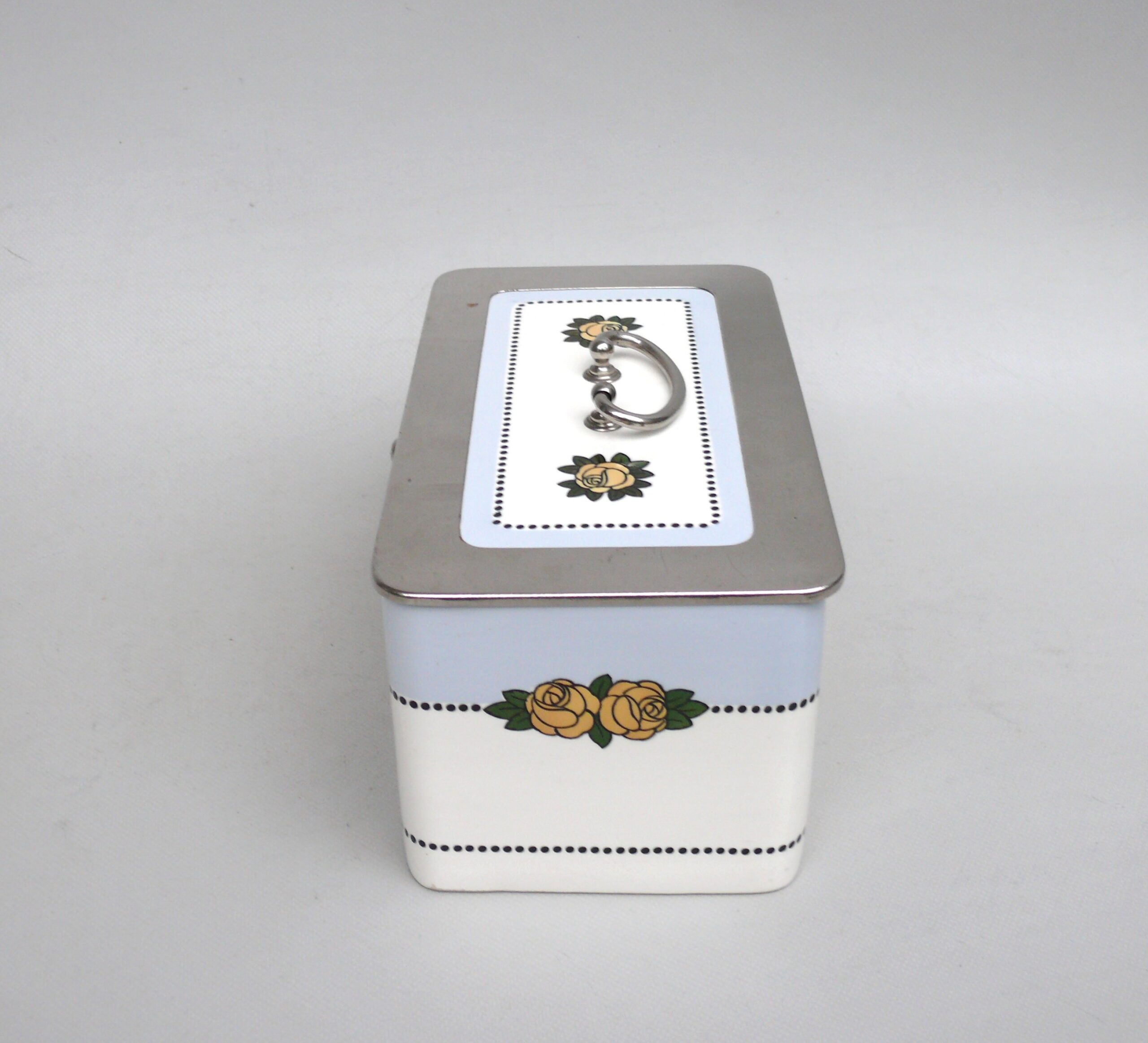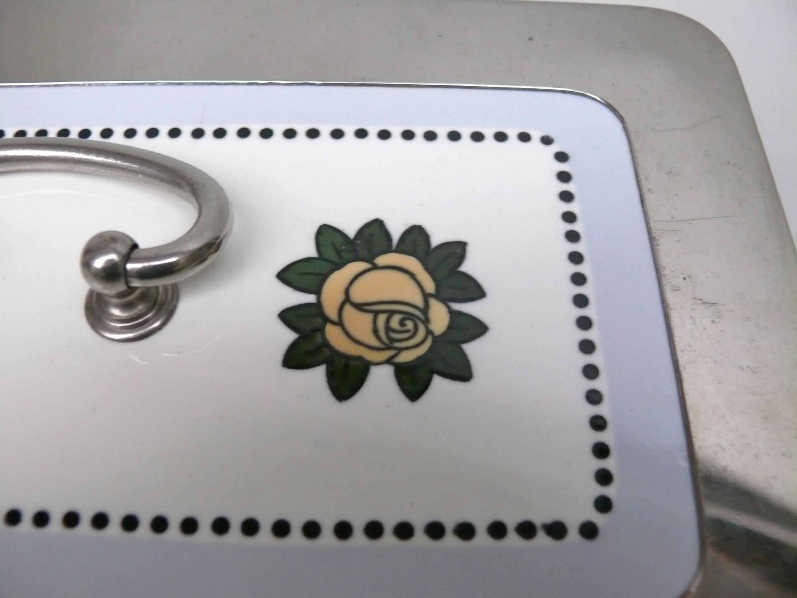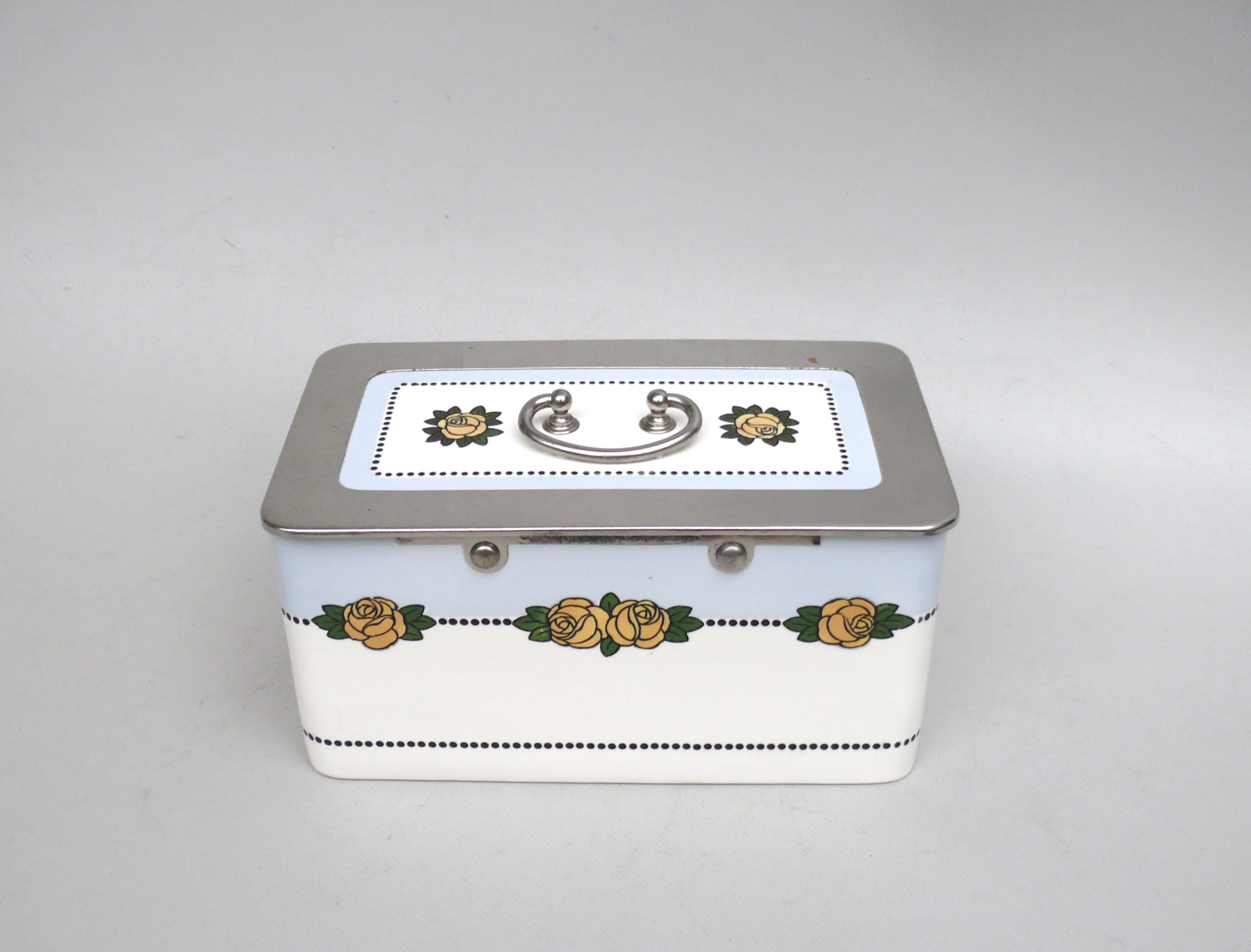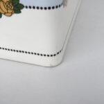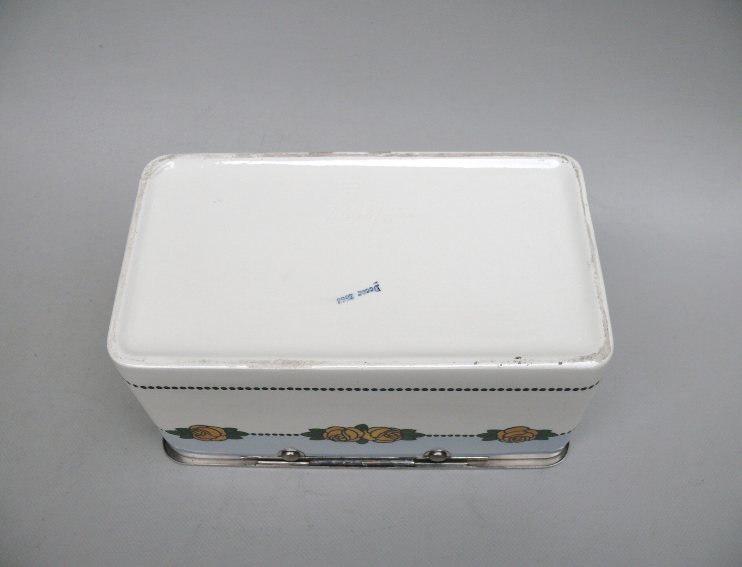 Das Dekor – Rosen – ist in gelb, grün und schwarz auf weißem/hellblauem Grund gehalten, rechteckige Grundform mit abgerundeten Ecken.
