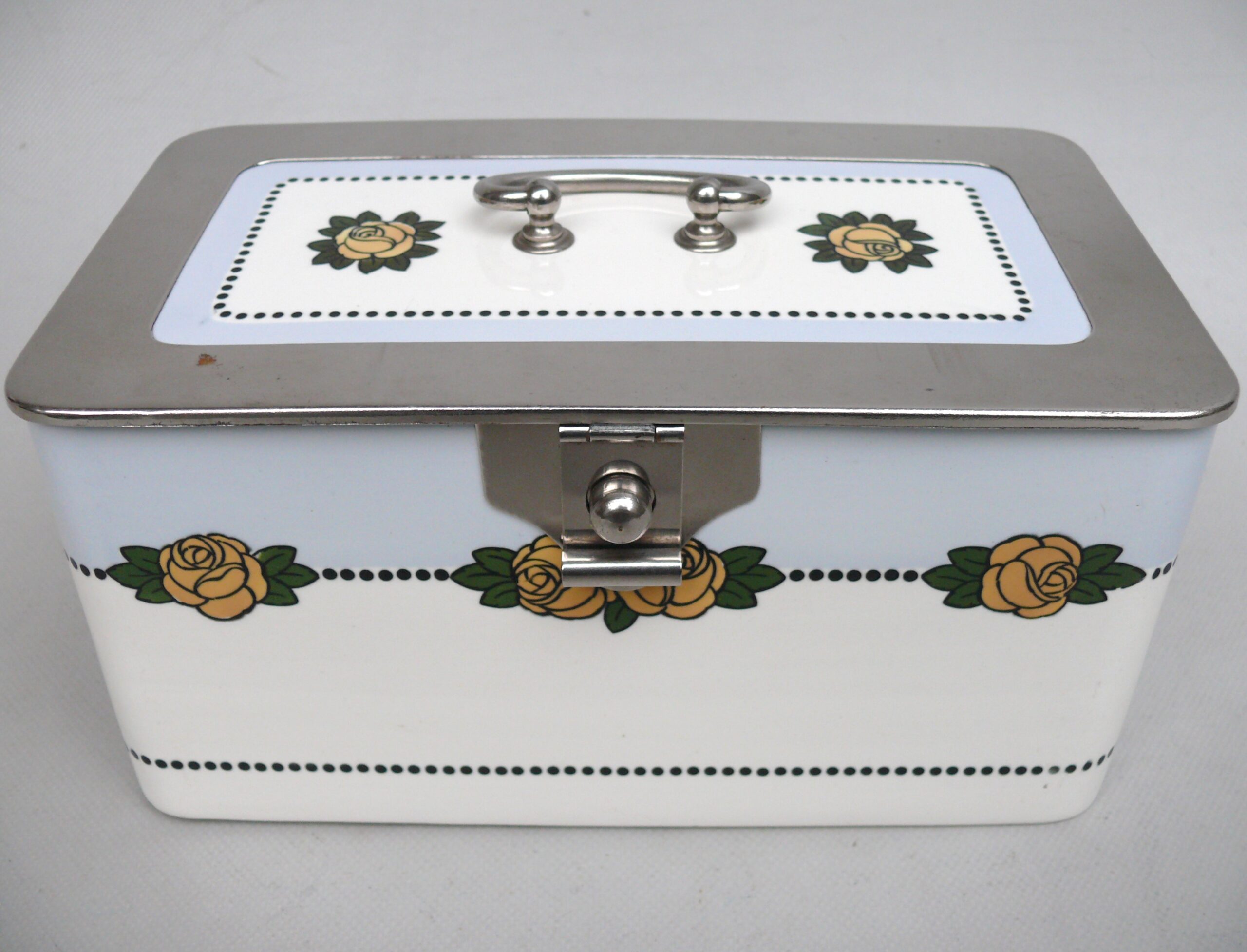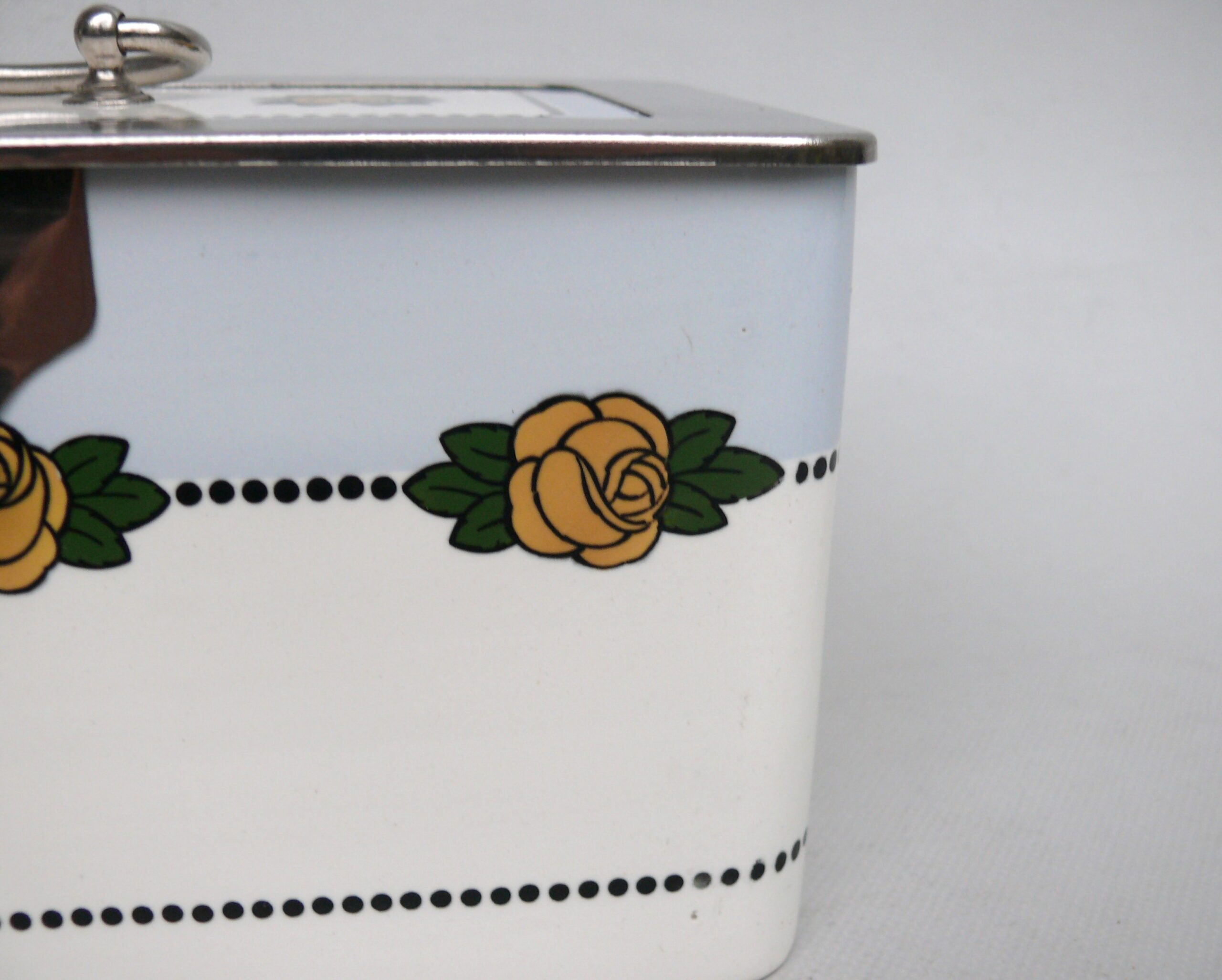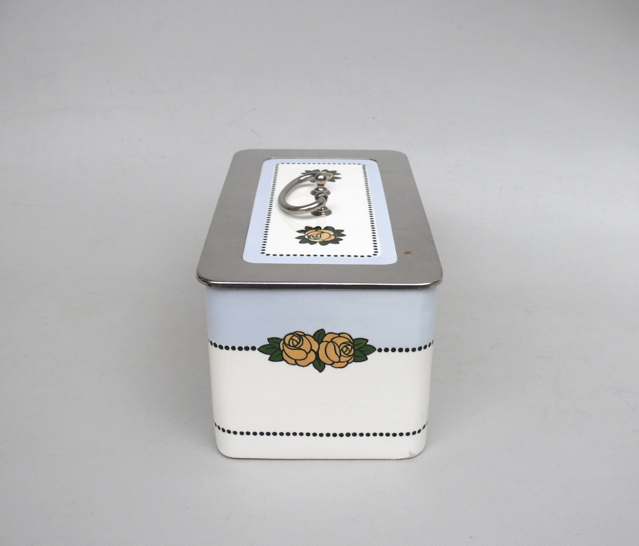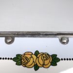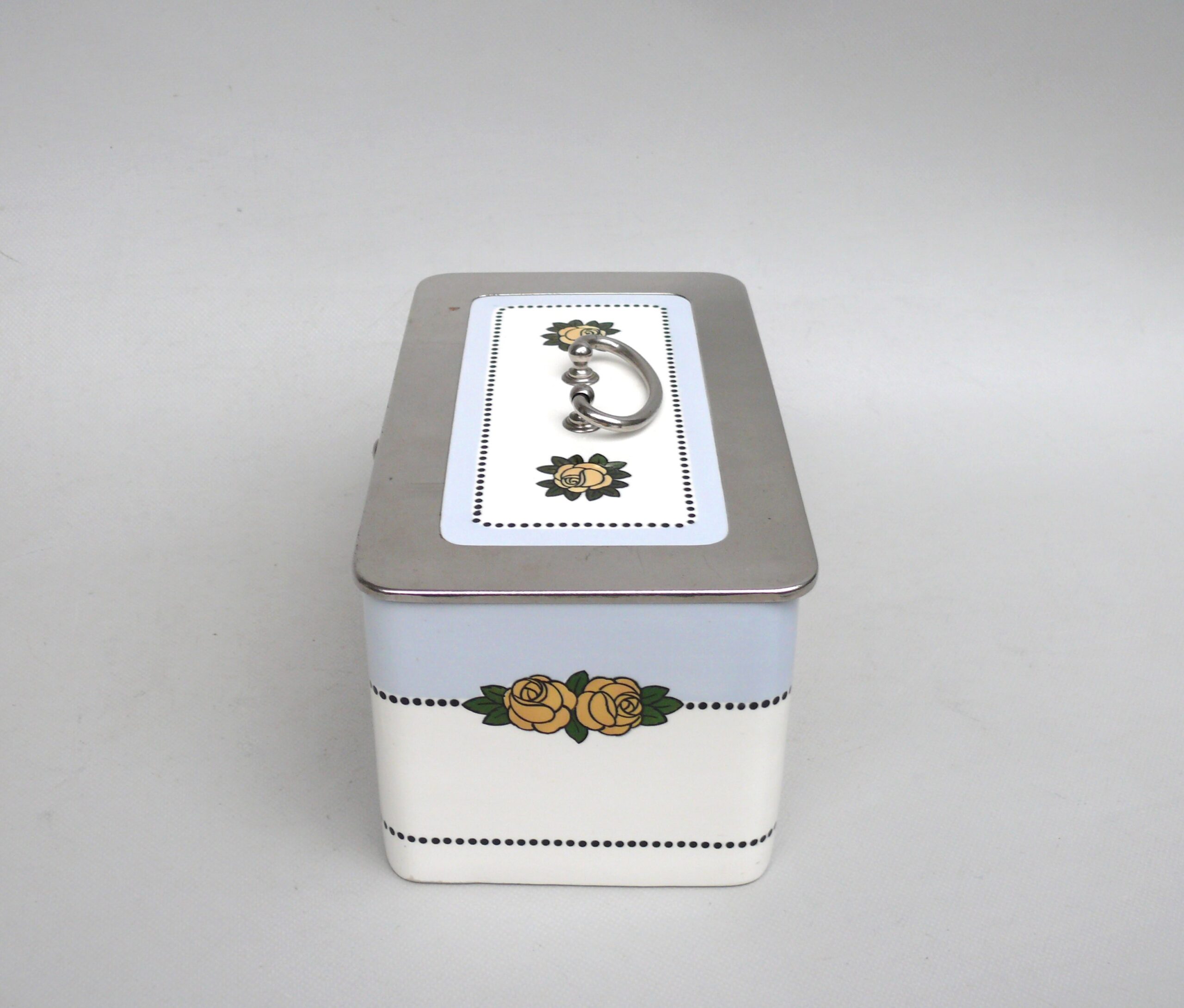 Das Dekor – Rosen – ist in gelb, grün und schwarz auf weißem/hellblauem Grund gehalten, rechteckige Grundform mit abgerundeten Ecken.