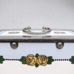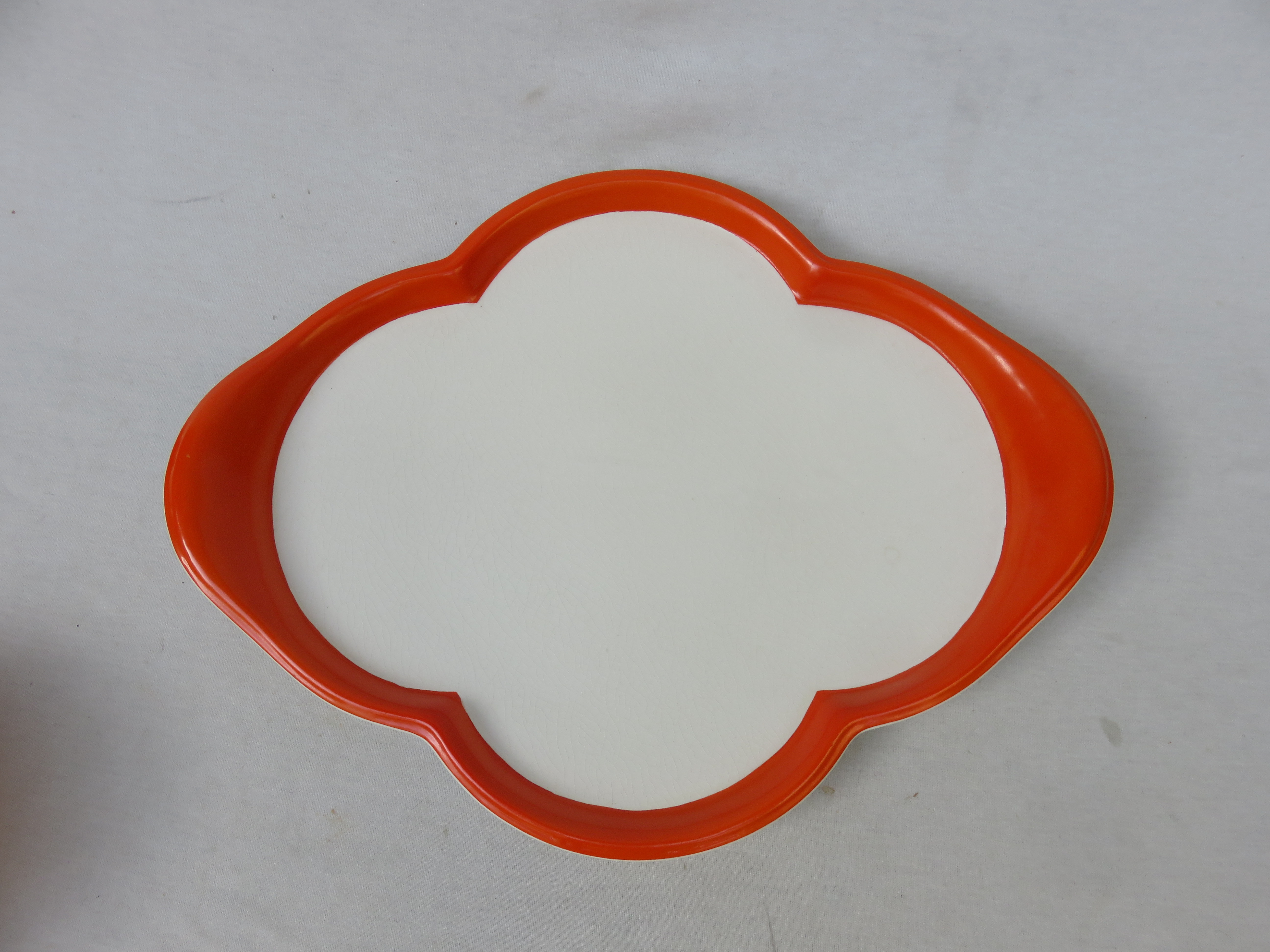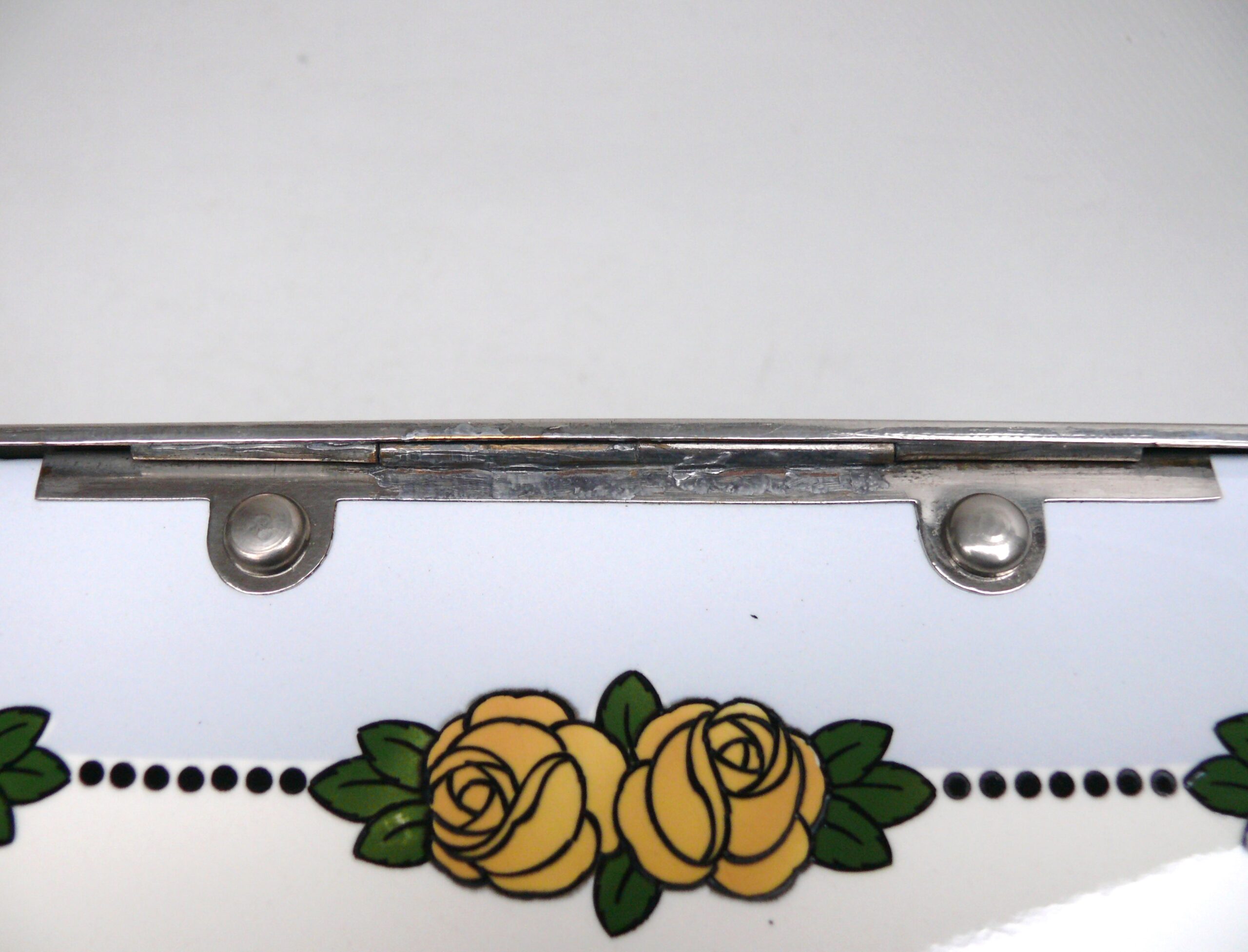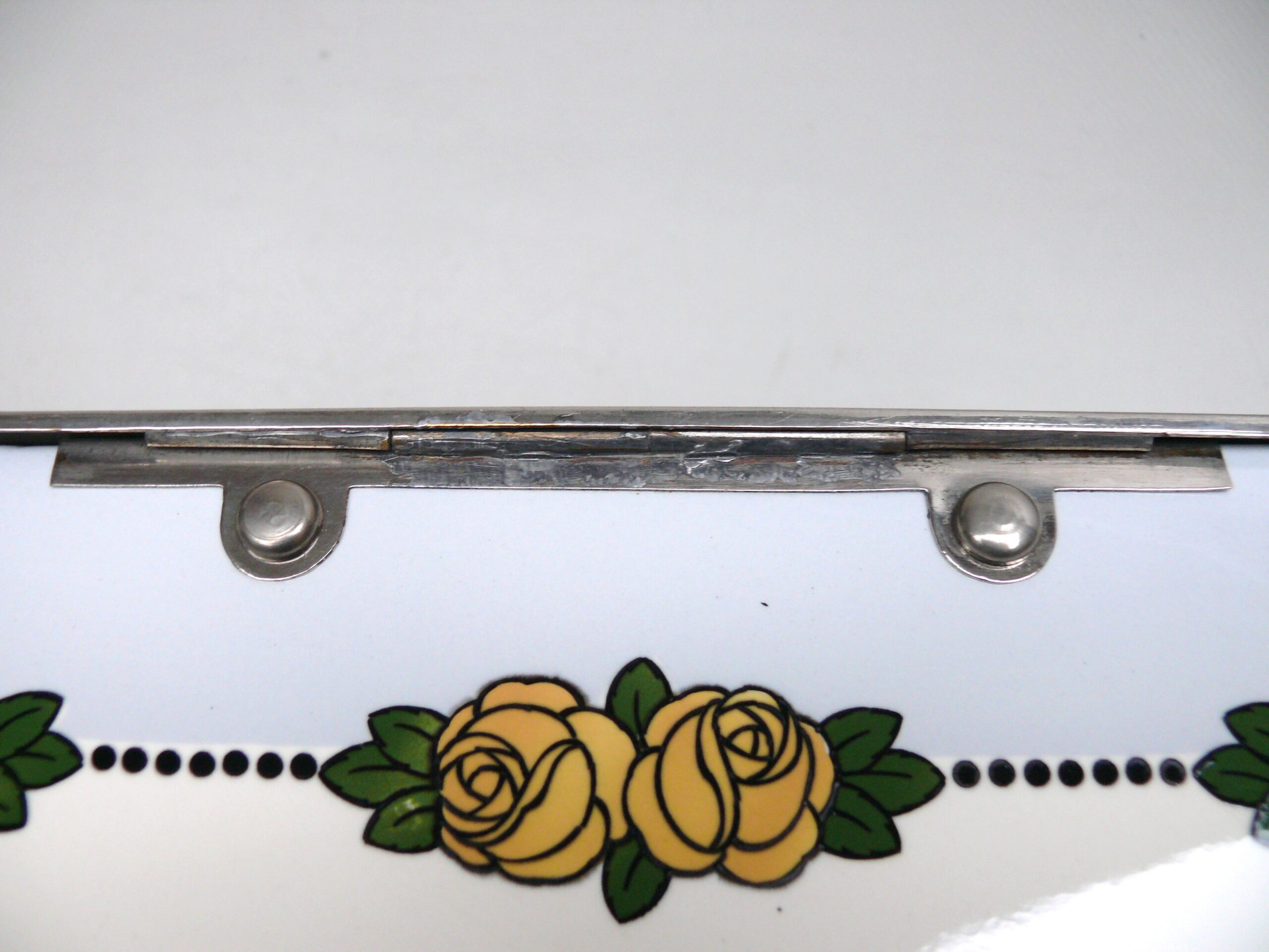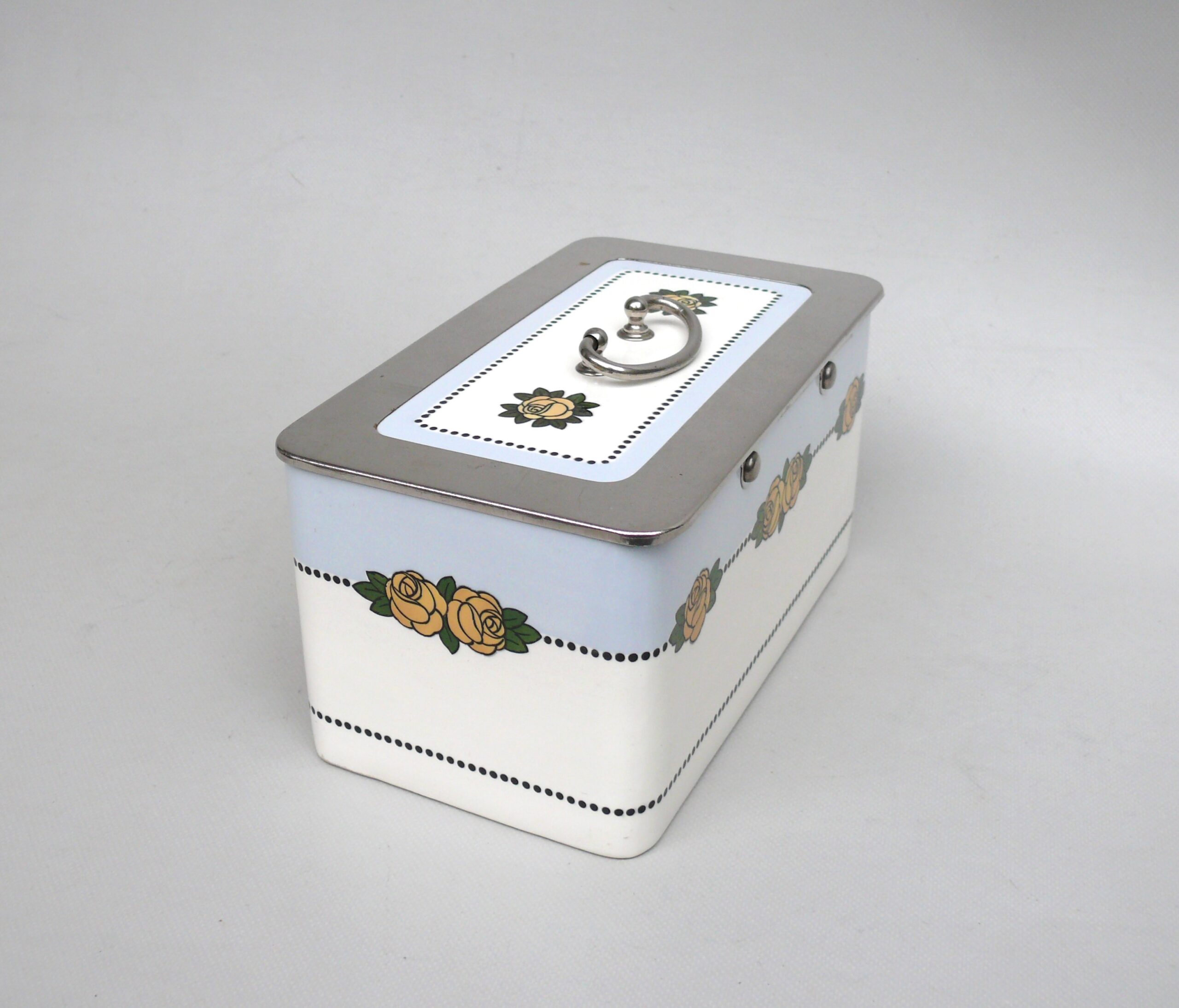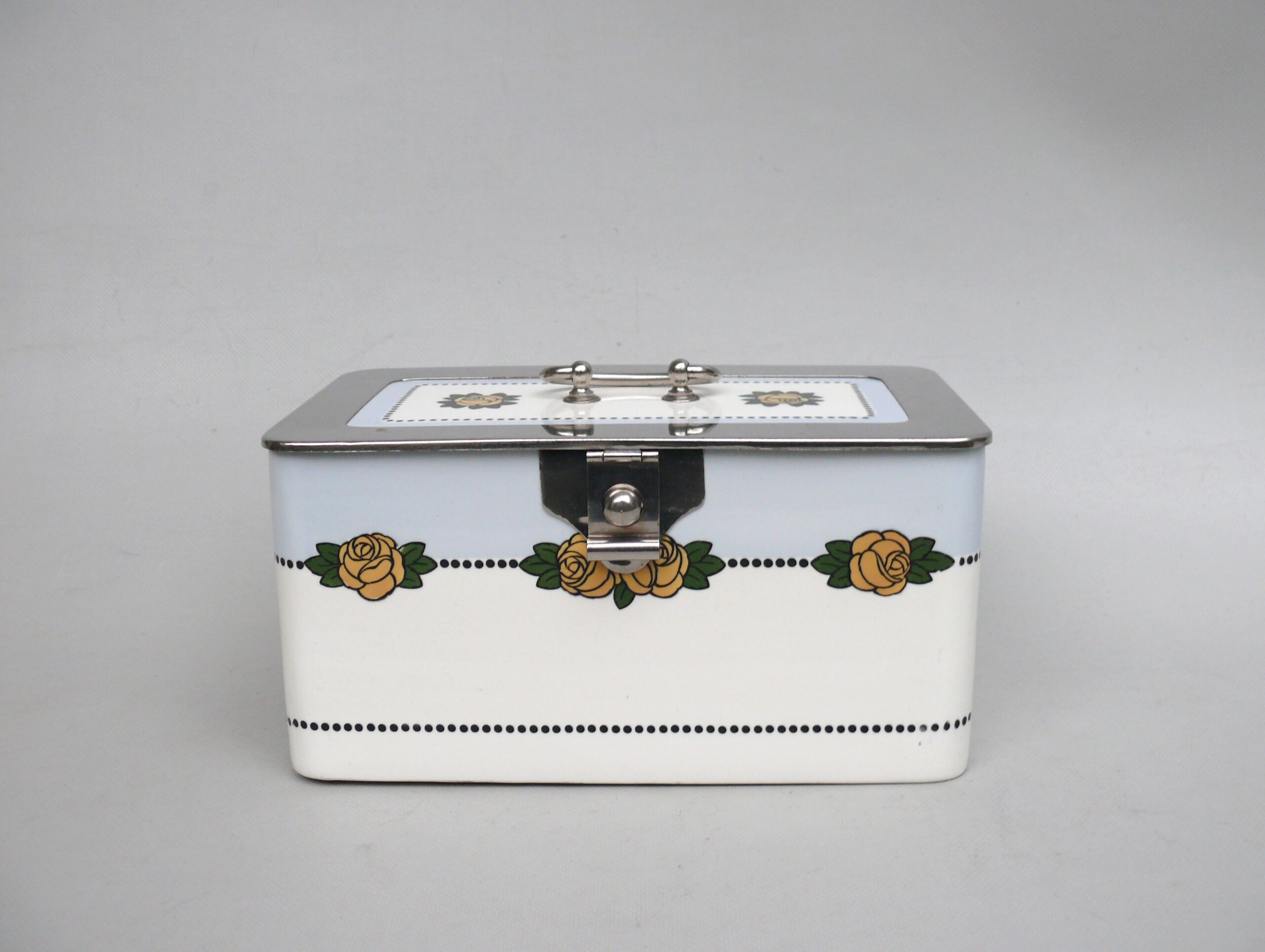 Das Dekor – Rosen – ist in gelb, grün und schwarz auf weißem/hellblauem Grund gehalten, rechteckige Grundform mit abgerundeten Ecken.