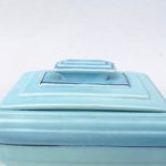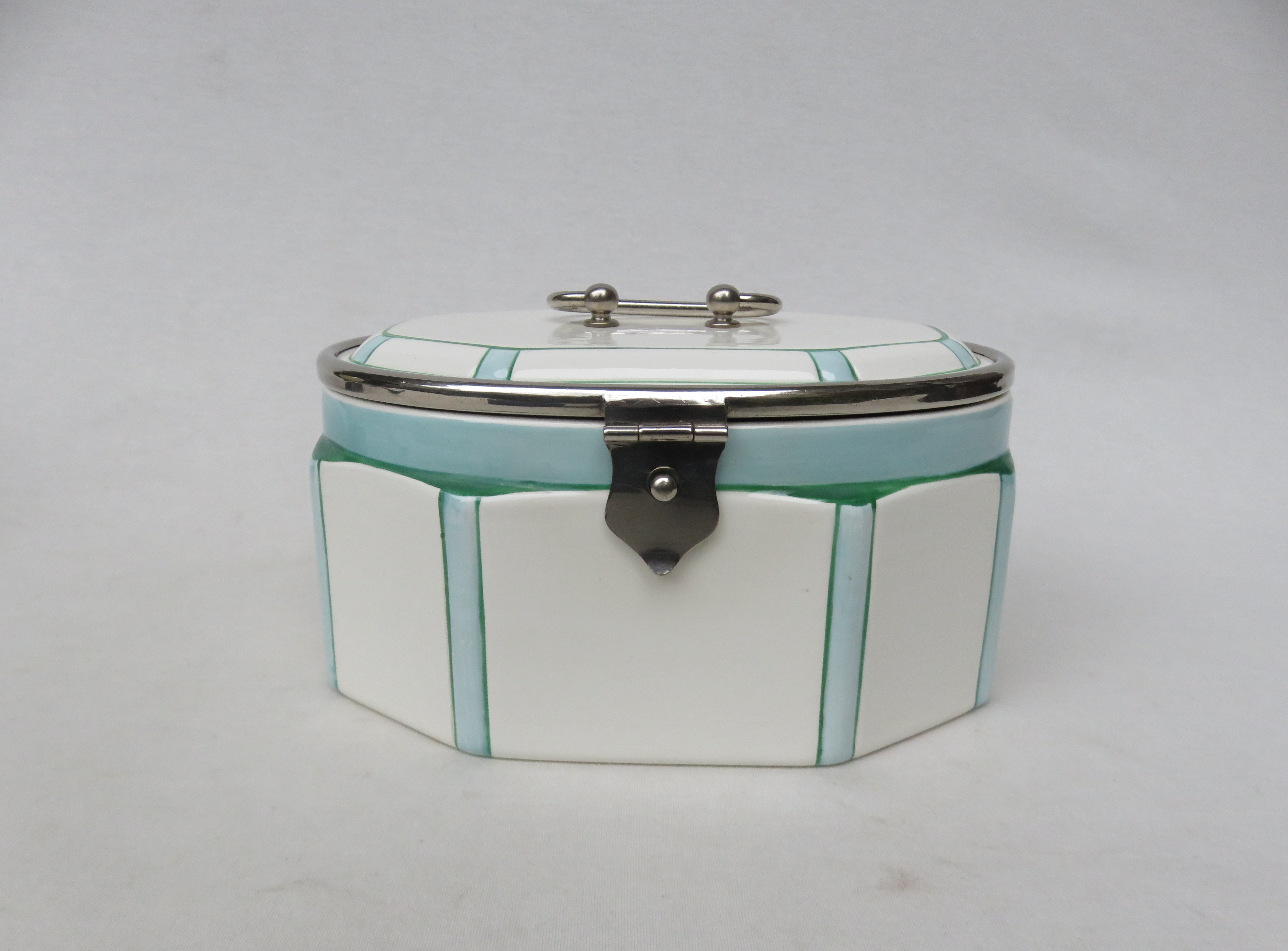 Eine Gebäckdose aus der Zeit des Art Deco aus Keramik mit einem zeittypisch streng geometrischen Dekor.Die Gebäckdose ist aus hellbeiger Keramik mit einem Dekor in hellblau und grün, das die außergewöhnliche Form hervorhebt.Der Stand ist 8eckig, zur Öffnung geht die Form in oval über. Der Übergang ist grün abgesetzt, der ovale Rand ist hellblau. Im Deckel wiederholt sich dann wieder die 8eckige Form.