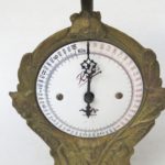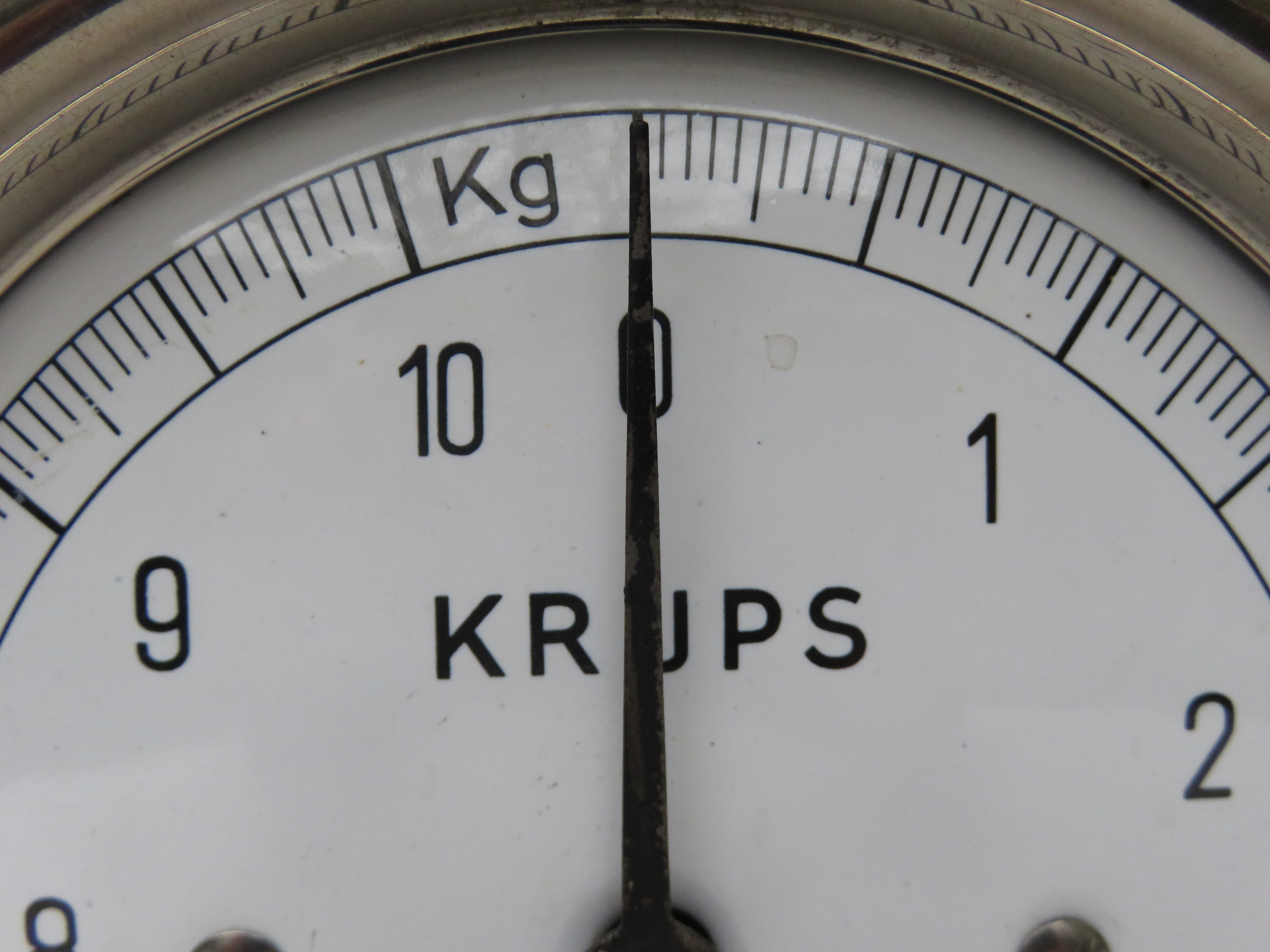 Küchenwaage der Firma Krups in der typisch reduzierten Form des Bauhaus.Die Firma Krups war zur damaligen Zeit eine der bekanntesten Hersteller für Küchenwaagen in Deutschland.Das Ziffernblatt ist emailliert, der Wiegebereich geht bis 10 kg in 100-Gramm-Schritten. Rückseitig befindet sich eine Justierschraube.Die Waagschale ist aus Messing verchromt. Sie hat einen Durchmesser von 23 cm.