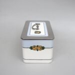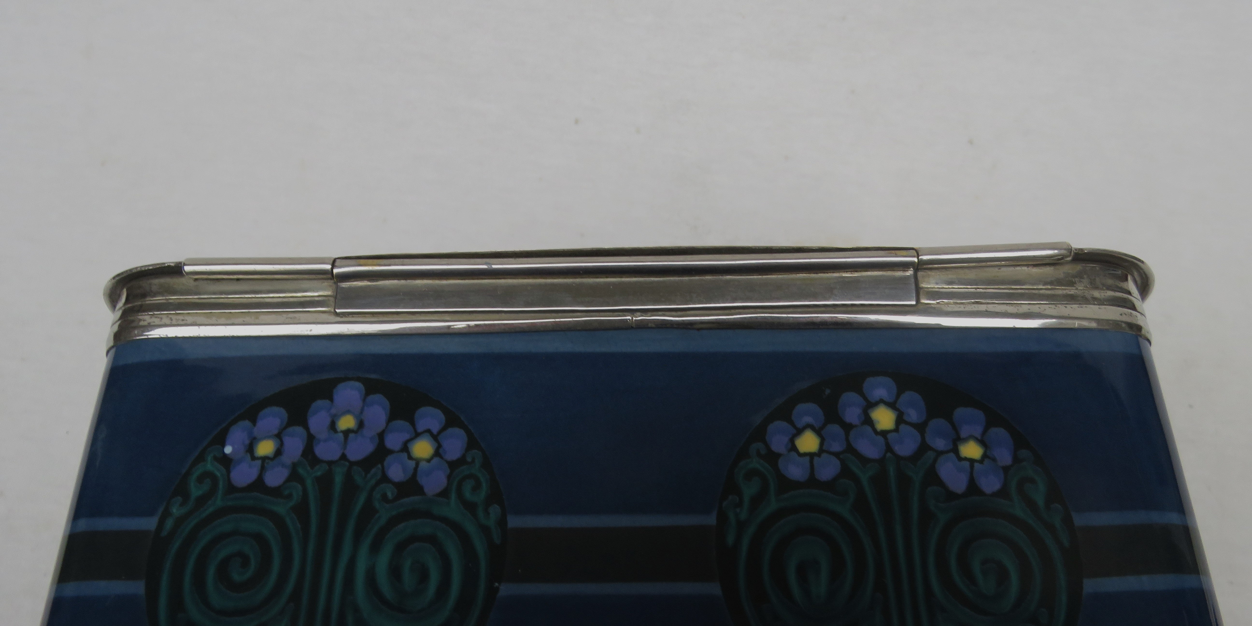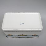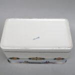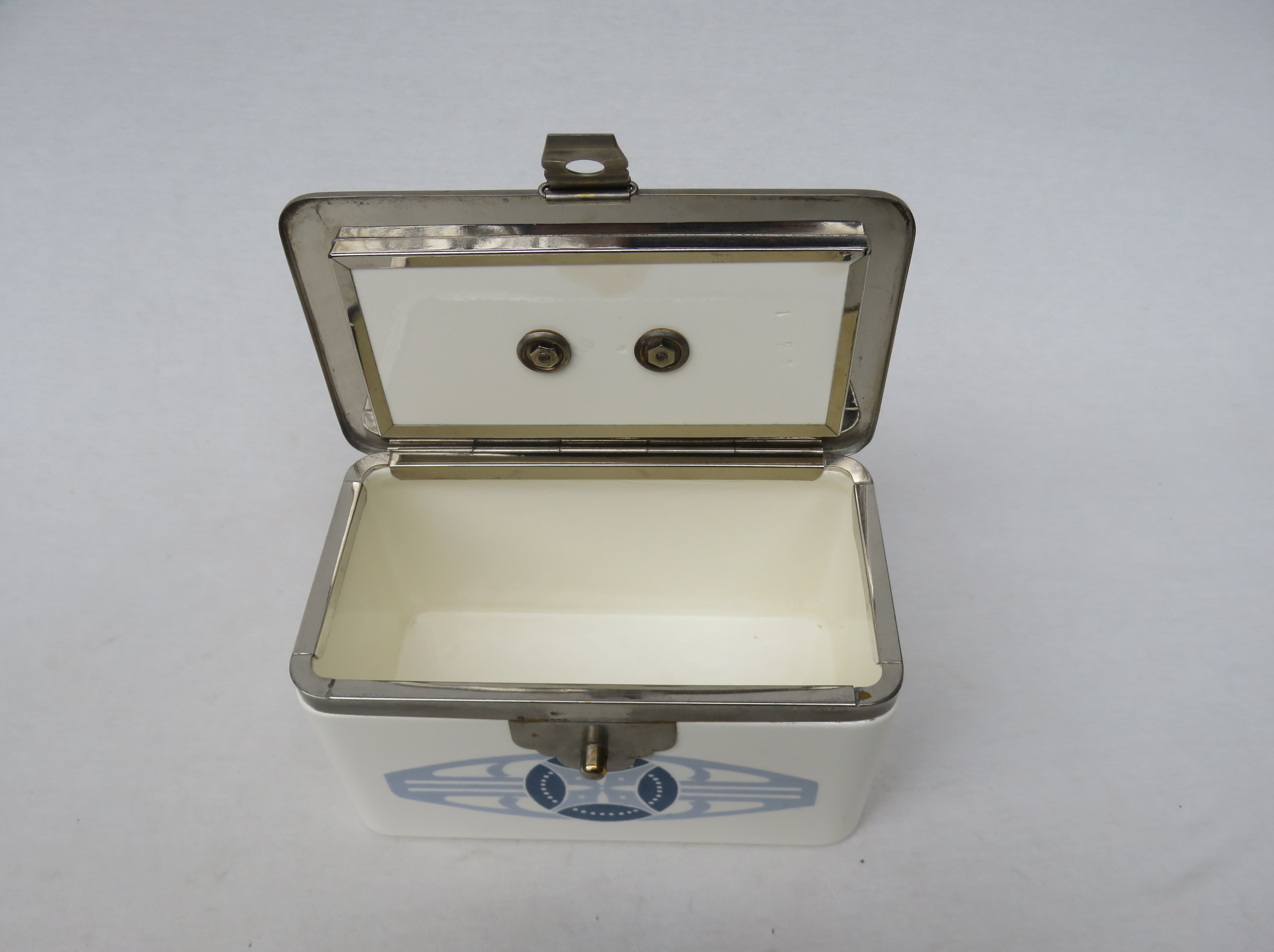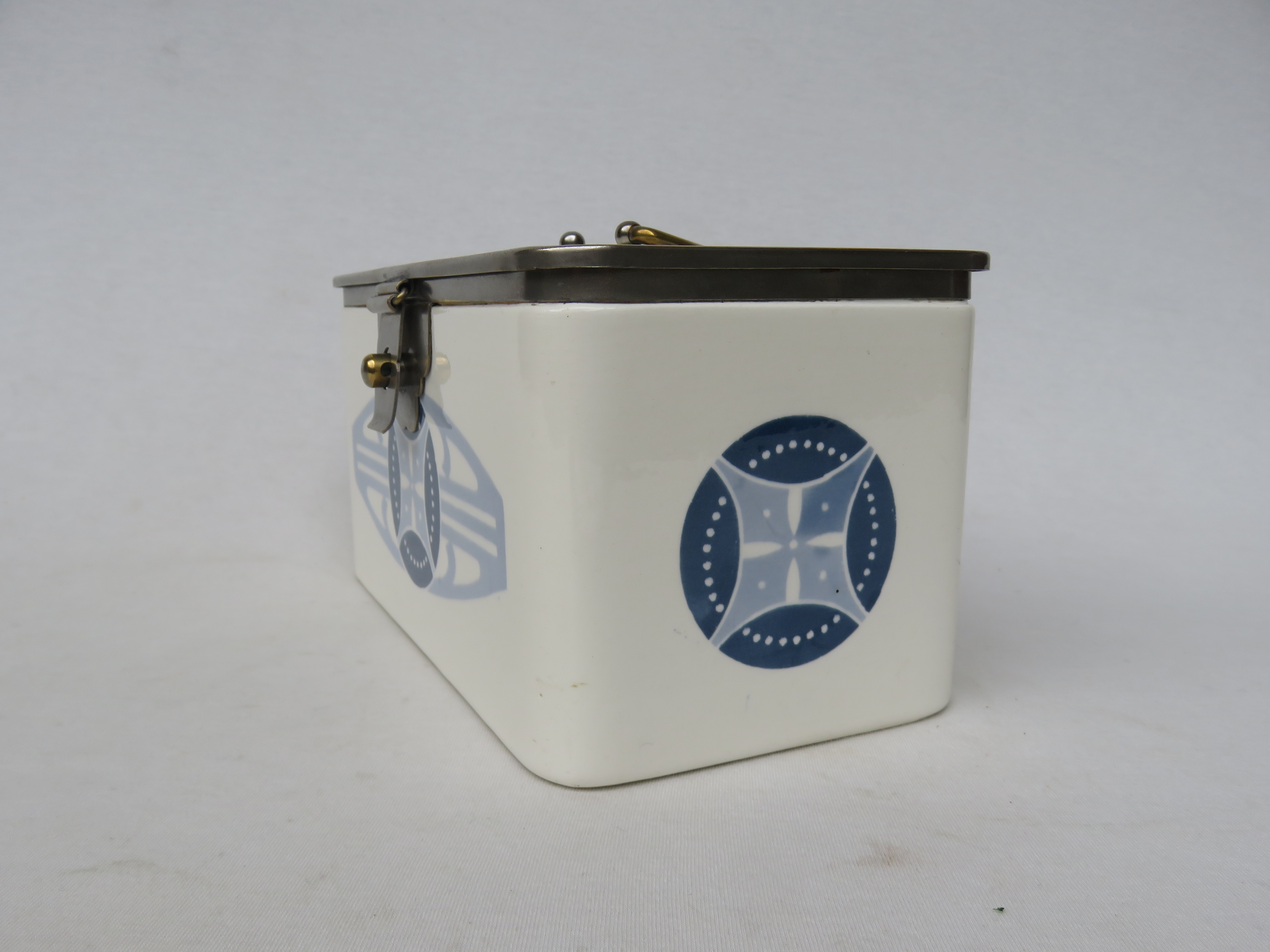 Das strenge Art-Deco-Dekor ist royalblau – schwarz auf weißem Grund. Die Dose hat eine ovale Form. Das erhabene Oval auf dem Deckel wiederholt angedeutet das Streifendekor der Dose.