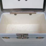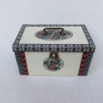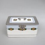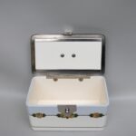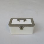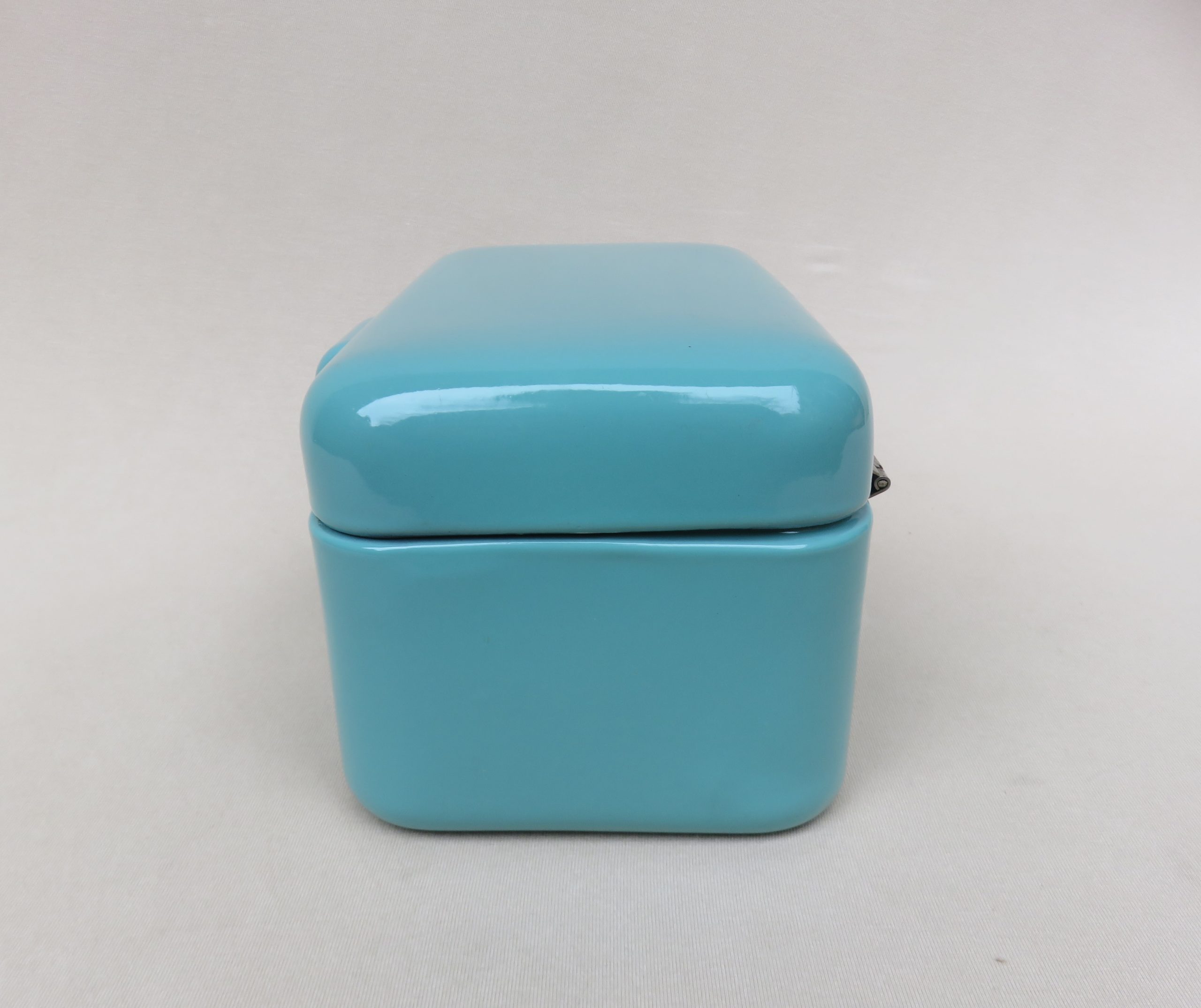 Metall in emailliert in einem Königsblau. Die Dose weist einge kleine Emailabsplitterungen auf – siehe Fotos (am Deckelrand, vorne neben dem Schloß, am inneren Rand oben).