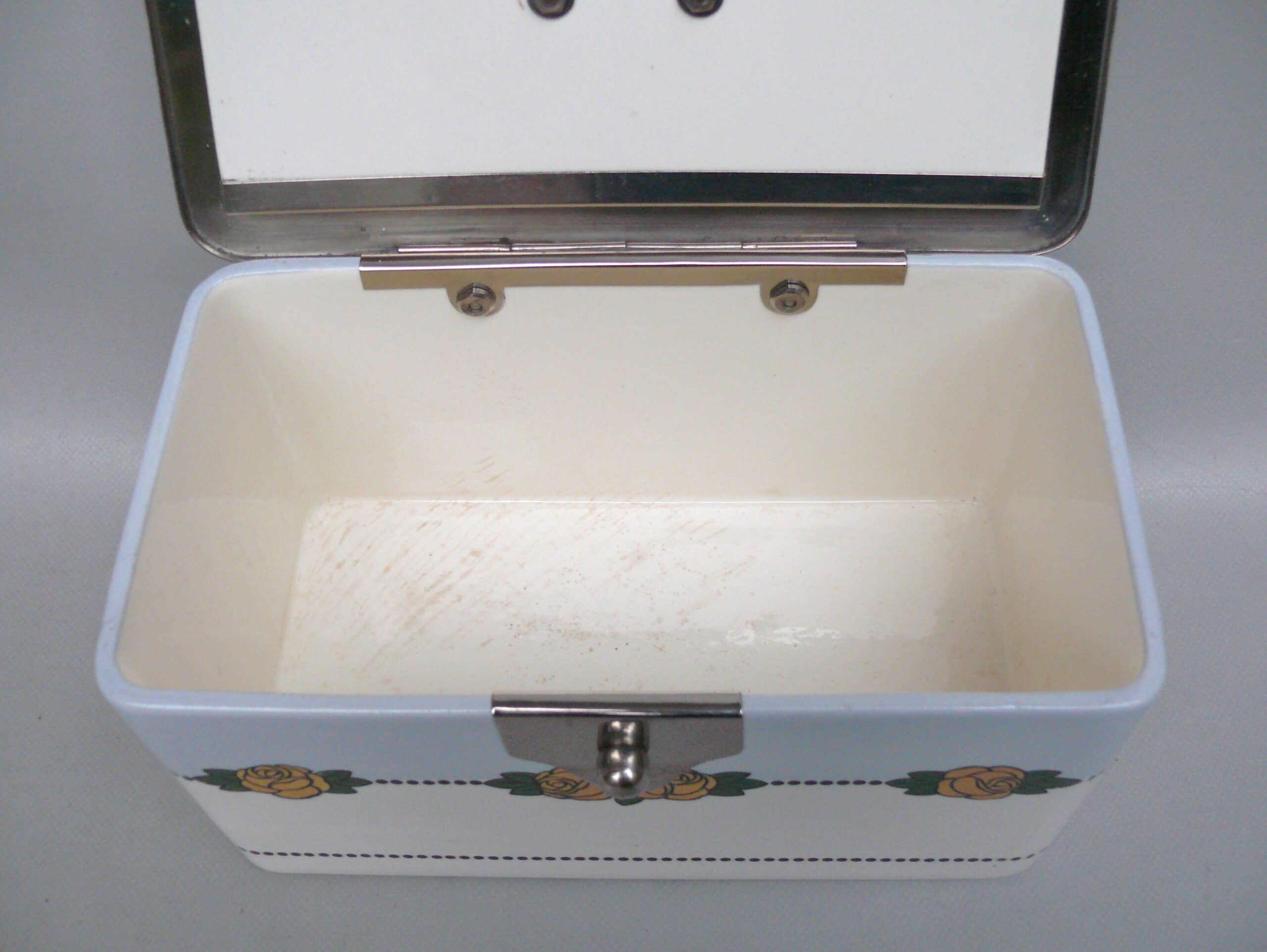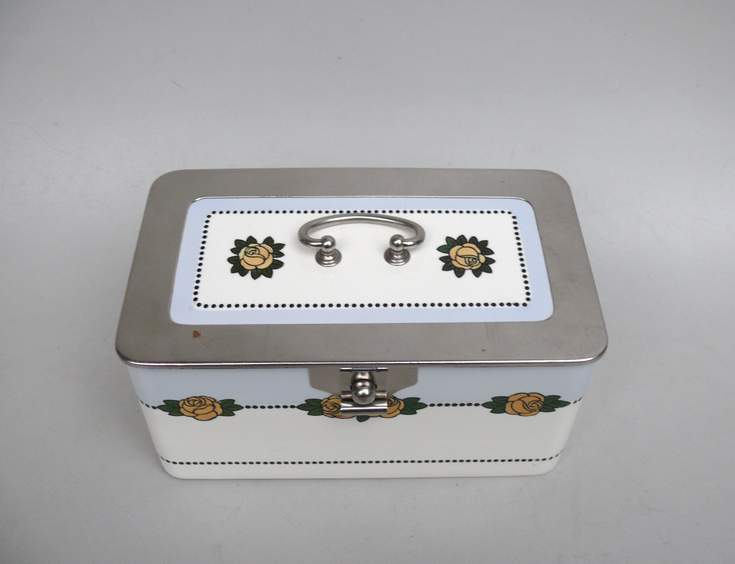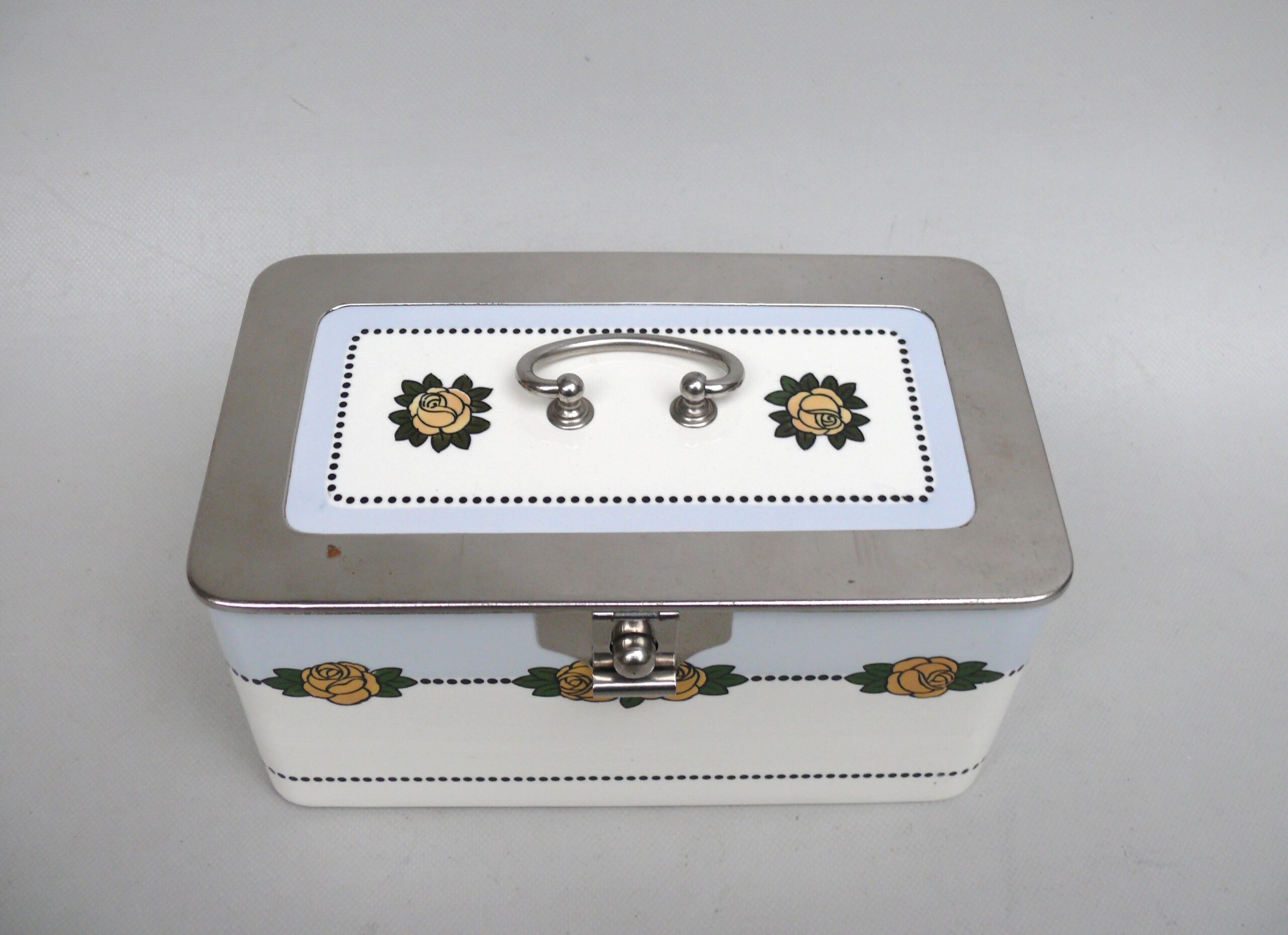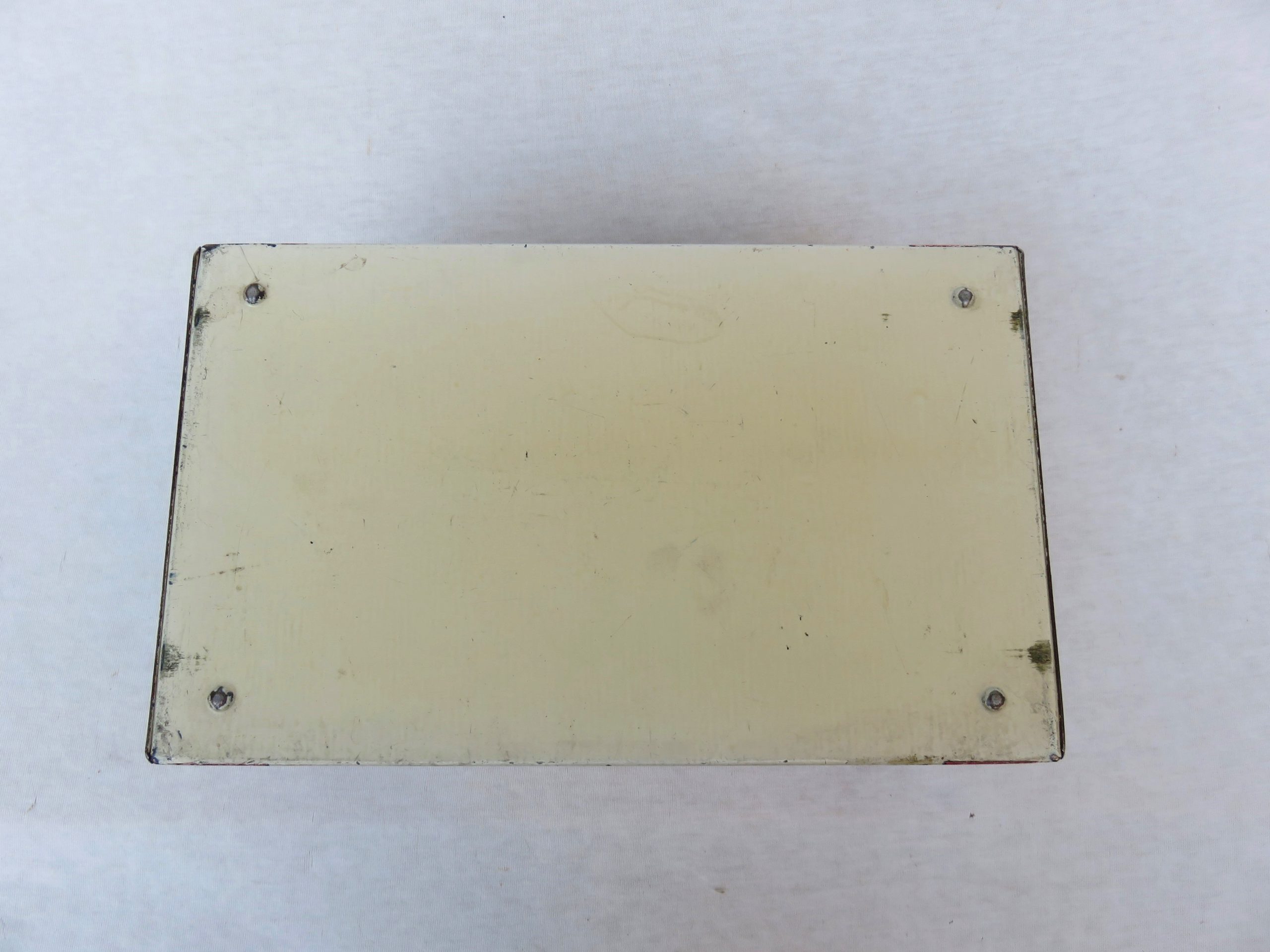 Die Dose ist in einem sehr schönen Zustand ohne Beschädigungen. Die Verchromung der Metallmontur ist sehr gut erhalten.