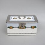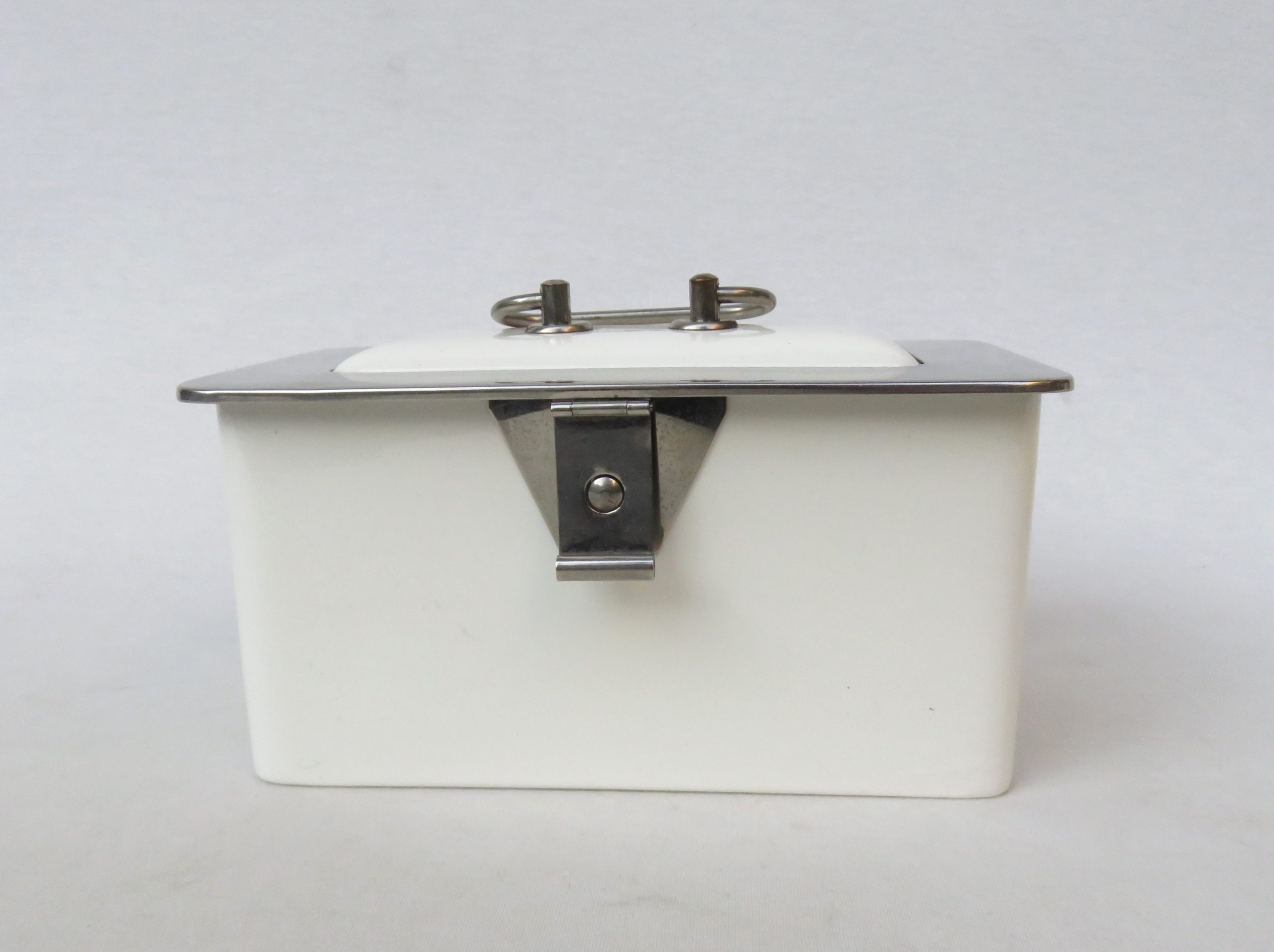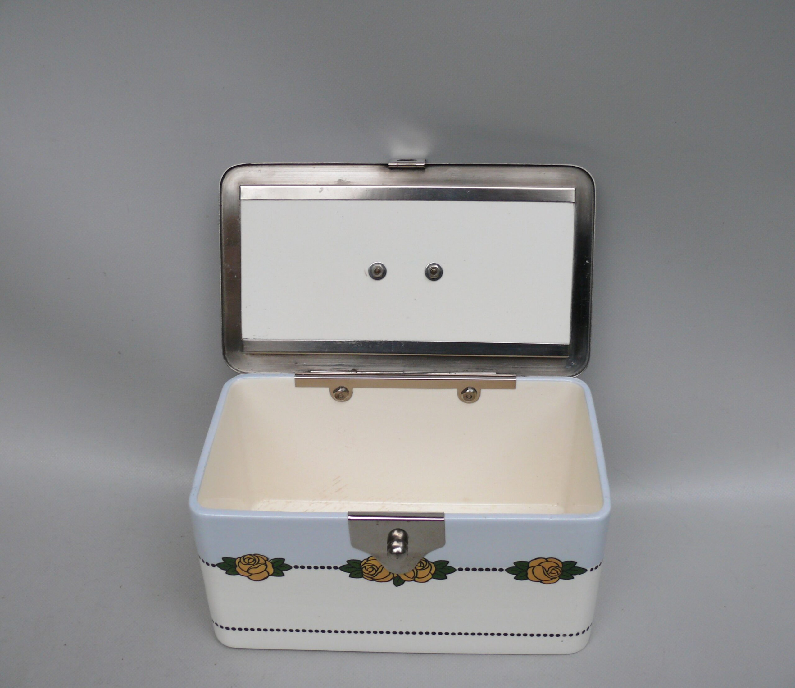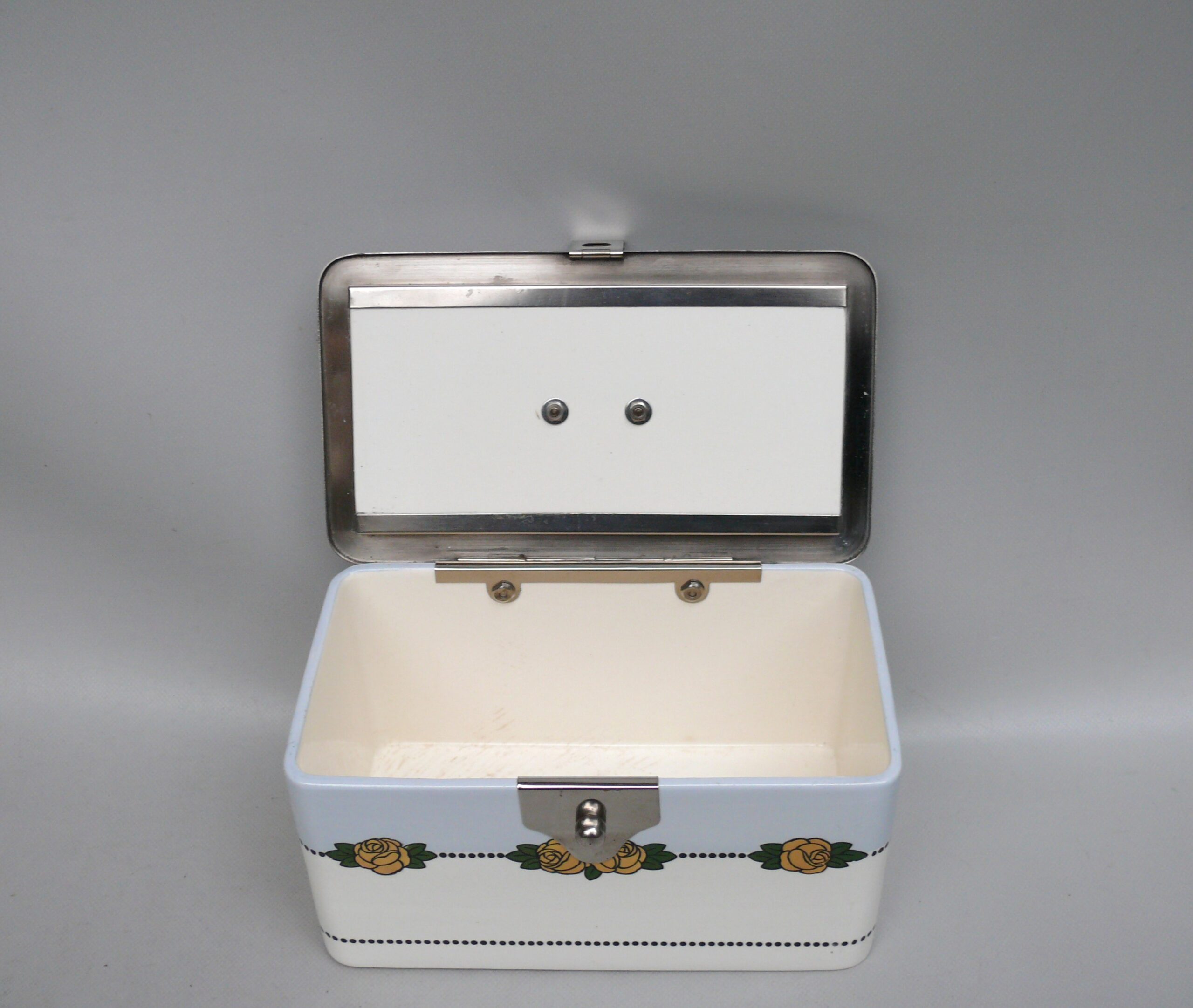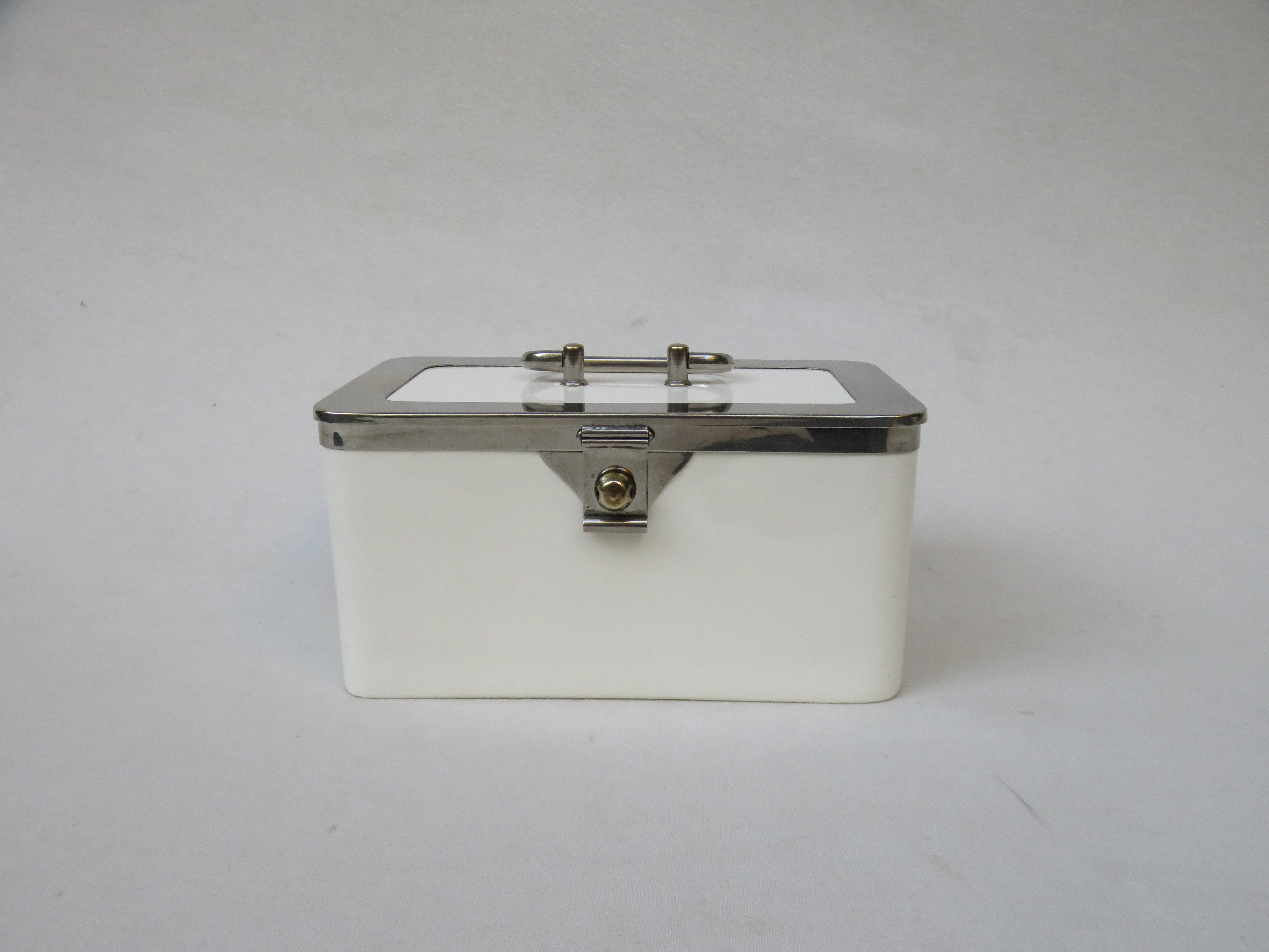 Die Dose ist in einem sehr schönen Zustand ohne Beschädigungen. Die Verchromung der Metallmontur ist sehr gut erhalten.