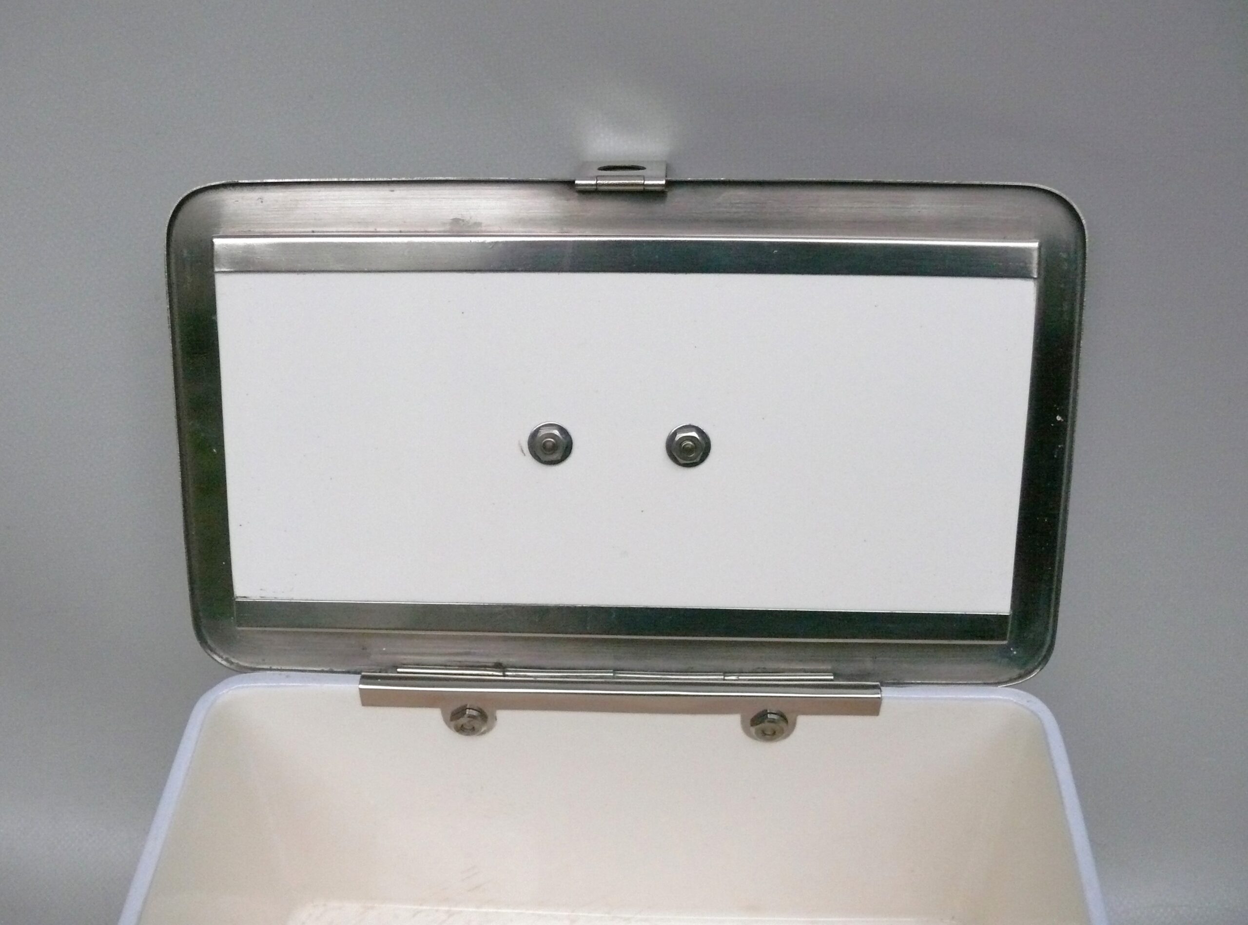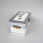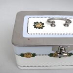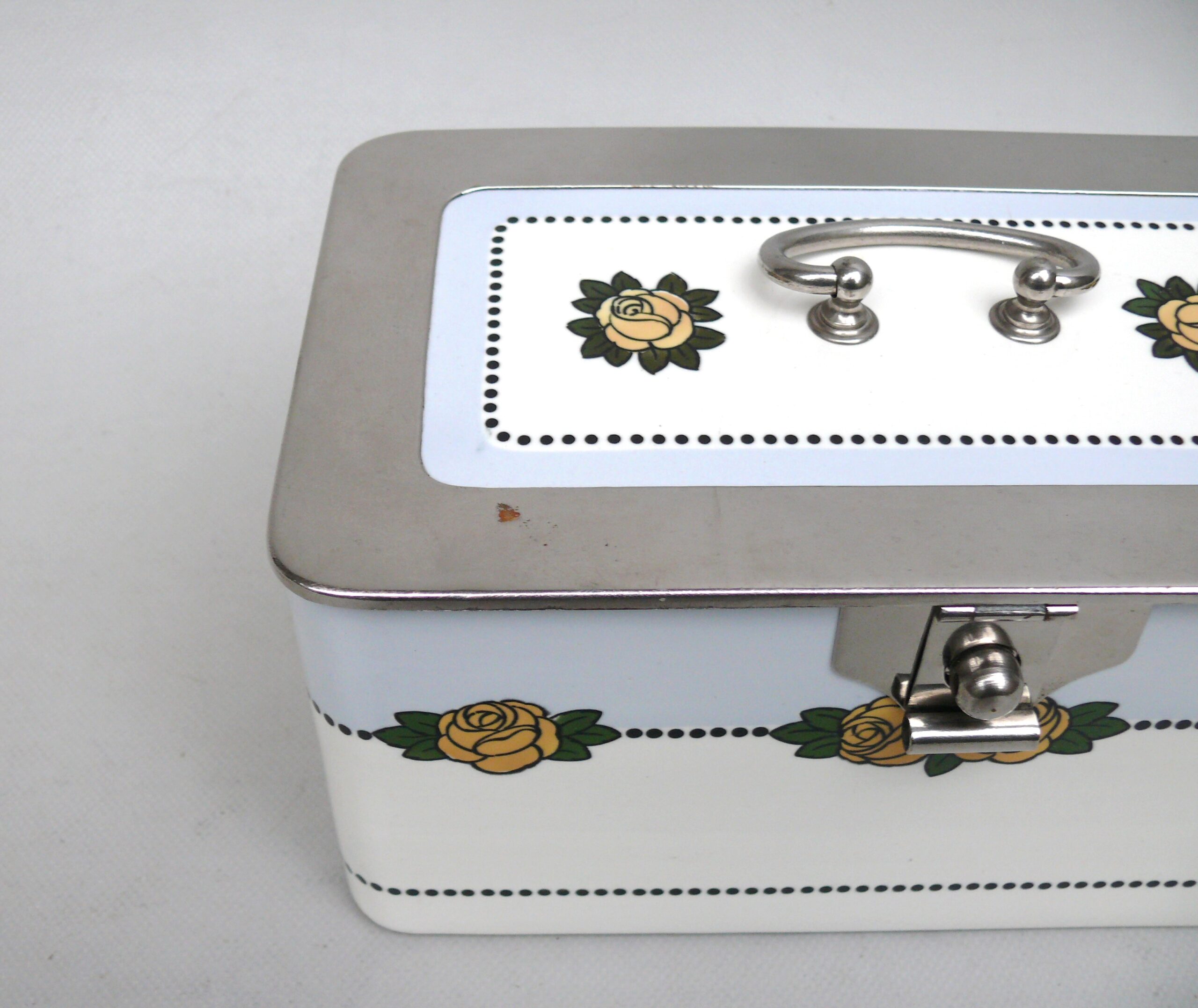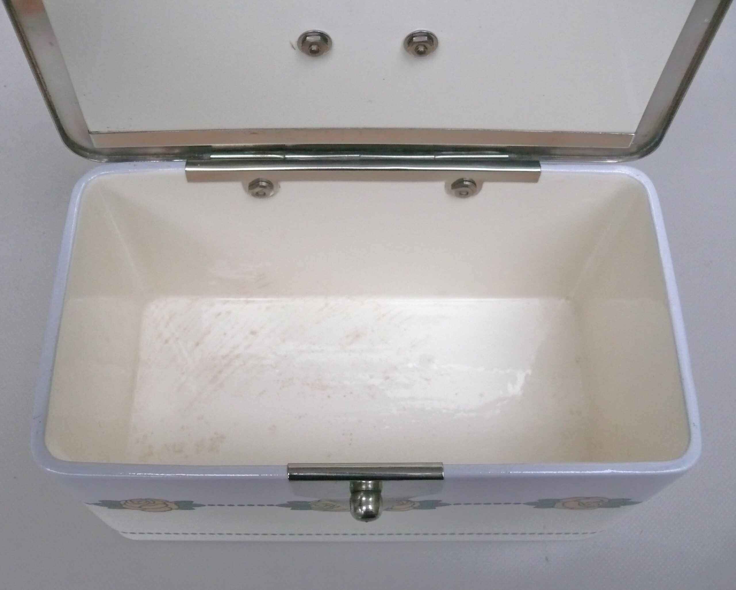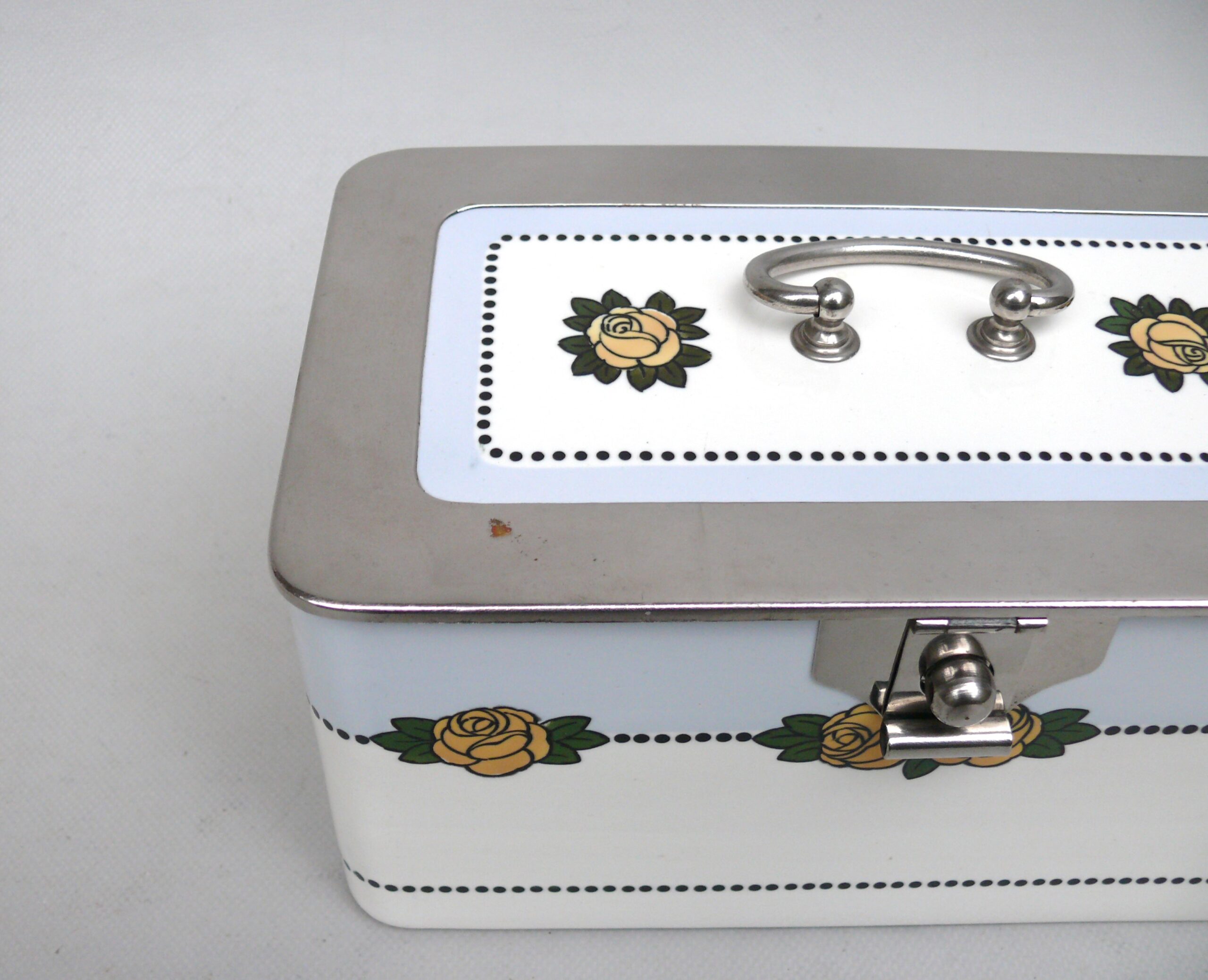Die Dose ist in einem sehr schönen Zustand ohne Beschädigungen. Die Verchromung der Metallmontur ist sehr gut erhalten.