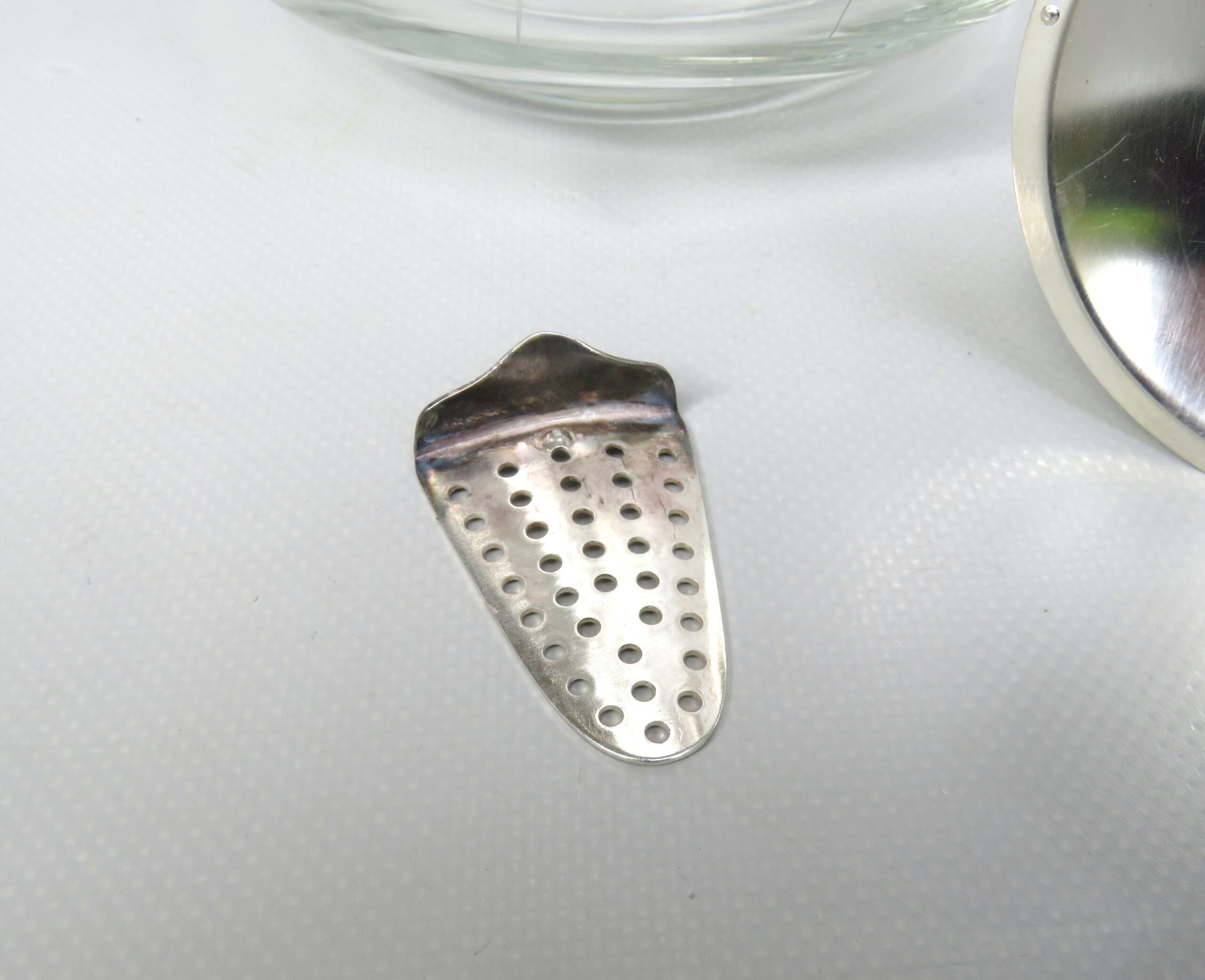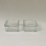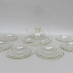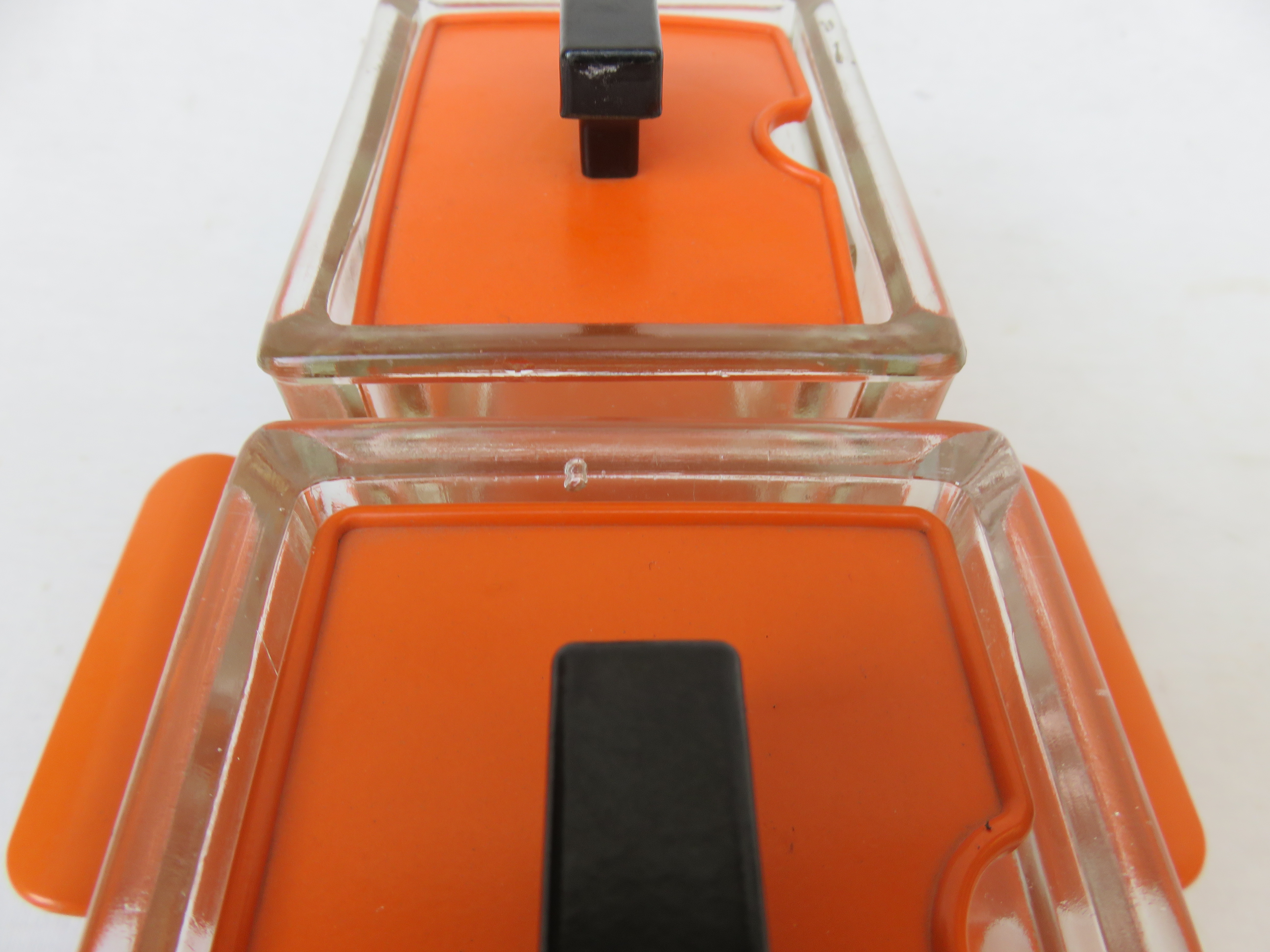 Die Glasschalen sind aus Preßglas, bezeichnet mit PONCET. Hier sind wie bei Preßglas üblich, was auch den Charme dieser Stücke ausmacht, teils Luftblasen eingeschlossen.Bei dem Hersteller handelt es sich um die Firma „von Poncet“ Glashüttenwerke AG Friedrichshain, Berlin.Die Gläser sind jeweils zweigeteilt, ein großes und ein kleines Fach.Die Deckel und Tabletts sind aus orangem und schwarzem Bakelit.Die Deckel haben Aussparungen für die Löffel.Es ist noch ein Ersatzdeckel vorhanden.