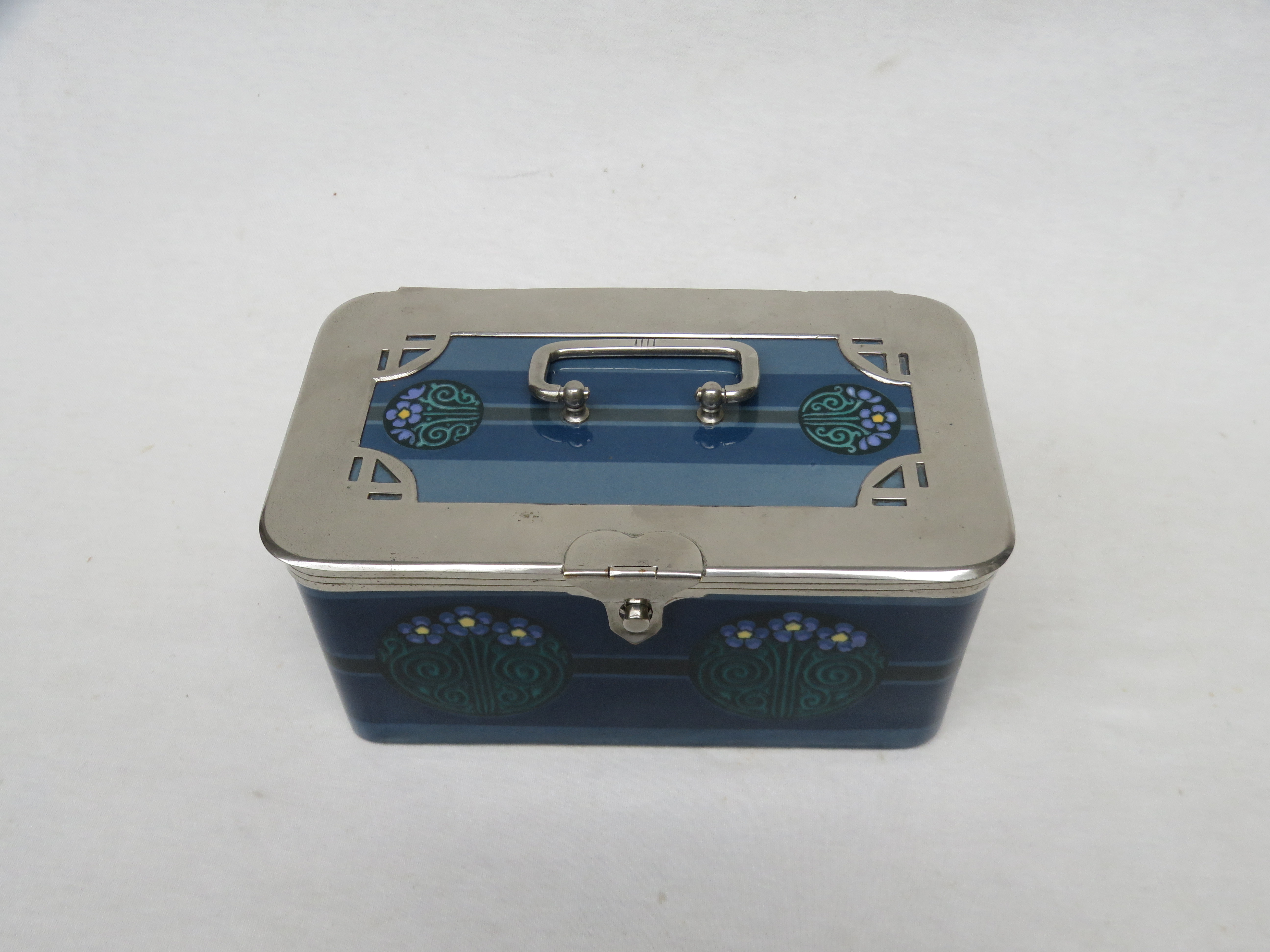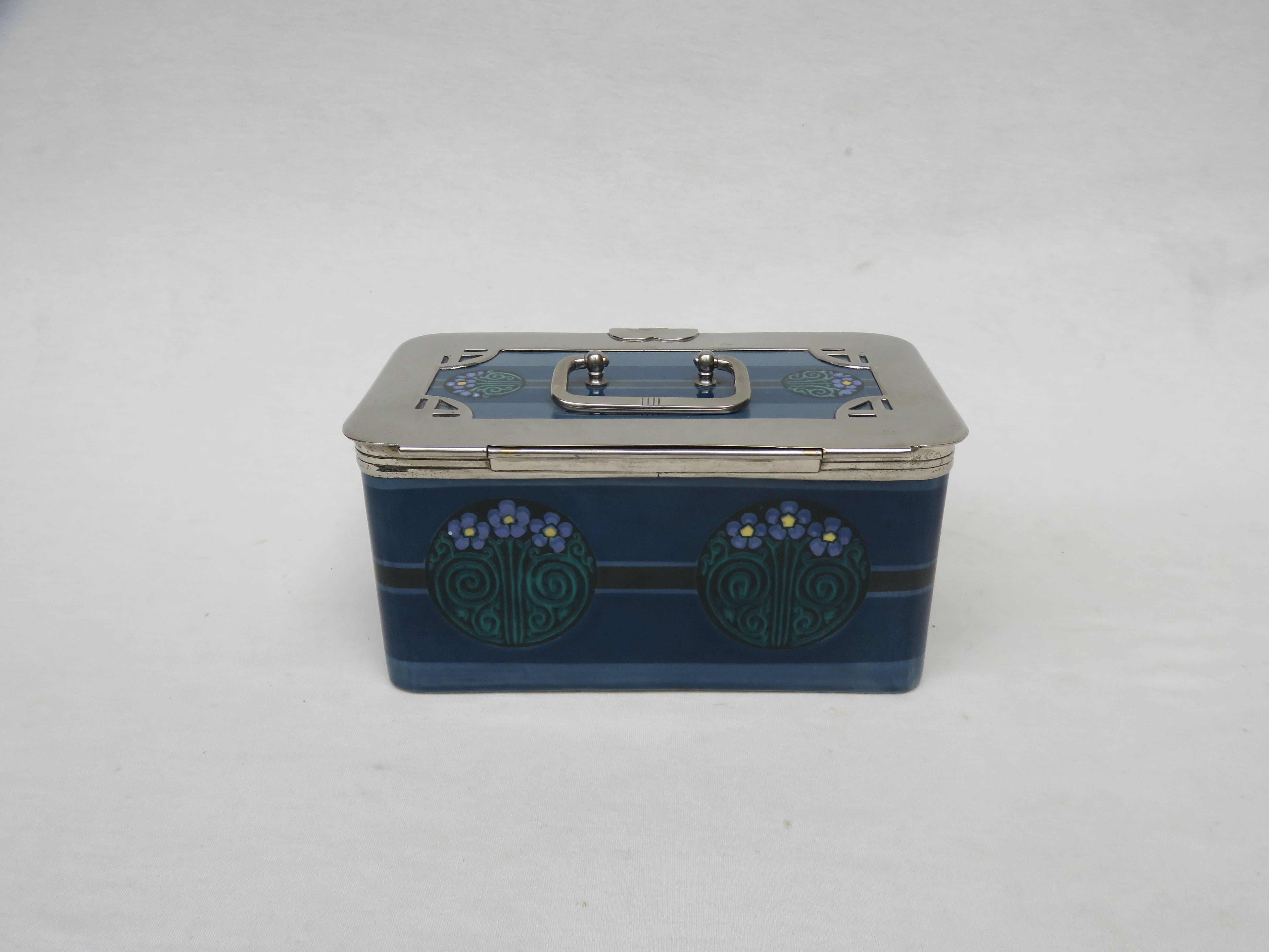 Schöne kleine Gebäckdose mit einem typischen Jugendstil-Dekor.Die Keramik ist in einem sehr schönen Zustand, lediglich die Vernickelung ist stärker berieben.