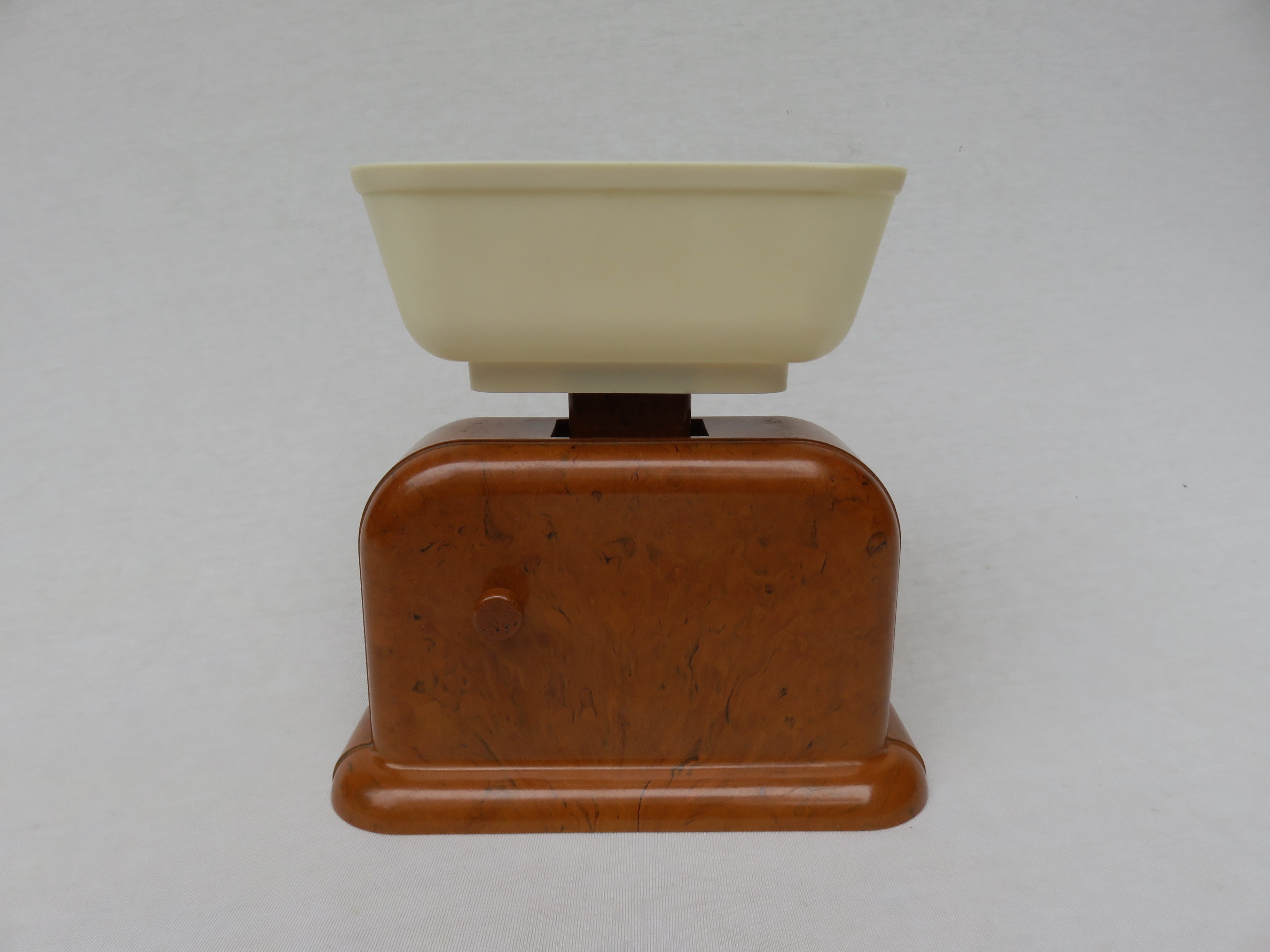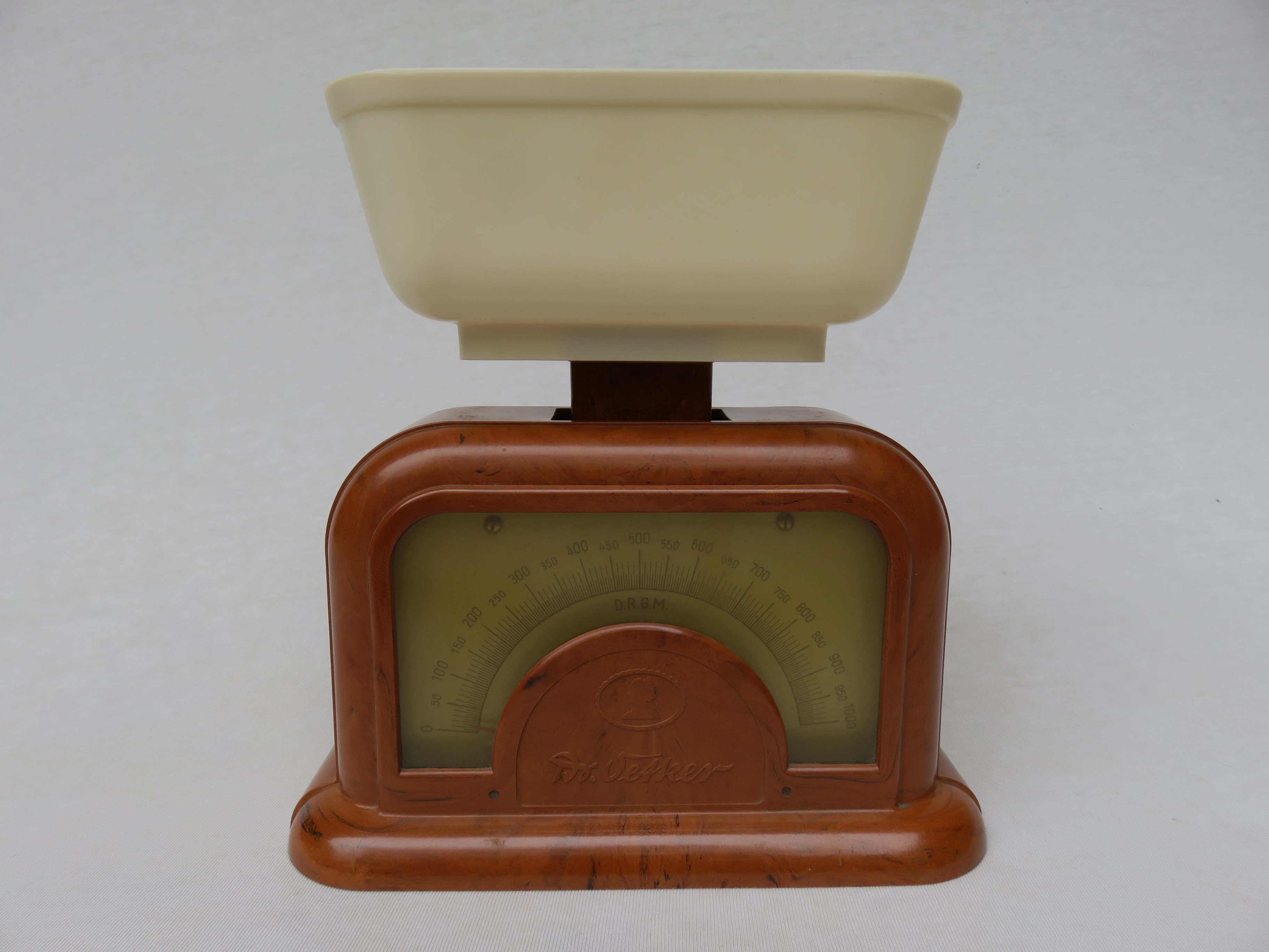K92 – Waage, 30er Jahre, bez. Dr. Oetker D.R.G.M, bis 1.000 g, Bakelit, Celluloid