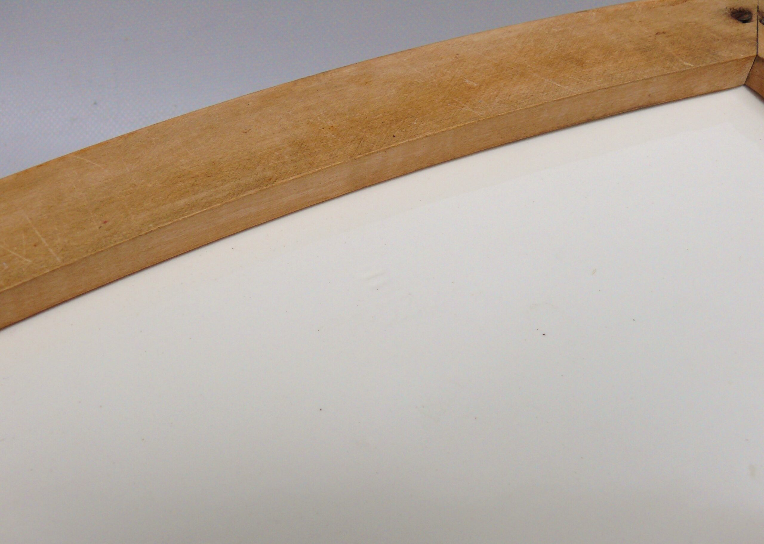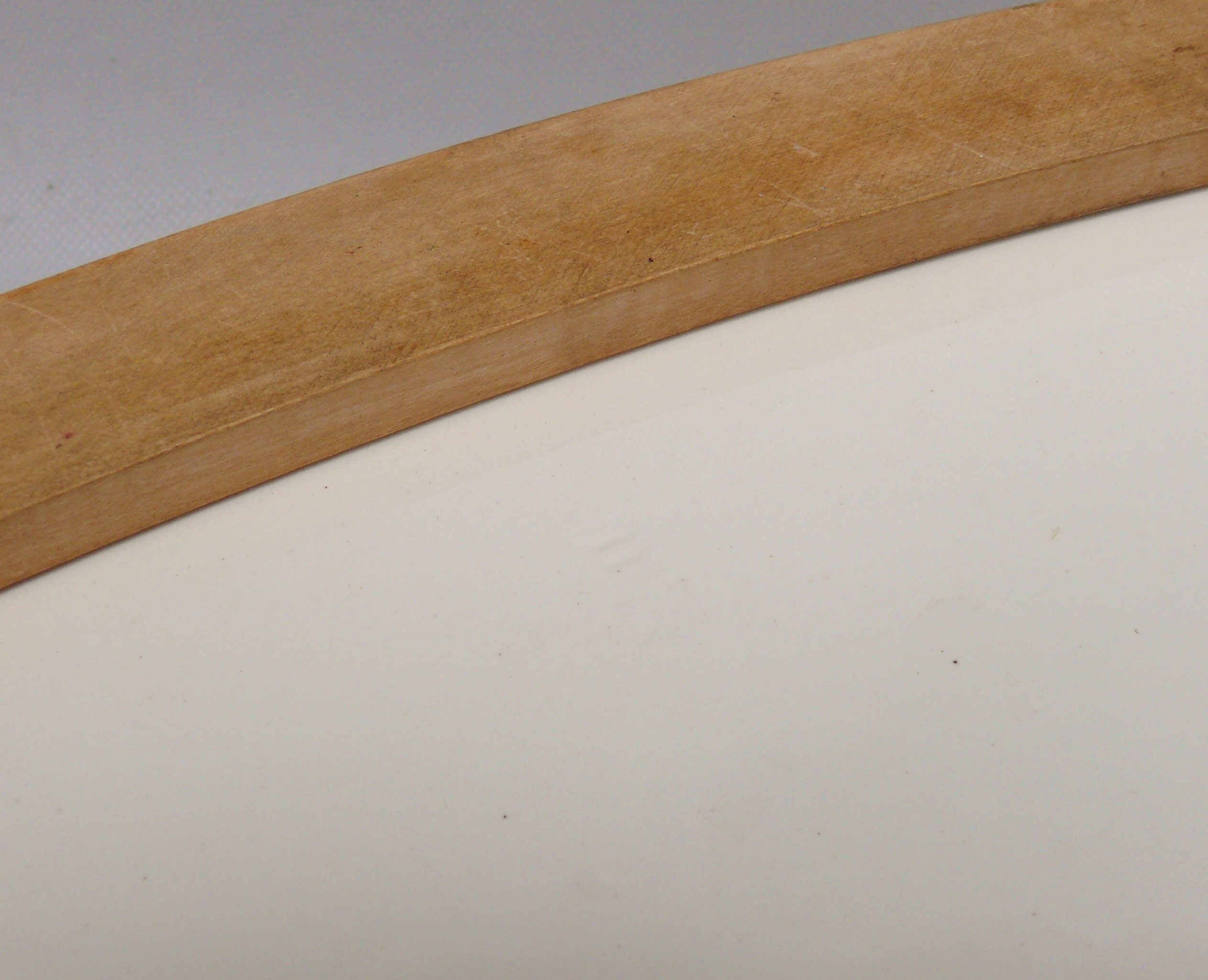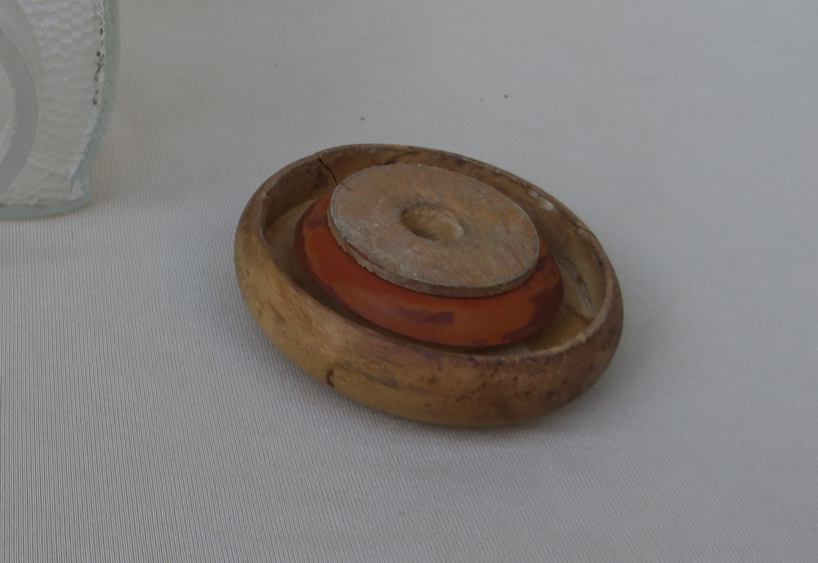 In der Schale sind Roststellen und leichte Dellen vorhanden. Die Schale wurde aufgearbeitet: poliert und eingeölt (lebensmittelecht).