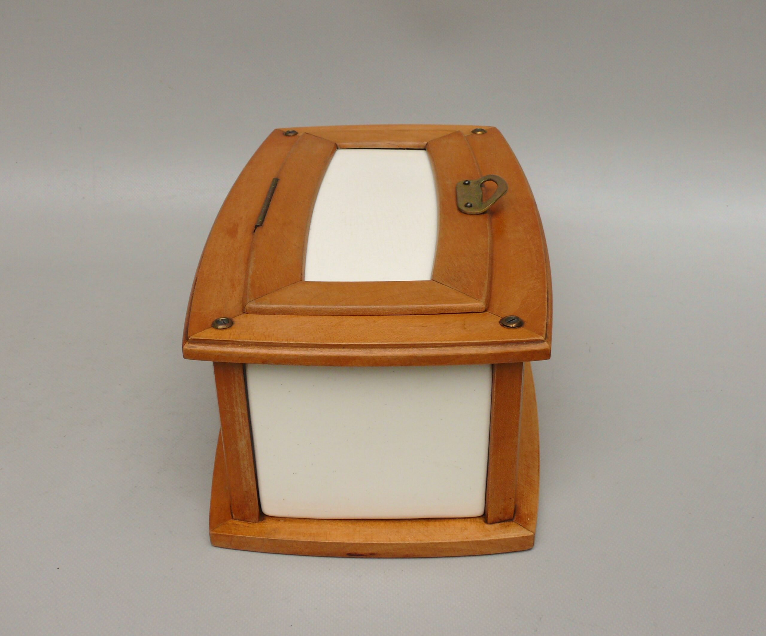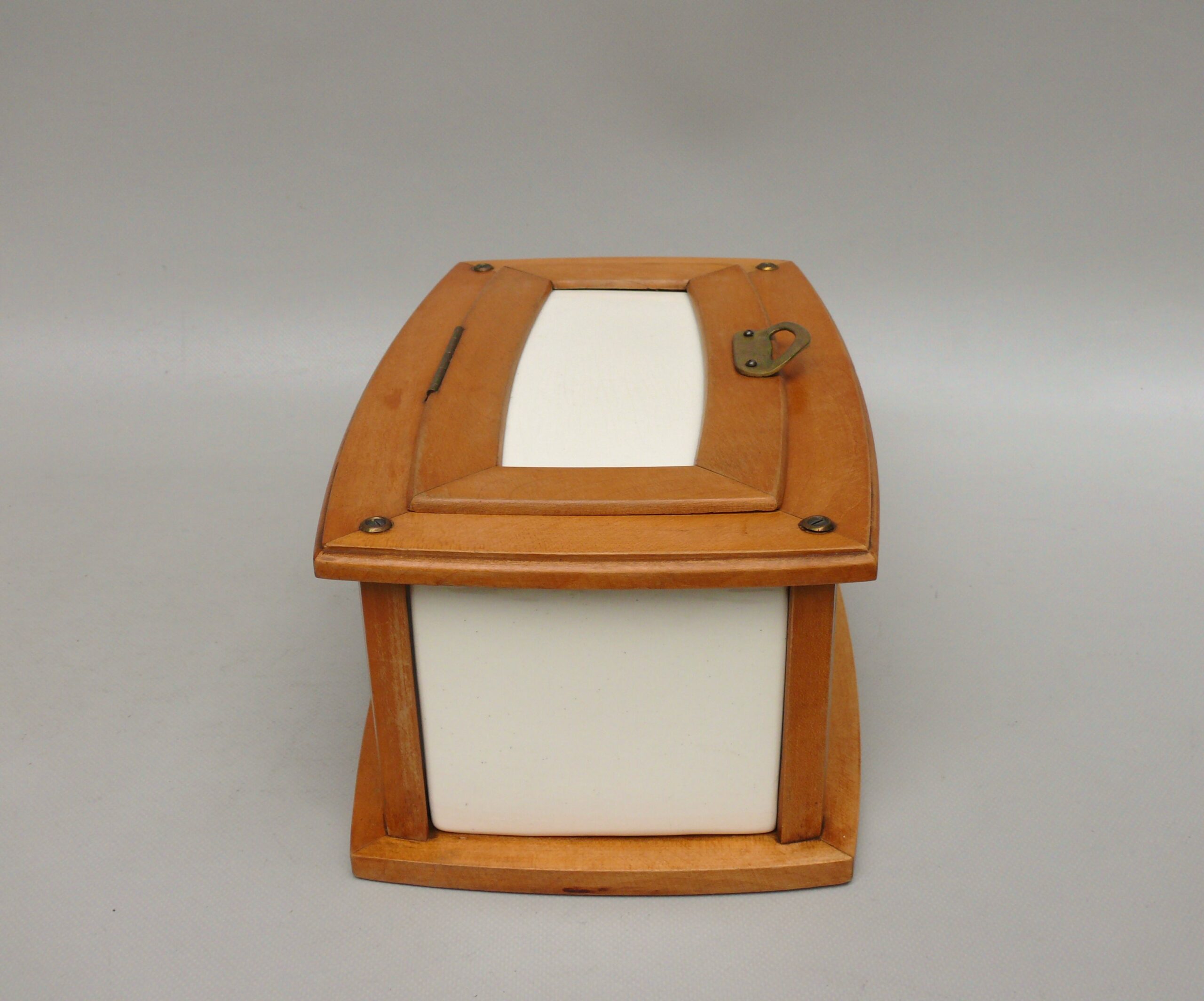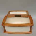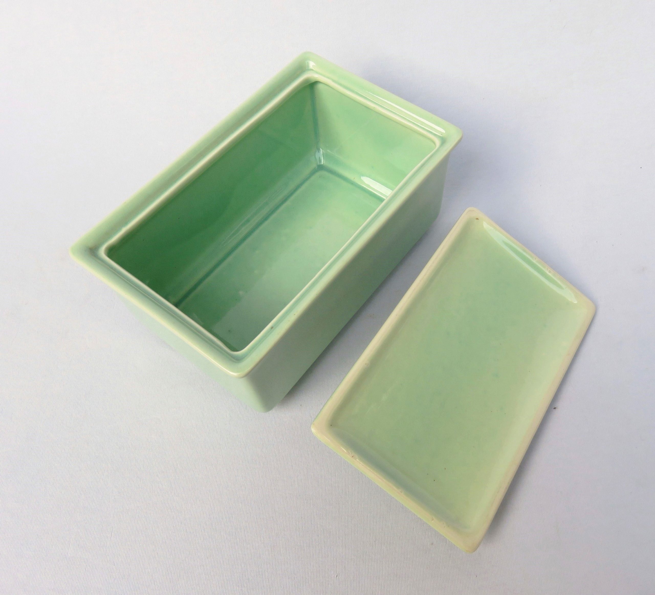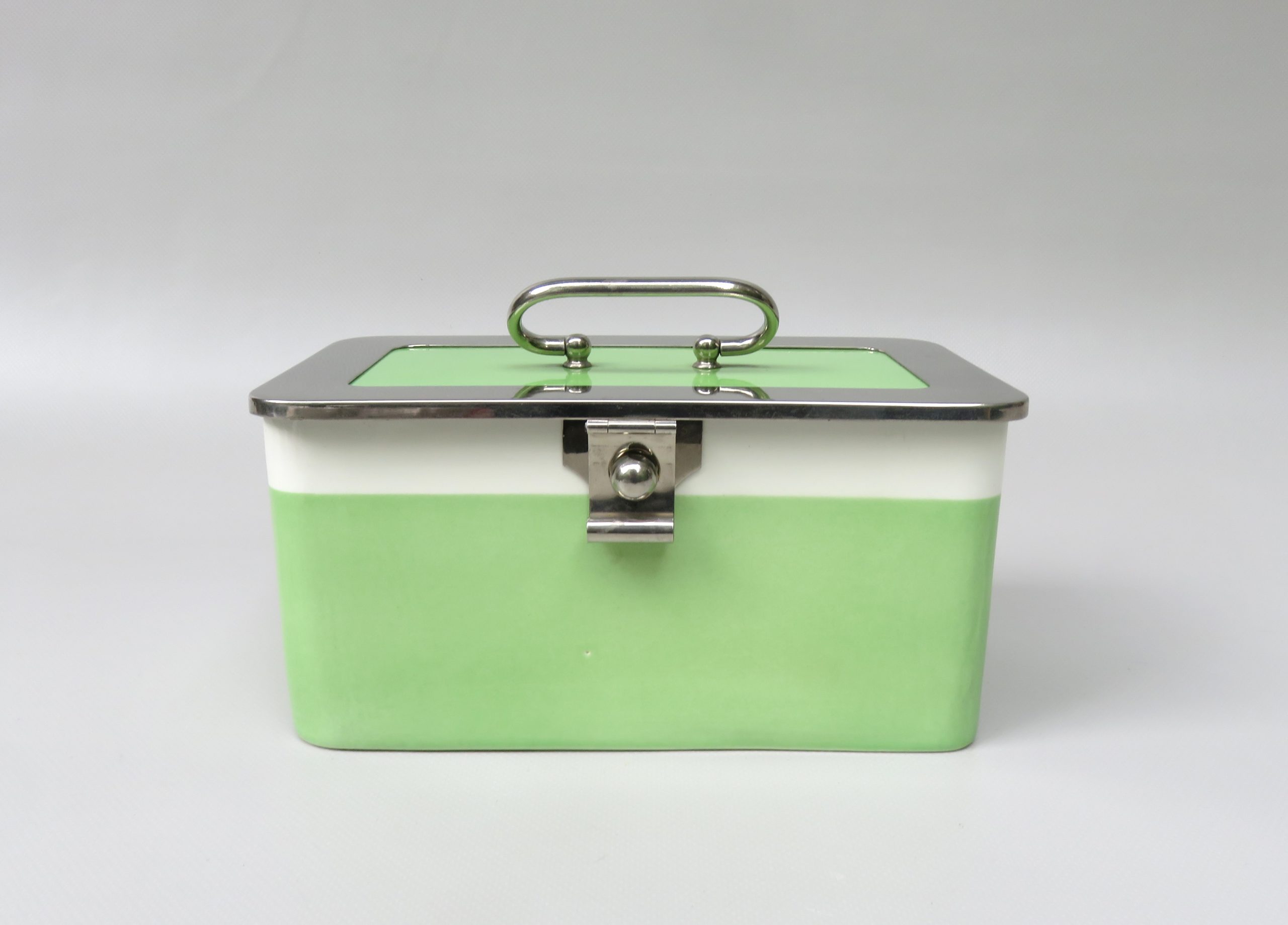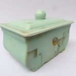 K14 – Gebäckdose, Jugendstil, hellgrüne Keramik, Griff Holz/Bakelit, bez. BMF – B722