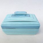 K15 – Gebäckdose, Art Deco, beige Keramik mit strengem Dekor in hellblau und grün