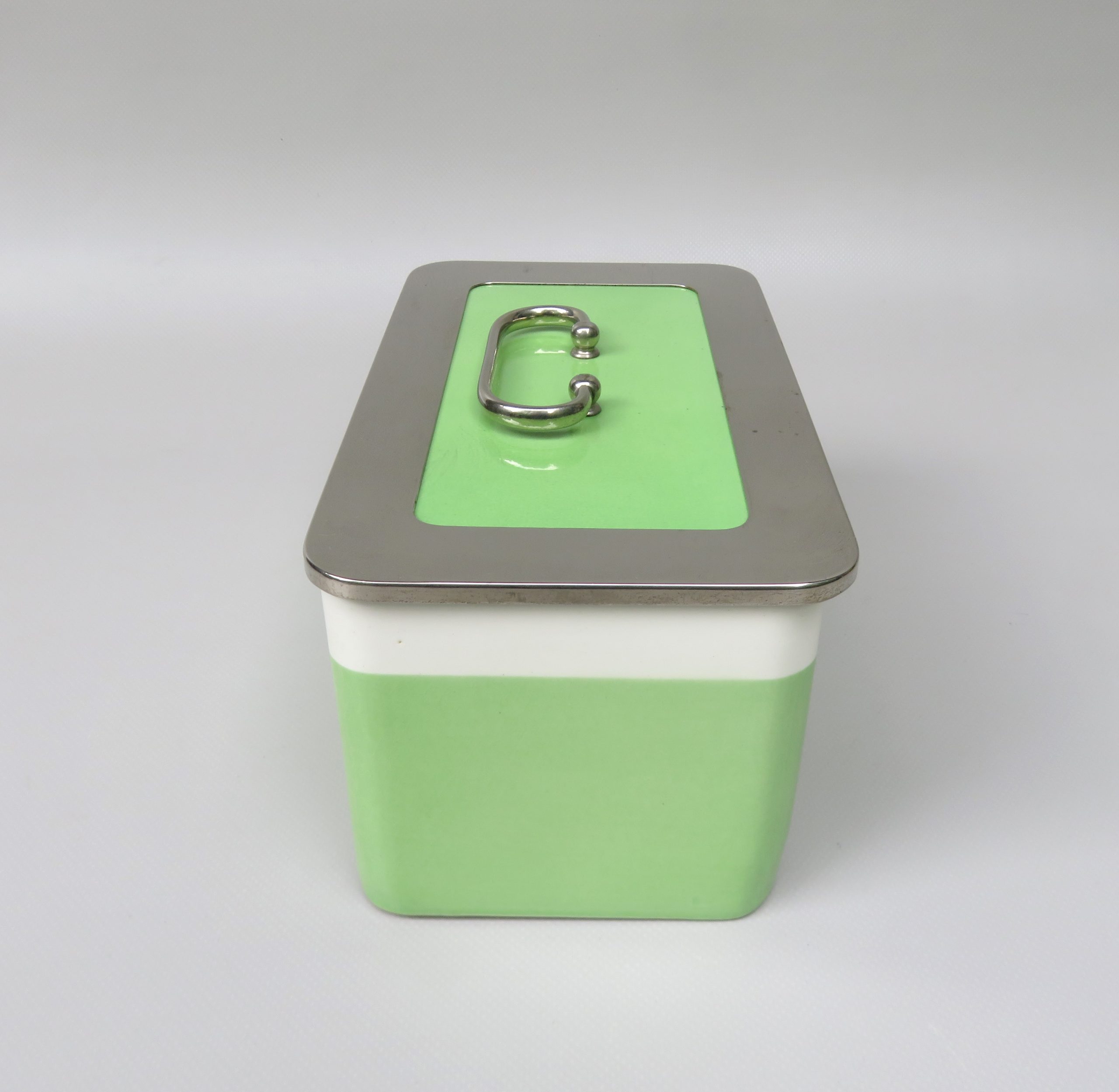 Eine formschöne Gebäckdose, Keksdose oder Konfektdose aus der Zeit des Art Deco aus Keramik mit einer vernickelten Montur.