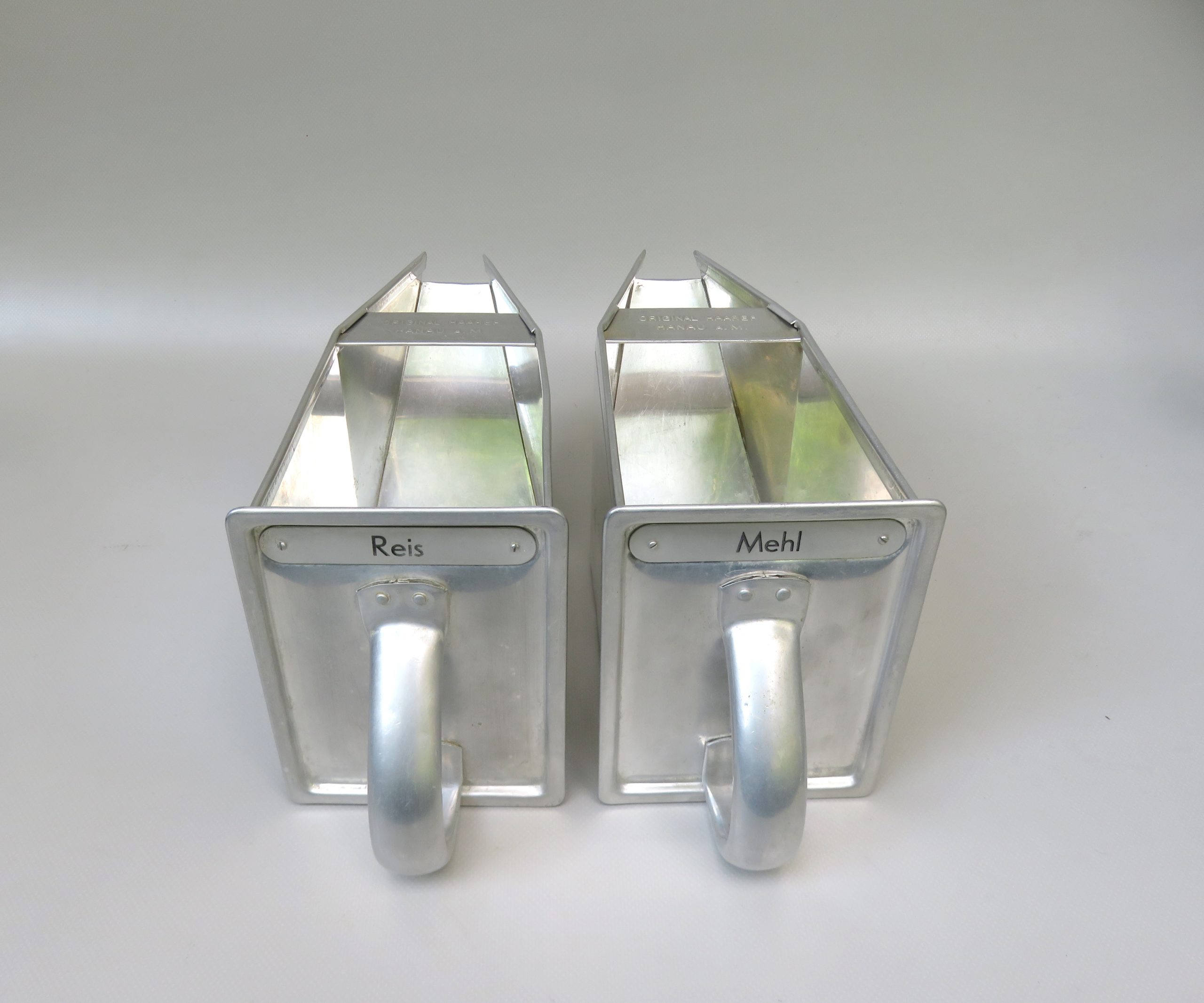 K2 – 2 Aluminiumschütten für die Frankfurter Küche, Entwurf Margarete Schütte-Lihotzky, bez. Original Haarer Hanau Frankfurt a. M.