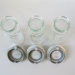 Die Deckel sind altersbedingt teilweise etwas gewölbt, sitzen aber gut auf den Gläsern. Es ist noch ein Ersatzdeckel vorhanden.