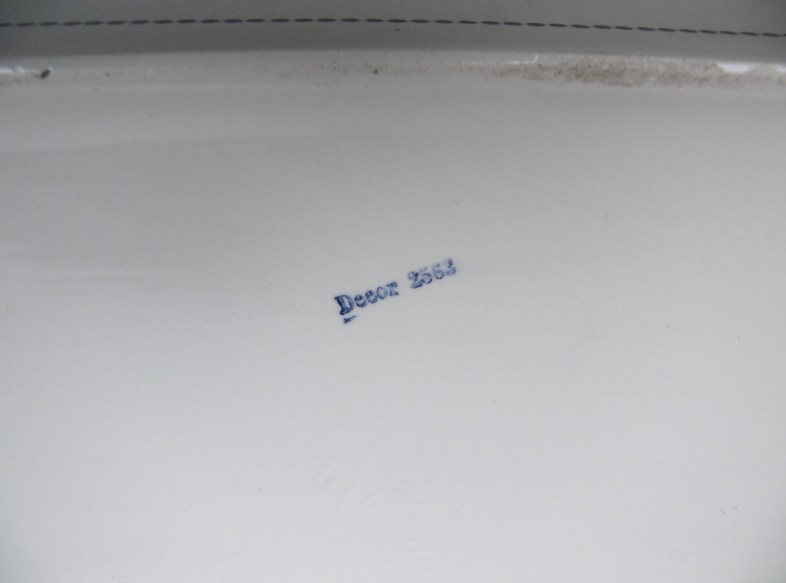 Das Dekor – Rosen – ist in dunkelrosa, grün und schwarz auf weißem Grund gehalten, rechteckige Grundform mit abgerundeten Ecken.