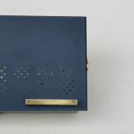 Sie hat quadratische Grundform mit abgeschrägten Ecken (8eckig) und einen getreppten Aufbau, in dem sich die 8eckige Form verjüngt und farbliche mit Blau abgesetzt ist. Das Leuchtmittel ist schräg angesetzt. Der Kabelaustritt befindet sich oben.