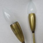 Die Tüllen sind verkupfert – eine weist stärkere Gebrauchsspuren auf, siehe Fotos. Arme und Wandhalterung Kupfer, Zierelemente bernsteinfarbenes Bakelit.